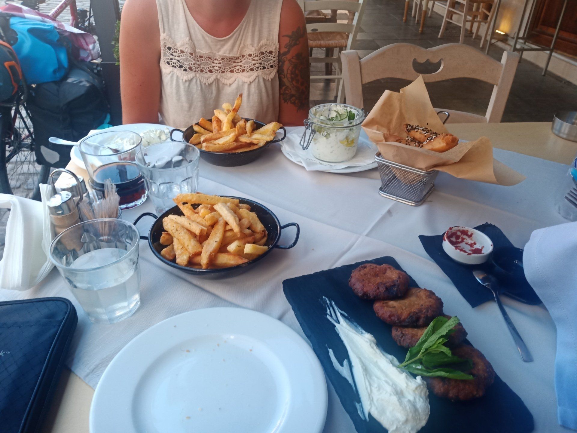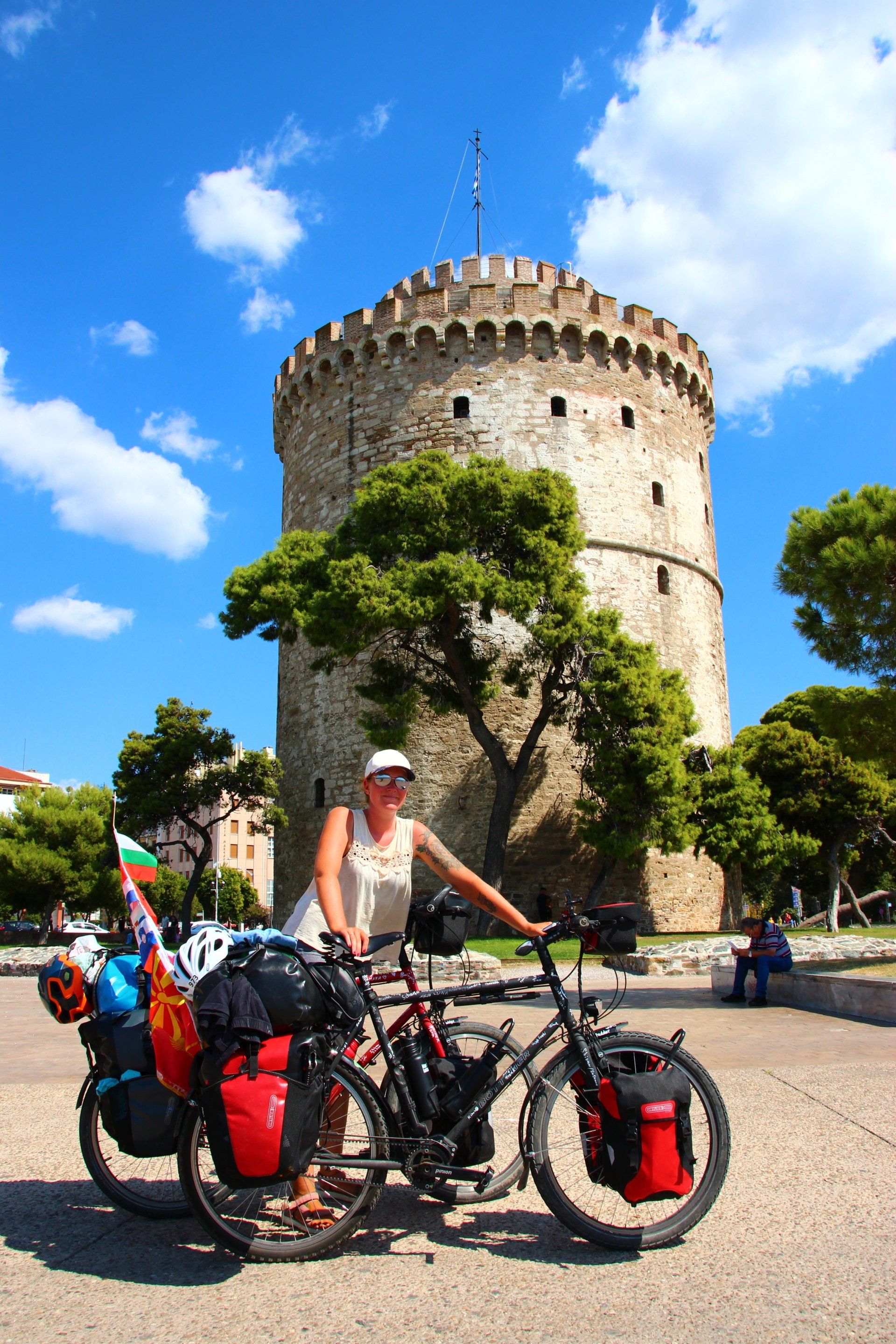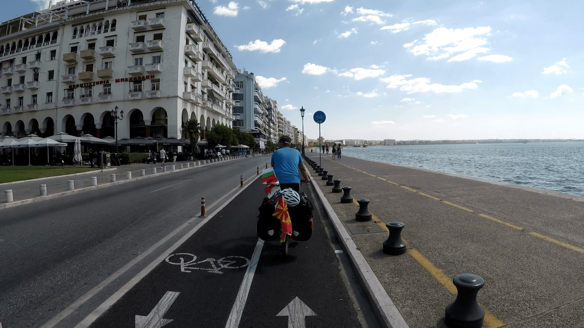 „So, jetzt habe ich aber Hunger“ sagt Basti zu mir uns reibt sich dabei den Bauch. Wir suchen uns einen Tisch in einem hübschen Restaurant aus. Die Räder stellen wir direkt neben den Tisch an einen Pfeiler. Währenddessen kommt auch schon der Kellner. Er begrüßt uns, reicht uns die Menükarte und deckt den Tisch. Als erstes machen wir uns über die kalte Flasche Wasser her, die er uns auf den Tisch stellt. In Griechenland ist es üblich, dass man eine kalte Flasche Wasser und Brot im Restaurant gereicht bekommt. Diese muss man auch nur zahlen, wenn man sie trinkt bzw. isst. Wir bestellen uns etwas und genießen das gute Essen. Während wir essen, bekommen wir eine Whatsapp Nachricht von Bastis Oma. „Meine Oma hat geschrieben. Sie schreibt, dass der Opa hinter Thessaloniki ist und das er uns mitnehmen könnte. Aber das er auch erst frühestens gegen 16Uhr durch Thessaloniki kommt. Ich schreibe ihr das dass zwar sehr nett ist, aber das wir die Strecke selber fahren wollen. Außerdem haben wir erst 13:30Uhr“ erzählt er mir. „Ok. Mach das“ antworte ich ihm. „Oma fragt, ob der Opa wenigstens unsere Taschen mitnehmen soll. Ich habe ihr jetzt geschrieben, dass das ja geschummelt wäre. Außerdem fragt sie, ob wir heute oder morgen ankommen und das unser Bett schon fertig ist. Ich sag mal so, es sind noch knapp 50Km bis Flogita und es ist noch recht früh. Ich schreibe ihr das wir uns später noch mal melden, ob wir es heute schaffen oder nicht“ sagt Basti zu mir. Oh je. Noch weitere 50Km heute? Wir haben doch schon über 50Km hinter uns. „Ich weiß nicht ob ich das schaffe“ antworte ich ihm. Wir besprechen unserer weiteres Vorgehen während des Essens. Wir einigen uns drauf, dass wir mal gucken wie weit wir kommen. Nach dem Essen schwingen wir uns wieder auf die Räder und fahren an der Strandpromenade entlang. Hier machen wir auch noch einen kleinen Boxenstopp an dem Wahrzeichen von Thessaloniki. Dem Weißen Turm. Außerdem läuft Basti noch kurz zu einem kleinen Souvenirshop und kauft eine kleine griechische Fahne für sein Fahrrad. Wir suchen uns ein schattiges Plätzchen unter einem Baum und Basti fängt an die neue Fahne an den Fahnenmast zu nähen. Nach wenigen Minuten ist er auch schon fertig und wir fahren weiter.