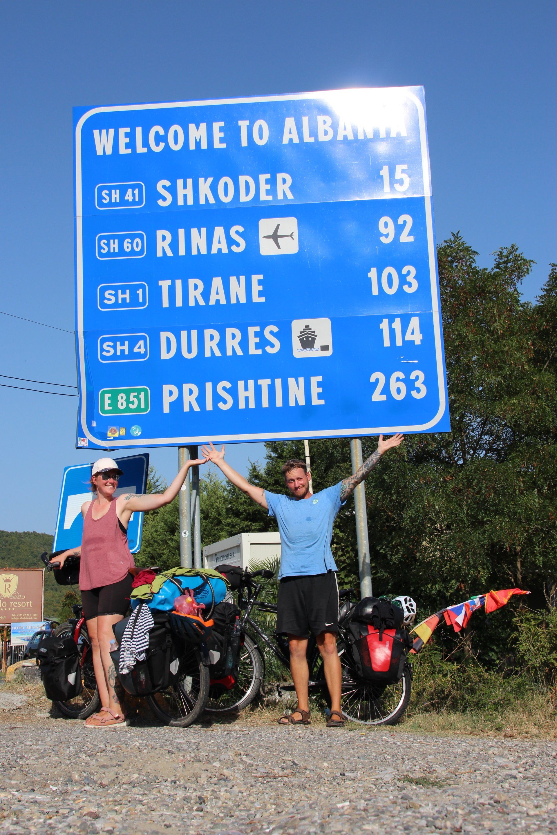 Kurz nachdem wir Bar verlassen haben, geht es erst einmal wieder bergauf. Auf Nebenstraßen fahren wir durch mehrere kleine Ortschaften. Auch der Verkehr hat stark nachgelassen. Schön wenn nicht die ganze Zeit gehupt wird. Ein letztes Mal werfen wir noch einen Blick auf das Mittelmeer, bevor wir komplett in die Bergen verschwinden. Das nächste Mal werden wir es erst wieder in Griechenland zu Gesicht bekommen. Links und rechts der Straße sind überall verbrannte Bäume und Sträucher. „Sie mal, hier muss es vor kurzem großflächig gebrannt haben“ sagt Basti zu mir und zeigt auf die verbrannten Bäume und die Asche die überall auf dem Boden liegt. Nach einer Weile geht es wieder bergab. Was uns gleich auffällt, dass Aussehen der Leute hat sich leicht verändert. Ebenso das Aussehen der kleinen Ortschaften. Kirchen sind Moscheen gewichen und es sind vermehrt albanische Kennzeichen anzutreffen. Zwischen den vielen kleinen Ortschaften sind immer wieder kleine, sehr sehr alte Friedhöfe. Auch diese unterscheiden sich von den uns bekannten Friedhöfe, die wir auf unserer bisherigen Reise gesehen haben. Als wir kurz vor der Grenze zu Albanien ankommen, kommen uns die ersten Geldwechsler zu Fuß auf der Straße entgegen und rufen uns zu, dass wir bei ihnen den besten Wechselkurs bekommen. Wir verneinen aber freundlich und fahren weiter, worauf sie uns eine schöne Reise wünschen. An der Grenze stehen ein paar Autos für die Ausreise- bzw. Einreisekontrolle. Ok, dann warten wir kurz. Ein Grenzbeamter der Montenegriner steht außerhalb des Kontrollhäuschens. Als er uns entdeckt, kommt er mit einem freundlichen Lächeln im Gesicht auf uns zu. Er begrüßt uns und sagt zu uns „gebt mir eure Pässe und kommt mit nach vorne. Ihr müsst nicht warten“. Wir bedanken uns und folgen ihm zum Kontrollhäuschen. Wir schieben links auf dem Fußweg unsere Räder, bis auf Höhe des Sichtfensters des Häuschens, während er ins Innere verschwindet. Durch das Fenster können wir sehen, wie er kurz unsere Pässe prüft und sie dann an eine Frau in albanischer Polizeiuniform weiterreicht. Sie winkt uns zu, dass wir weiter zum nächsten Fenster kommen sollen. Also schieben wir unsere Räder zum nächsten Fenster. Dort sehen wir wie die Frau ebenfalls kurz unsere Pässe prüft. Keine Minute später öffnet sie das Fenster und überreicht uns unsere Pässe zurück, mit den Worten „Viel Spaß in Albanien“. Wir bedanken uns und schieben unsere Räder aus dem Kontrollbereich. „Wow, dass ging ja schnell und einfach“ sagt Basti zu mir, während er unsere Pässe wieder verstaut. „Ja. Das war aber freundlich von den beiden, dass sie uns vorziehen“ antworte ich ihm. „Fahrradbonus“ sagt er grinsend zu mir. „Da vorne ist ein Willkommen in Albanien Schild. Sollen wir ein Foto machen?“ frage ich ihn und zeige auf das Schild. „Klaro“ erwidert er. Nun sind wir also in Albanien. Land Nummer 9.