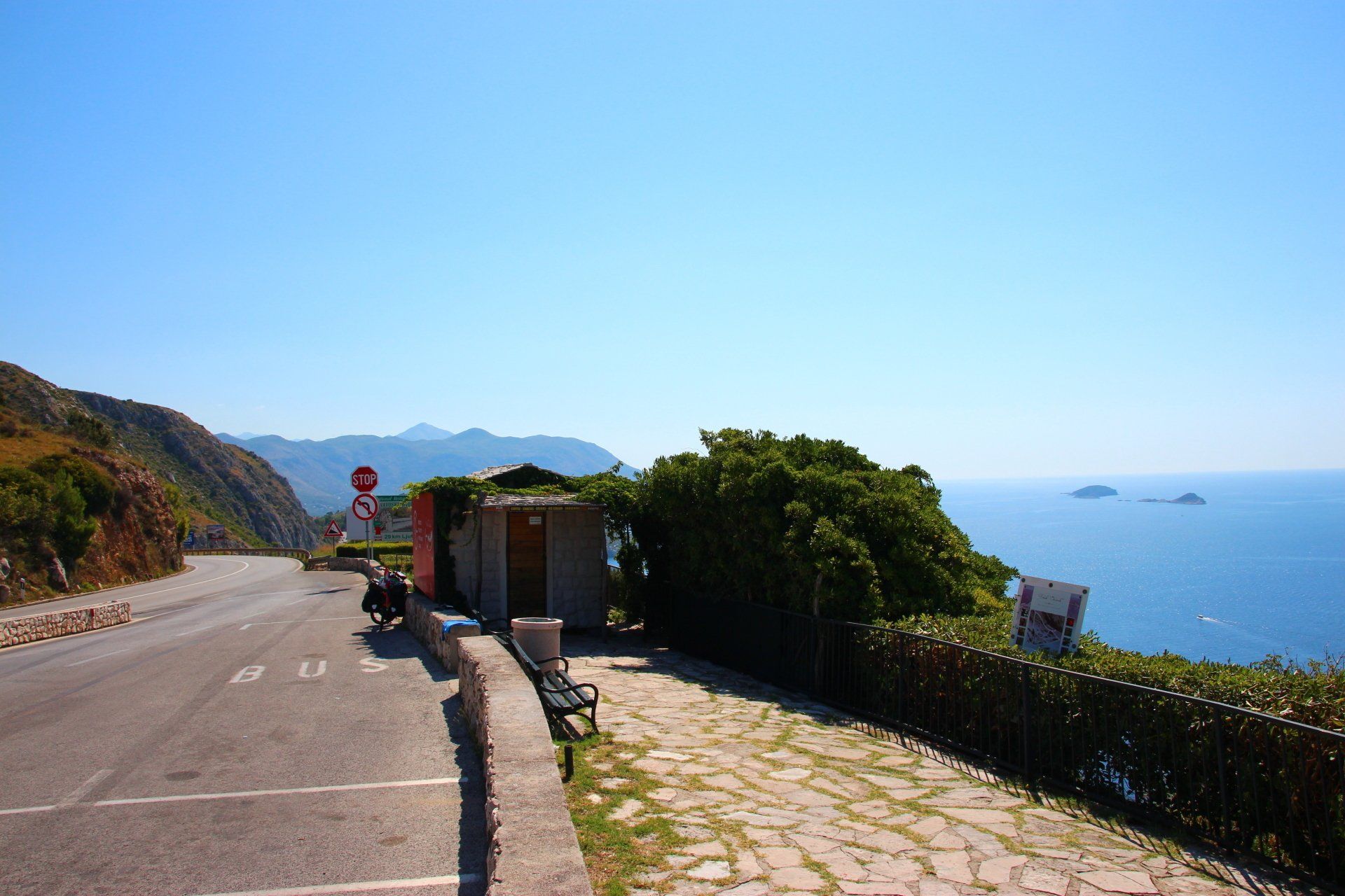 Als wir an einem kleinen und verlassen Gebäude vorbeikommen, ruft Basti mir zu „komm wir machen hier mal eine Pause“ und hält vor dem Gebäude an. Wir schieben unsere Räder an eine kleine Mauer neben dem Gebäude und stellen sie dort ab. Vor dem Gebäude ist eine kleine Terrasse, auf die wir uns setzten. Basti wirft durch die großen Schaufensterscheiben, die die Front des Gebäudes zieren, einen Blick ins Innere. „Scheint wohl mal ein kleines Geschäft gewesen zu sein. Überall stehen leere Regale rum“. Während wir vor dem Geschäft sitzen und eine Kleinigkeit essen und trinken, kommen drei junge Männer die Straße zu Fuß entlang Richtung kroatische Grenze. Jeder von ihnen hat einen kleinen Rucksack auf. Als sie auf unserer Höhe sind, rufen sie uns „Hello“ zu und gehen weiter. Wir antworten ihnen ebenfalls mit einem freundlich „Hello“. Wenig später satteln wir auch schon wieder auf. 200 Meter später fahren wir eine langgezogene Linkskurve und was taucht direkt dahinter auf, die Grenzkontrolle zu Montenegro. Und wir dachten schon, da kommt nichts mehr und haben uns über das Willkommensschild gefreut. Dabei sind wir bis jetzt noch gar nicht offiziell in Montenegro. An der Grenze ist nahezu kein Betrieb. Freundlich werden wir von einem Grenzbeamten begrüßt. Wir reichen ihm unsere Pässe und nicht ganz zwei Minuten später sind wir dann nun auch offiziell in Montenegro. Da wir auf der Internetseite des auswärtigen Amtes gelesen haben, dass in Montenegro eine generelle Maskentragepflicht herrscht, also auch im öffentlichen Raum, behalten wir erst einmal unsere Maske in Griffreichweite. Die erste Ortschaft durch die wir kommen heißt Sutorina. Kurz hinter der Ortseinfahrt entdecken wir auf unserer Straßenseite am Fahrbahnrand ein Polizeiwagen. Vor dem Auto steht ein Polizeibeamter, der als er uns entdeckt, einen Schritt auf die Fahrbahn macht. Oje, hoffentlich gibt es jetzt keinen Ärger, weil wir keine Maske tragen, denke ich mir. Aber als ich sehe, dass er uns freundlich zulächelt und