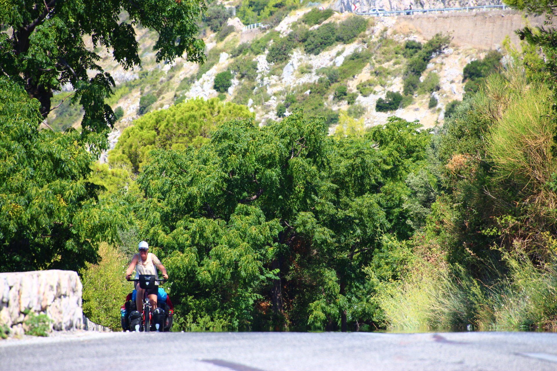 Also damit hätten wir jetzt nicht gerechnet. Er setzt sich wieder zu uns und wir unterhalten uns noch ein wenig. Immer wieder fragt der Besitzer des Cafés, ob wir noch mehr Wasser zu trinken haben möchten. Irgendwann müssen wir dann aber weiter. Als wir gemeinsam mit ihnen zu unseren Rädern zurückgehen, fragt einer der Männer