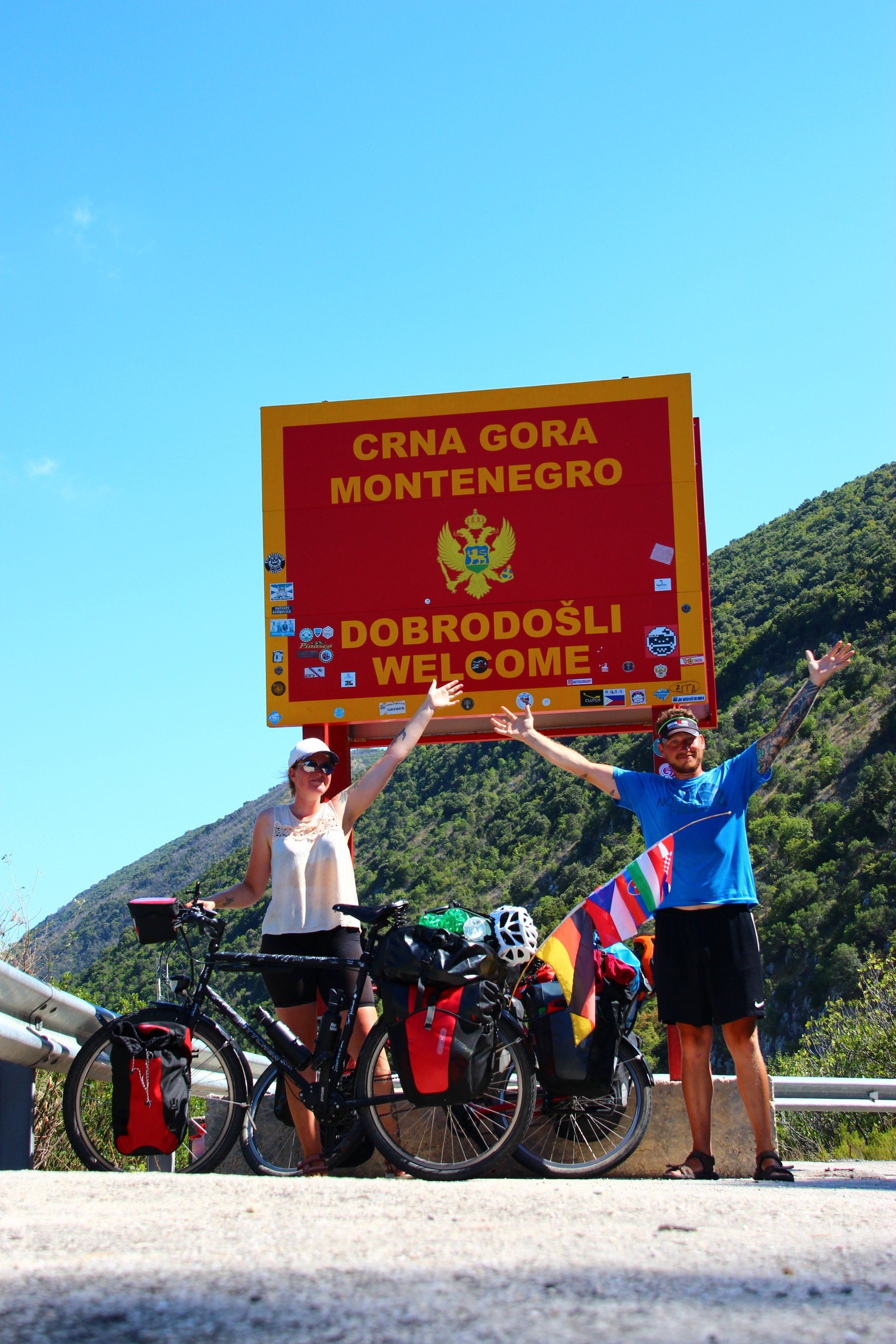 Als wir an einem kleinen und verlassen Gebäude vorbeikommen, ruft Basti mir zu „komm wir machen hier mal eine Pause“ und hält vor dem Gebäude an. Wir schieben unsere Räder an eine kleine Mauer neben dem Gebäude und stellen sie dort ab. Vor dem Gebäude ist eine kleine Terrasse, auf die wir uns setzten. Basti wirft durch die großen Schaufensterscheiben, die die Front des Gebäudes zieren, einen Blick ins Innere. „Scheint wohl mal ein kleines Geschäft gewesen zu sein. Überall stehen leere Regale rum“. Während wir vor dem Geschäft sitzen und eine Kleinigkeit essen und trinken, kommen drei junge Männer die Straße zu Fuß entlang Richtung kroatische Grenze. Jeder von ihnen hat einen kleinen Rucksack auf. Als sie auf unserer Höhe sind, rufen sie uns „Hello“ zu und gehen weiter. Wir antworten ihnen ebenfalls mit einem freundlich „Hello“. Wenig später satteln wir auch schon wieder auf. 200 Meter später fahren wir eine langgezogene Linkskurve und was taucht direkt dahinter auf, die Grenzkontrolle zu Montenegro. Und wir dachten schon, da kommt nichts mehr und haben uns über das Willkommensschild gefreut. Dabei sind wir bis jetzt noch gar nicht offiziell in Montenegro. An der Grenze ist nahezu kein Betrieb. Freundlich werden wir von einem Grenzbeamten begrüßt. Wir reichen ihm unsere Pässe und nicht ganz zwei Minuten später sind wir dann nun auch offiziell in Montenegro. Da wir auf der Internetseite des auswärtigen Amtes gelesen haben, dass in Montenegro eine generelle Maskentragepflicht herrscht, also auch im öffentlichen Raum, behalten wir erst einmal unsere Maske in Griffreichweite.