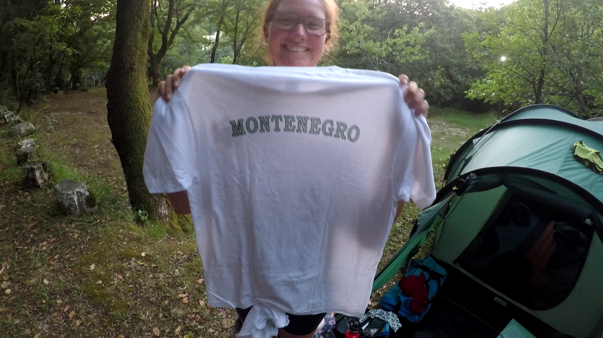 Weil uns das alles etwas krass vorkam, haben wir vorab schon einmal genauer nachgeforscht, was es damit auf sich hat. Raus gefunden haben wir, dass es sich dabei eigentlich nur um so etwas wie eine Kurtaxe handelt, die man auch aus Deutschland kennt. Diese beträgt je nach Verwaltungsbezirk in Montenegro zwischen 0,60€ bis 1,10€ pro Nacht. Alles also mal wieder halb so schlimm, als es dargestellt wird. Dennoch haben wir für uns entschieden, dass wir die 2 oder 3 Nächte, die wir in Montenegro verbringen werden, uns auf einen Campingplatz niederlassen. Zumal diese auch nur wenige Euro kosten. Als Basti gerade das Portmonee am verstauen ist, kommt von der gegenüberliegenden Straßenseite ein Mann aus einem Café auf uns zu und fragt uns, wo her wir kommen und ob wir etwas kaltes Wasser zu trinken haben möchten. Er würde uns einladen. Etwas überrascht nehmen wir diese Einladung natürlich dankend an. Also schieben wir unsere Räder auf die andere Straßenseite und stellen sie an der Hauswand des Cafés ab. Auf der Terrasse des Cafés sitzt noch ein zweiter Mann, der uns sehr freundlich begrüßt, während der andere in das Café verschwindet und kurz darauf mit zwei großen Gläsern gefüllt mit Wasser und Eiswürfeln wieder zurückkommt und uns sagt das wir uns doch bitte setzten möchten, wenn wir wollen. So setzten wir uns zu ihnen auf die Terrasse und unterhalten uns mit ihnen. Dabei stellt sich raus, dass der Mann, der uns das Wasser gebracht hat, der Eigentümer des Cafés ist. Die beiden haben viele Fragen. „Wo kommt ihr her?“, „Wo geht die Reise hin“ und noch viele mehr. Wir unterhalten uns eine ganze Weile mit ihnen. Der andere steht dann auf einmal auf und geht zu seinem Auto, dass direkt neben der Terrasse geparkt steht und macht den Kofferraum auf. Kurz darauf ist er auch schon wieder bei uns und sagt er hat ein kleines Geschenk für uns und hält dabei zwei T-Shirts in den Händen.