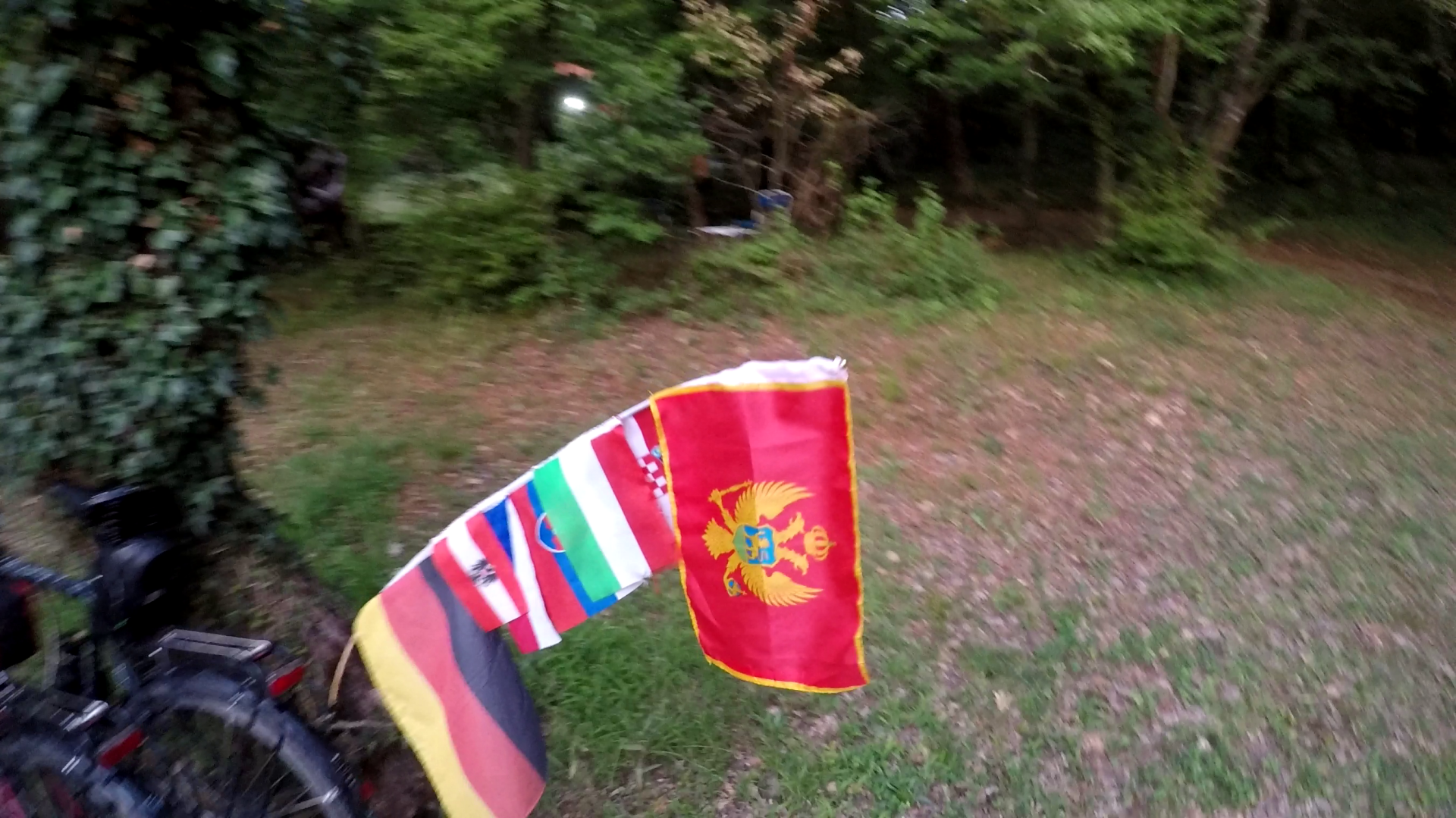 „Oh ihr habt ja sogar Fahnen von allen Ländern, in denen ihr bis jetzt wart“. „Ja, nur leider haben wir noch keine von Montenegro gefunden“ erzählt Basti ihnen. Da sagt der Besitzer des Cafés zu Basti „komm mal mit, ich glaube ich habe da was passendes“. Kurz darauf kommen die beiden wieder und Basti hat eine „kleine“ Flagge von Montenegro in der Hand und sagt dabei „guck mal, die schenkt er uns. Ist zwar dann jetzt die größte Flagge am Rad, aber hey, die ist was Besonderes“. Lachend sagt der Mann „jetzt habt ihr vom kleinsten Land die größte Flagge am Rad“. Desweiteren fragt er uns, ob wir auch noch genug Wasser haben. Wir zeigen ihm unseren Wassersack, der voll ist. Lachend sagt er „ich hol euch noch Eiswürfel. Die könnt ihr in eure Wasserflaschen packen. Dann habt ihr wenigstens noch etwas kaltes zu trinken“. Kurz darauf kommt er mit einem Eimer voller Eiswürfel wieder.