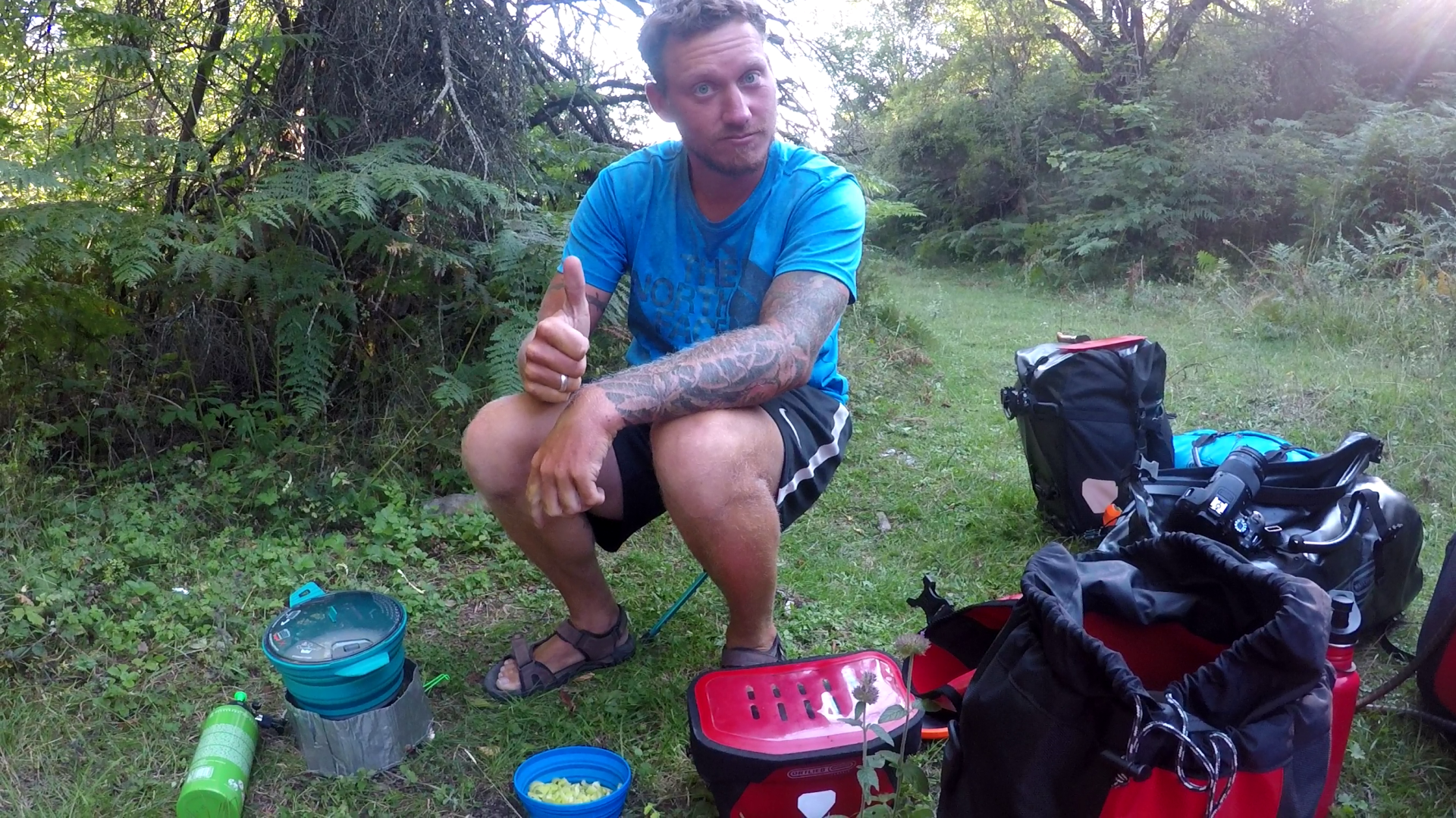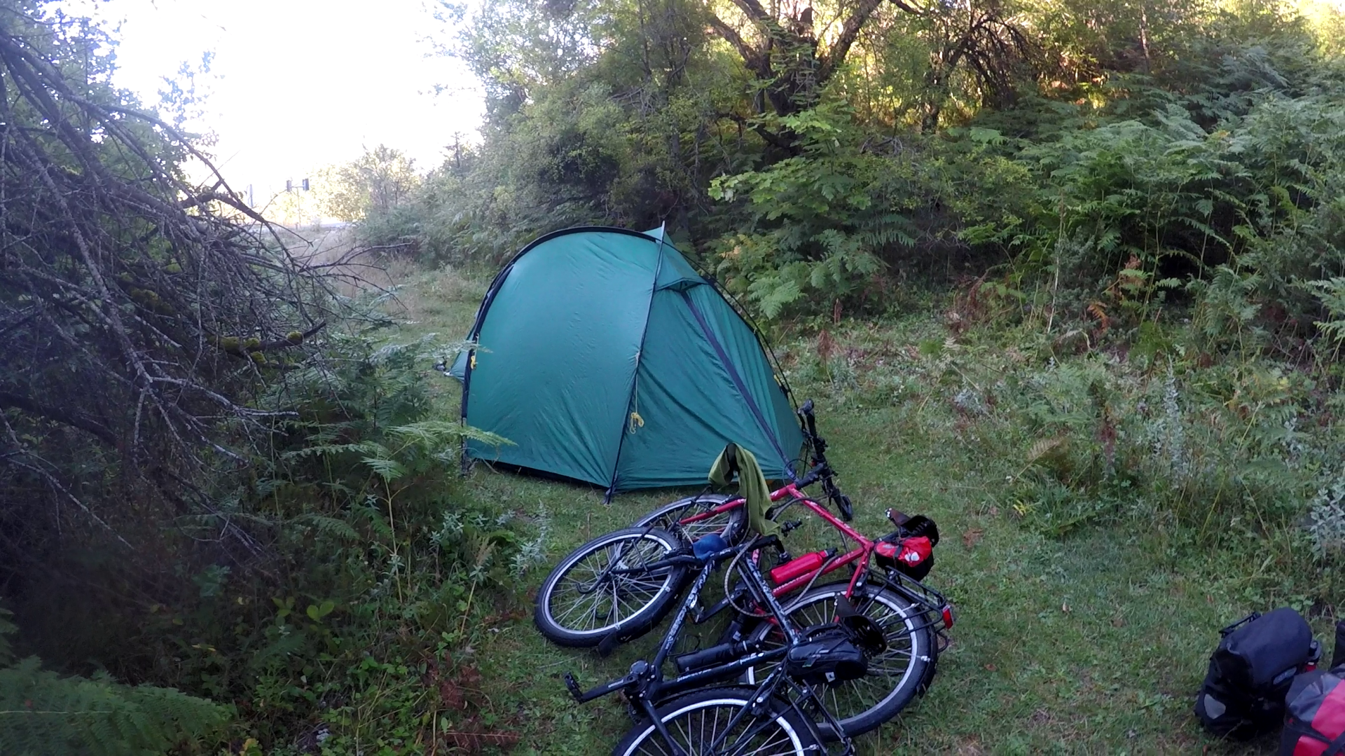 Er ist zwar nicht optimal, aber man darf nicht zu wählerisch sein. Der Platz der Wahl liegt nur wenige Meter von der Straße entfernt in einer Kurve, wo gerade genug ebener Platz für das Zelt ist. Um uns herum ist außer der Straße nur dichter Wald und ein kleiner Trampelpfad, der ins Gebüsch führt. Man könnte fast meinen, man ist in den Tropen. So dicht und grün ist hier alles. Während Basti uns etwas zu essen kocht, ziehe ich mich etwas dicker an. Denn hier oben ist es am Abend doch deutlich frischer, als die letzten Tage. Als Basti sieht, dass ich mich dick einpacke, schüttelt er nur mit dem Kopf und sagt „Wir haben 17°C“. Na und. Denke ich mir und ziehe mir meine Thermosocken an. Nach dem essen fangen wir an das Zelt aufzubauen. Während ich drinnen alles herrichte, packt Basti draußen alles zusammen. Von der Straße hören wir Kuhglocken näher kommen. Ob das die Kühe sind, die wir vorhin gesehen haben? „Ok, da kommen Kühe und die wollen natürlich genau hier rein. Das war so klar“ sagt Basti lachend. Als die Kühe um die Ecke kommen und uns und das Zelt entdecken, bleiben sie zuerst stehen und gucken uns verdutzt an. Ja, auch Kühe können verdutzt aus der Wäsche gucken. Langsam und vorsichtig näher sich die drei dem Zelt. Halten dabei aber ausreichend Abstand. Eine von ihnen Schnuppert nur neugierig am Zelt und geht dann weiter. Sie folgen dem Pfad ins Gebüsch und verschwinden. „Das waren ja mal lustige und nette Kühe“ sagt Basti. Nachdem er draußen fertig ist, kommt er auch ins Zelt und wir legen uns schlafen.