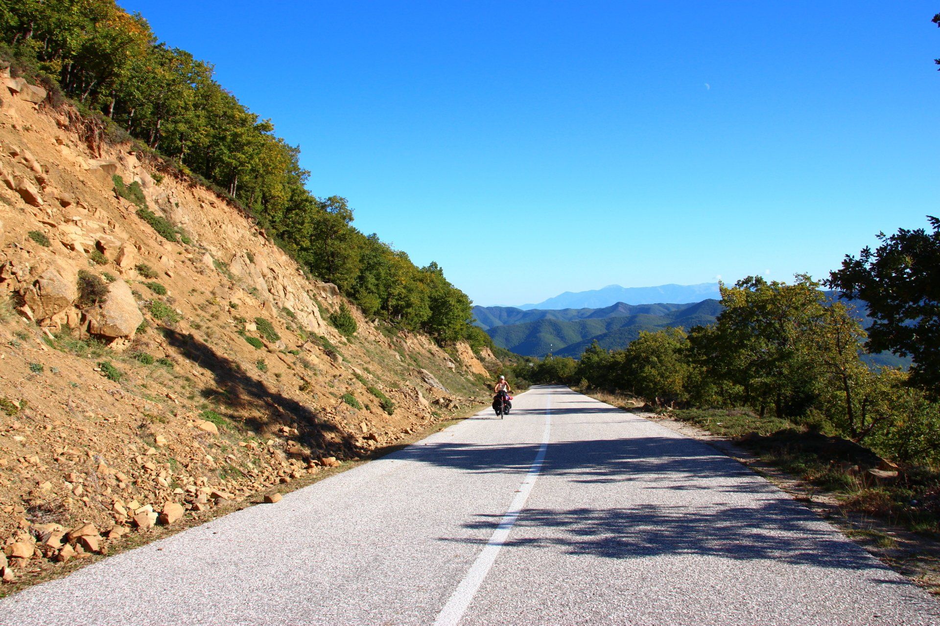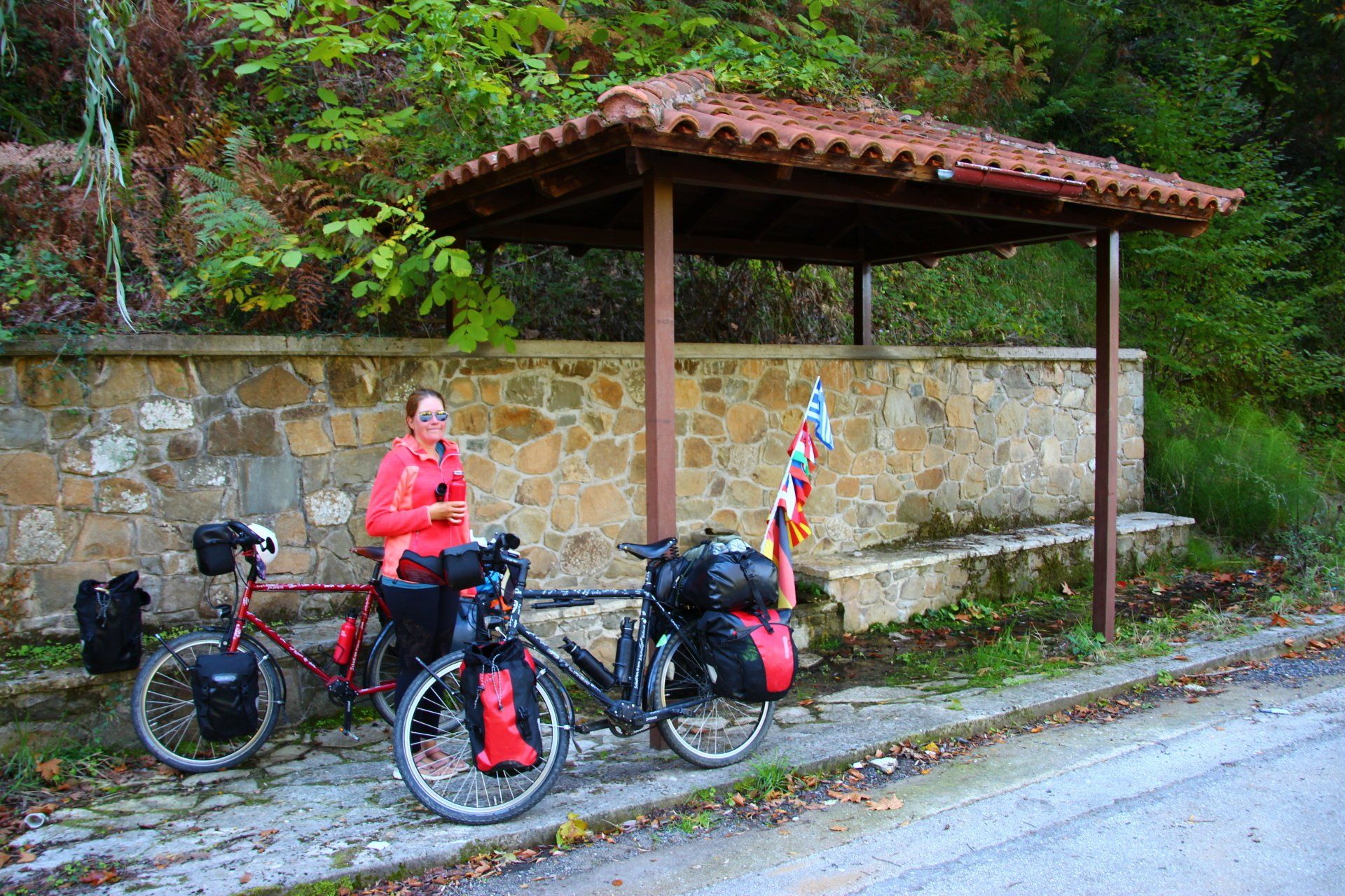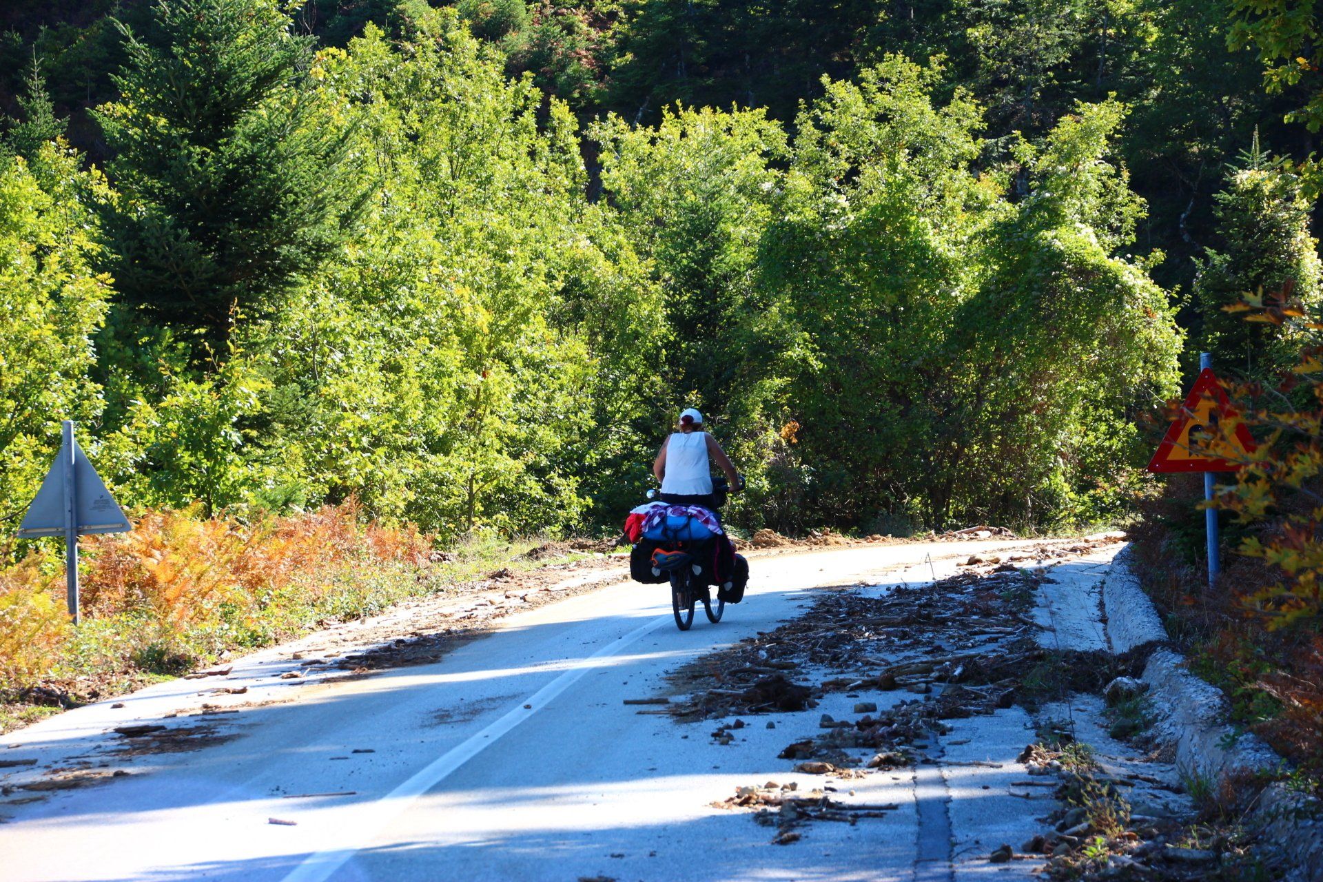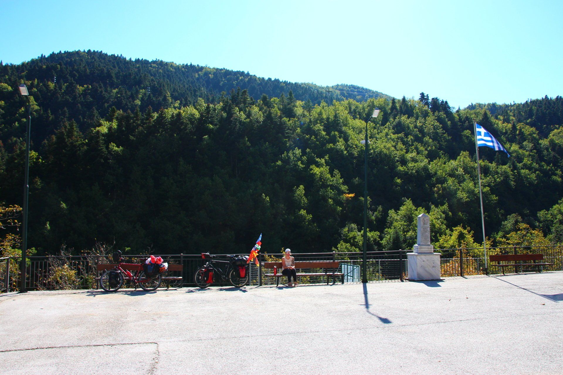 Vor uns liegt das griechische Mittelgebirge. Das heißt, es wird die nächsten Tage ganz schön anstrengend werden. Insgesamt gilt es satte 4380 Höhenmeter zu bewältigen. Aber zuerst einmal heißt es frühstücken. Heute gibt es lecker Brot mit Käse, Marmelade und Merenda. Man will ja schließlich gestärkt in den Tag starten. Nach dem essen packen wir alles zusammen und satteln auf. „Schön wenn der Tag schon mit leichtem bergauf fahren beginnt, oder?“ frage ich lachend Jasmin. „Naja, geht so. Hauptsache es wird nicht all zu steil“ antwortet sie mir. Daraufhin grinse ich sie nur frech an und sie weiß genau was ich damit andeuten möchte. So schlängelt sich die wirklich gut geteerte Straße durch die immer hügeliger werdende Landschaft. Seit wir das Dorf Cedrus verlassen haben, befinden sich auf der Straße große weiße Zahlen. „Sind das Kilometerangaben?“ fragt mich Jasmin. „Ja, ich glaube schon. Gestern Abend haben wir ja ein paar Spaziergänger aus dem Dorf kommend gesehen. Genauso wie heute Morgen, als wir am packen waren. Kannst du dich erinnern, was meine Oma uns mal erzählt hat?“ frage ich sie. „Meinst du, dass es früher üblich war, dass die Leute am Abend immer eine Dorfrunde spazieren gegangen sind, aber das das immer weniger machen und meist nur noch in kleinen Dörfern Tradition hat?“ antwortet sie mir. „Ja genau das meine ich und hier haben sie sich halt die Kilometerangaben auf den Boden gepinselt, damit sie wissen wie weit sie gegangen sind. Schon cool“. „Mensch, dann müssen die ja ganz schön fit zu Fuß sein. Da vorne kommt nämlich eine Neun“. Es folgt sogar noch die Zehn, aber danach war dann Schluss. Nach einer Weile wird es deutlich steiler. Immer wieder sind hinter der nächsten Kurve Steigungen mit bis zu 10% dabei. Hin und wieder sogar 13%. Als am Straßenrand eine überdachte Pausestelle mit einem Quellbrunnen auftaucht, machen wir eine Pause. „Puh, ganz schön anstrengend“ sagt Jasmin zu mir, während sie ihr Fahrrad abstellt. Wir trinken und essen eine Kleinigkeit und fahren dann weiter.