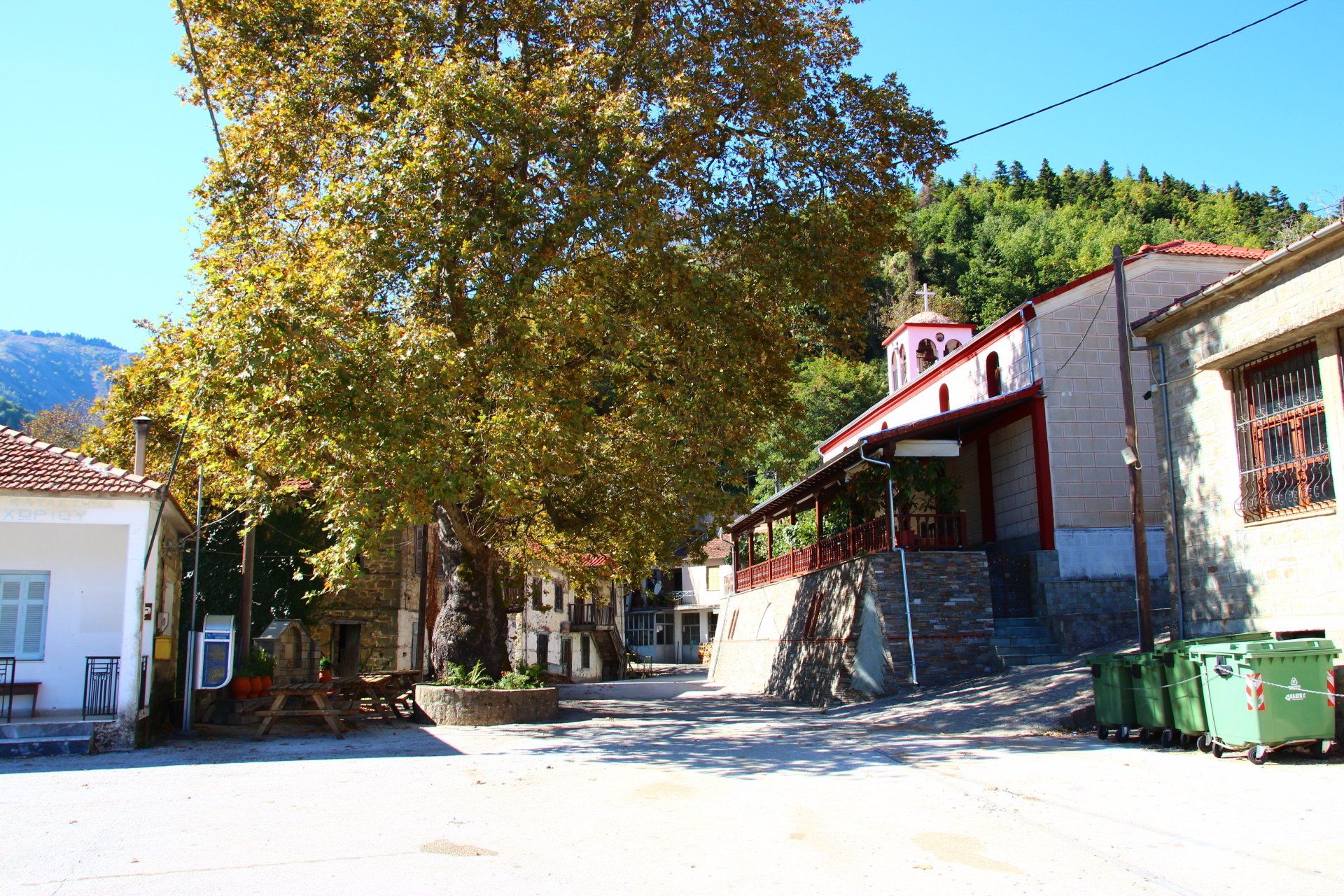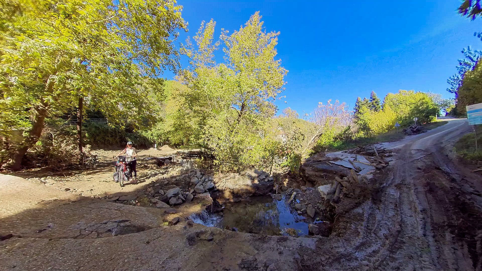 Ungefähr 7 Kilometer später kommen wir in dem kleinen Bergdorf namens Aidonochori an. An dem großen Dorfplatz machen wir eine Pause und genießen die Aussicht auf die um uns liegenden Berge. „Ach was! Guck dir das mal an“ sage ich zu Jasmin und zeige auf das, was ich da gerade entdeckt habe. Der Dorfplatz befindet sich in einem Hang und endet an einem Geländer, was vor einem abstürzen schützt. Doch wenn man an das Geländer tritt, entdeckt man, dass an einem Ende eine kleine Steintreppe zu einem Basketballplatz führt, der ein paar Meter tiefer liegt. „Also das ist ja mal wirklich ein ausgefallener Platz für einen Basketballplatz“ sage ich lachend zu Jasmin. Nach einer Weile fahren wir dann aber wieder weiter. Direkt hinter der Ortschaft führt nach einer scharfen Kurve die Straße weiter nach oben. Naja, sollte sie jedenfalls. Vor ein paar Wochen, während wir noch bei meinen Großeltern waren, ist über Südgriechenland ein starkes Unwetter gezogen, was einige Schäden hinterlassen hat. Ein Teil davon bekommen wir gerade zu sehen. Da, wo eigentlich die Straße sein sollte, klafft auf der einen Straßenseite nur ein großes Loch. „Oh, hier muss wohl eine Gerölllawine runter gekommen sein“ sage ich zu Jasmin und halte an. „Ui. Gut das wir zu der Zeit noch im Norden bei deinen Großeltern waren“. Wir steigen ab und schieben unsere Räder auf der noch halbwegs intakten Straßenseite weiter, bis die Straße wieder in Ordnung ist. Dabei geht mir das Lied von Queen, never gonna stop me now, durch den Kopf. So, jetzt kann es ja weiter gehen. Aber auch auf den nächsten paar Kilometern ist immer noch das Ausmaß des Sturms zu sehen. Überall liegen Geröllreste auf der Straße verteilt. Somit sind wir gezwungen auch noch Slalom zu fahren, während es bergauf geht.