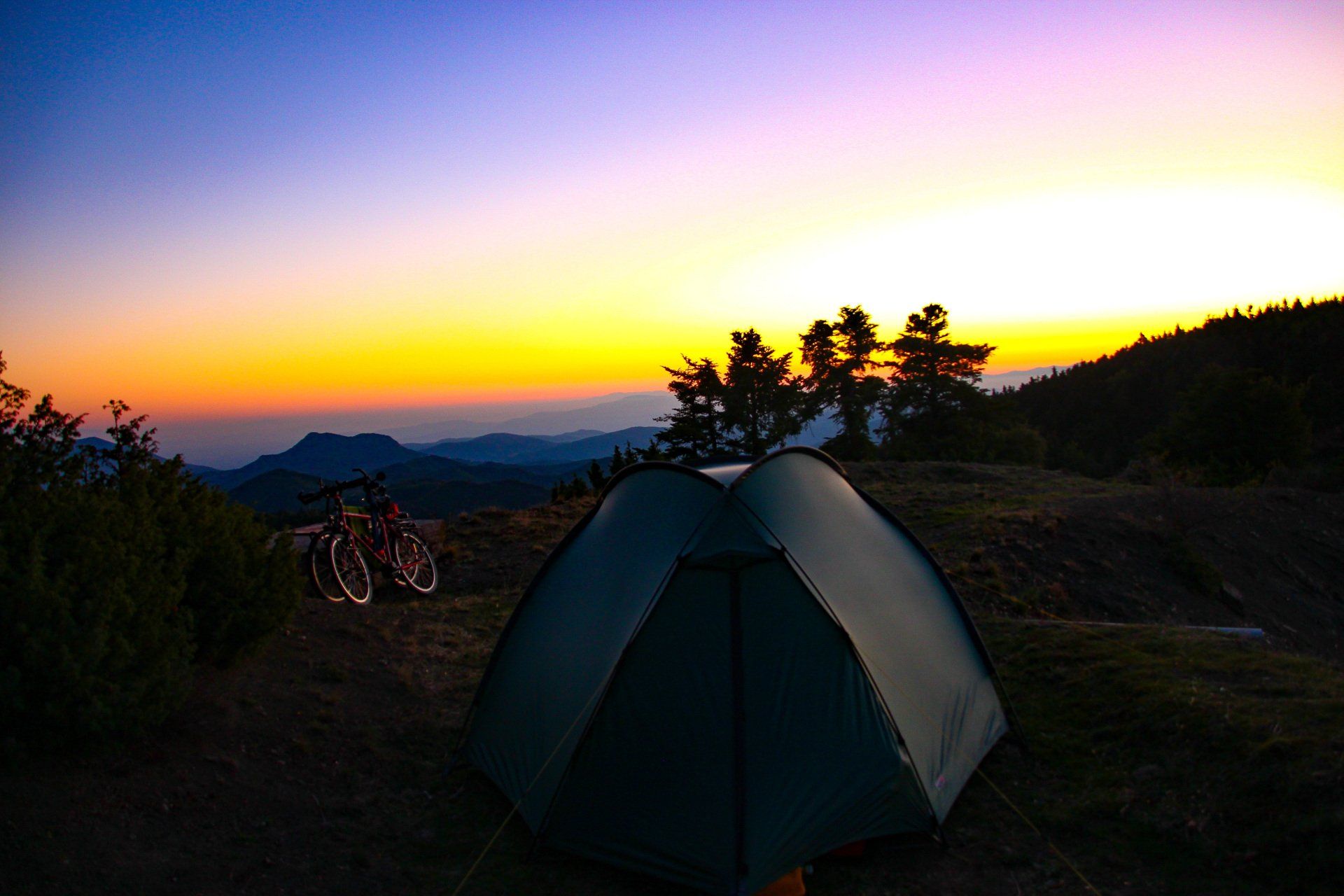 Um kurz nach 6 Uhr morgens werden wir von den ersten Sonnenstrahlen geweckt. Wir bleiben zuerst noch ein paar Minuten liegen, doch nach einer Weile meldet sich die Blase. Schnell etwas anziehen und dann raus aus dem Zelt. Wow! Was für ein herrlicher Ausblick am Morgen. Da wir einen freien Blick Richtung Osten haben, können wir den Sonnenaufgang in voller Blüte bewundern. Was für ein wunderschöner Anblick. So kann der Tag ja nur gut werden. Nach dem Pippi machen heißt es frühstücken. Obwohl wir in den Bergen auf 1120hm sind, ist es mit 12°C gar nicht mal so kalt. Das liegt aber auch zum einen daran, dass es nahezu windstill ist. Nach dem frühstücken packen wir alles zusammen und schieben die Räder wieder den Weg hinunter zur Straße. Bevor es jedoch weiter geht, füllen wir an dem kleinen Rastplatz unser Wasser wieder auf. Heute liegen einige Höhenmeter vor uns. Wir machen da weiter, wo wir gestern aufgehört haben. Bergauf fahren. Denn noch sind wir nicht ganz oben angekommen. 240Hm liegen noch vor uns. Was gibt es besseres zum wach werden, als am frühen Morgen Steigungen von 9% zu radeln. Besser als Kaffee. Nach 6km sind wir auch schon am vorerst höchsten Punkt angekommen (1360hm). Jetzt geht es erst einmal wieder bergab. Eine echte Wohltat nach dem morgendlichen Sportprogramm. In langgezogenen Serpentinen geht es nun wieder abwärts. Die bergige Landschaft ist wirklich unglaublich schön. Dabei haben wir die Straße fast die ganze Zeit für uns alleine. So etwas wünscht man sich doch als Radreisender. Nach dem bergab fahren steht jedoch wieder das bergauf fahren an. Mit im Schnitt 5% Steigung schlängeln wir uns nun wieder die Berge rauf. Mittlerweile befinden wir uns in einem dichten Wald.