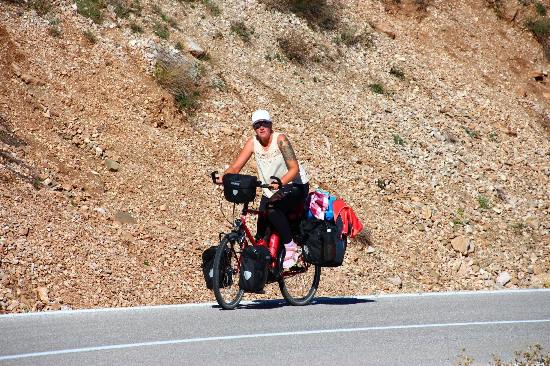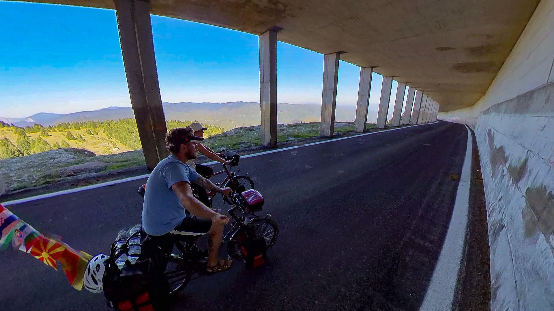 Nach einer Weile lässt die Steigung etwas nach und es geht mal hoch und mal runter. Nach 8km steht jedoch die nächste steile Bergetappe an. Dieses mal geht es auf 1480hm rauf. Während wir den Berg hinauf strampeln, kommen wir an zwei Jägern vorbei, die gerade Mittagspause machen. Sie sitzen in Klappstühlen neben ihren Pickups, die Flinten lässig am Wagen angelehnt und Schlürfen ein kaltes Bier aus der Kühlbox. Dazu gibt es belegte Brote. Als sie uns entdecken, grüßen sie uns und winken und applaudieren uns zu. Einer von ihnen ruft uns auf englisch zu „Gleich seid ihr oben“ und streckt uns dabei den Daumen entgegen. Lachend grüßen wir zurück. Noch knapp 1km, dann sind wir auch schon oben. Die Spitze ist schon in Sicht. Die letzten Höhenmeter geht es einmal um eine steil in den Himmel ragende Bergkuppe. Um die Straße vor herabfallenden Steinen zu schützen, wurde sie teilweise überdacht. Rechts eine Betonwand und links der Abgrund. Am anderen Ende befindet sich eine kleine flache Stelle, mit einer Pausebank inklusive Panoramaausblick. Hier machen wir kurz Halt. Unser nächstes Ziel heißt Karpenisi. Eine kleine Stadt mitten in den Bergen, in einem Tal gelegen. Bis dort hin, sind es jetzt noch knapp 20Km. Und das beste daran, es geht nur bergab. Ganze 600hm. Teilweise geht es in engen Serpentinen hinab. Kurz vor Karpenisi gelangen wir auf eine breit ausgebaute vierspurige Schnellstraße. Schlagartig nimmt auch der Verkehr wieder zu. Schade, es war so schön ruhig gewesen. Wir folgen ihr nach Karpenisi rein. Hier machen wir an einem Supermarkt Halt, um unsere Vorräte wieder aufzustocken. Nach dem Einkauf machen wir noch etwas Pause an einer Mauer, in einer Ecke des Parkplatzes des Supermarktes. Wir beschließen noch aus der Ortschaft raus zu fahren und dann nach einem Schlafplatz Ausschau zu halten. Als wir an einer Tankstelle vorbei kommen, sagt Basti zu mir „lass hier mal kurz halten. Damit wir die Kocherflasche wieder auffüllen können“. Also halten wir noch kurz an der Tankstelle an. Basti geht mit der Flasche zur Zapfsäule und lässt sie von dem Tankwart füllen. „So fertig. Hat jetzt 70 Cent gekostet“ sagt er zu mir, während er sie wieder verstaut. Weiter geht es. Scheinbar scheint dies hier ein beliebtes Reiseziel bei den Griechen zu sein. Denn überall stehen kleine Ferienhäuser umher. Was uns gleich auffällt ist, dass sie nicht in dem üblichen griechischen Baustil gebaut wurden, sondern eher Blockhäusern aus Kanada ähneln. Auf einer großen Grünfläche neben der Straße wollen wir unser Glück versuchen. Wir schieben unsere Räder einen kleinen Schotterweg hinab zu der Wiese. Da sich zwischen den dicken Grasbüscheln Pflanzen mit echt fiesen Stacheln verstecken, dauert es ein bisschen bis wir einen geeigneten Schlafplatz gefunden haben. So, schnell das Zelt aufbauen. Denn die Sonne verschwindet gleich hinter den um uns liegenden Berggipfeln. Das ist leider einer der Nachteile, wenn man sich in einem Tal befindet, das von hohen Bergen umgeben ist. Das Zelt ist schnell aufgebaut. Jetzt noch schnell etwas zu essen kochen. Kurz nach dem die Sonne hinter den Berggipfeln verschwunden ist, ist auch schon das essen fertig. Heute essen wir im Zelt. Zum einen um nicht zu viel Aufmerksamkeit mit unseren Kopflampen auf uns zu ziehen und zum anderen ist es seit dem die Sonne hinter den Bergen verschwunden ist, deutlich kälter geworden. Pappe satt kuscheln wir uns in unsere Schlafsäcke. Gute Nacht.