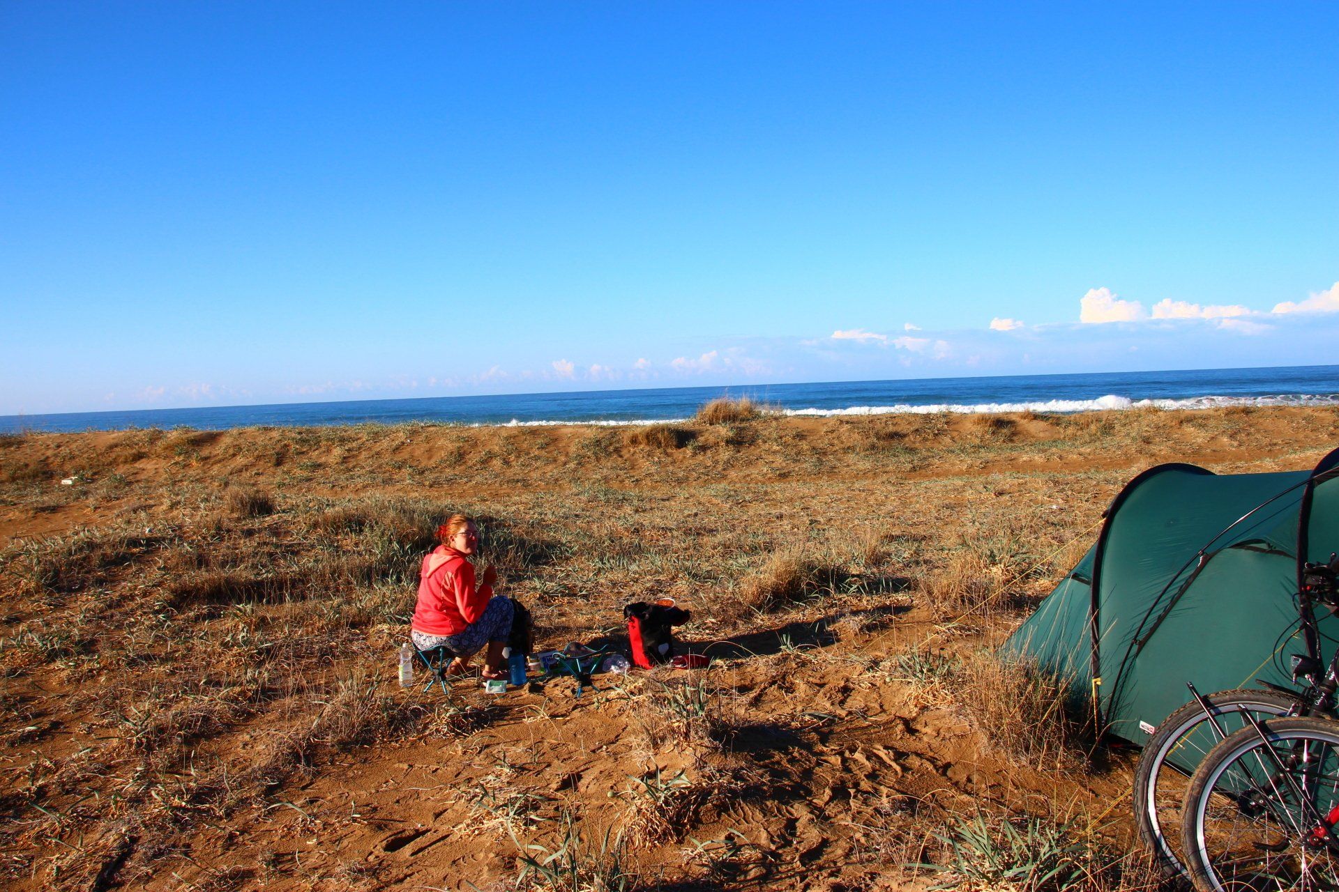 Heute schlafen wir mal so richtig aus. Den Wecker haben wir vorsorglich schon am Abend vorher ausgeschaltet. Herrlich. Nachdem wir wach geworden sind, bleiben wir zuerst noch eine Weile im Zelt liegen. Aber durch die Sonne heizt sich das Zelt schnell auf, sodass wir ins Freie flüchten. Im Schatten unseres Zeltes frühstücken wir. Auch hier lassen wir uns reichlich Zeit. Denn heute steht nichts auf dem Tagesplan. Naja, fast nichts. Ich fahre zum Mittag hin mal mit dem Rad zur nächsten Ortschaft, Zacharo. Dort will ich ein paar Besorgungen machen. Unter anderem Lebensmittel und schauen ob ich eine Stelle finde, an der wir Wasser bekommen. Nach dem Frühstück genießen wir jedoch erst einmal einfach unsere Freizeit. Wir faulenzen in der Sonne, gehen am Strand spazieren und ich schreibe am Reisetagebuch weiter. Bevor ich dann so um die Mittagszeit losfahre, schreiben wir eine Einkaufsliste, damit ich auch nichts vergesse. Reis, Gemüse, Brot und Früchte stehen auf der Einkaufsliste, aber auch eine kalte Limonade für Jasmin und ein kaltes Bier für mich. „Pass auf dich auf“ sagt Jasmin zu mir, als ich mir gerade mein Fahrrad schnappe und los will. „Uuuh... ist ja fast so wie früher, als ich morgens zur Arbeit geradelt bin“ antworte ich ihr lachend. Darauf hin fängt auch sie an zu lachen. „Bis später“ sage ich noch zu ihr und eier los. Drei Kilometer später bin ich auch schon in Zacharo am Supermarkt angekommen. Vor dem Laden fällt mir dann auf, misst Maske vergessen (Oktober 2020). Zurückfahren? Ne, dass ist blöd. Was jetzt? Ich entscheide mich mir einfach mein T-Shirt über Mund und Nase zu ziehen und schnell eine Einwegmaske zu kaufen. Die werden ja wohl welche haben. Schnell rein und ab Richtung Kasse. Dort sollten welche sein. Bingo! Da sind welche. Ok was ist die günstigste. Ein Zweierpack für 50 Cent. Nehme ich. Auf zur Kasse. Zum Glück steht dort gerade niemand an. Die junge Frau an der Kasse begrüßt mich mit einem Lächeln „Calimera“ (zu deutsch, guten Morgen). „Calimera“ erwidere ich. So jetzt kann ich Einkaufen gehen. Ausgangstür raus, zwei Meter daneben mit Maske wieder rein. Die Frau an der Kasse schaut mir hinterher und begrüßt mich mit einem Lachen und Winken wieder im Laden. Ein paar Minuten später ist der Einkauf erledigt. So, Punkt 1 von 2 abgearbeitet. Jetzt muss ich Wasser finden. Ich fahre einfach drauf los. Im Zickzack fahre ich durch die Straßen. Mmmh... Leider kein Wasserhahn oder Brunnen zu sehen. Dann entdecke ich einen Kirchturm der über die Dächer ragt. Ah, sehr gut. An Kirchen bekommt man eigentlich immer Wasser. An der Kirche angekommen stelle ich mein Rad ab und laufen schnell die paar Stufen zur Kirche rauf, denn sie befindet sich auf einem kleinen Hügel. Ein Wasserhahn ist schnell gefunden. Perfekt, Wasser gibt es auch. Also schnell wieder die Treppe runter und die leeren Flaschen und den Wassersack holen. Dann wieder die Treppe rauf und alles voll machen. Anschließend alles wieder verstauen und ab zurück zu Jasmin. Den Rest des Tages genießen wir einfach unsere Zeit am Strand. Morgen geht es weiter.