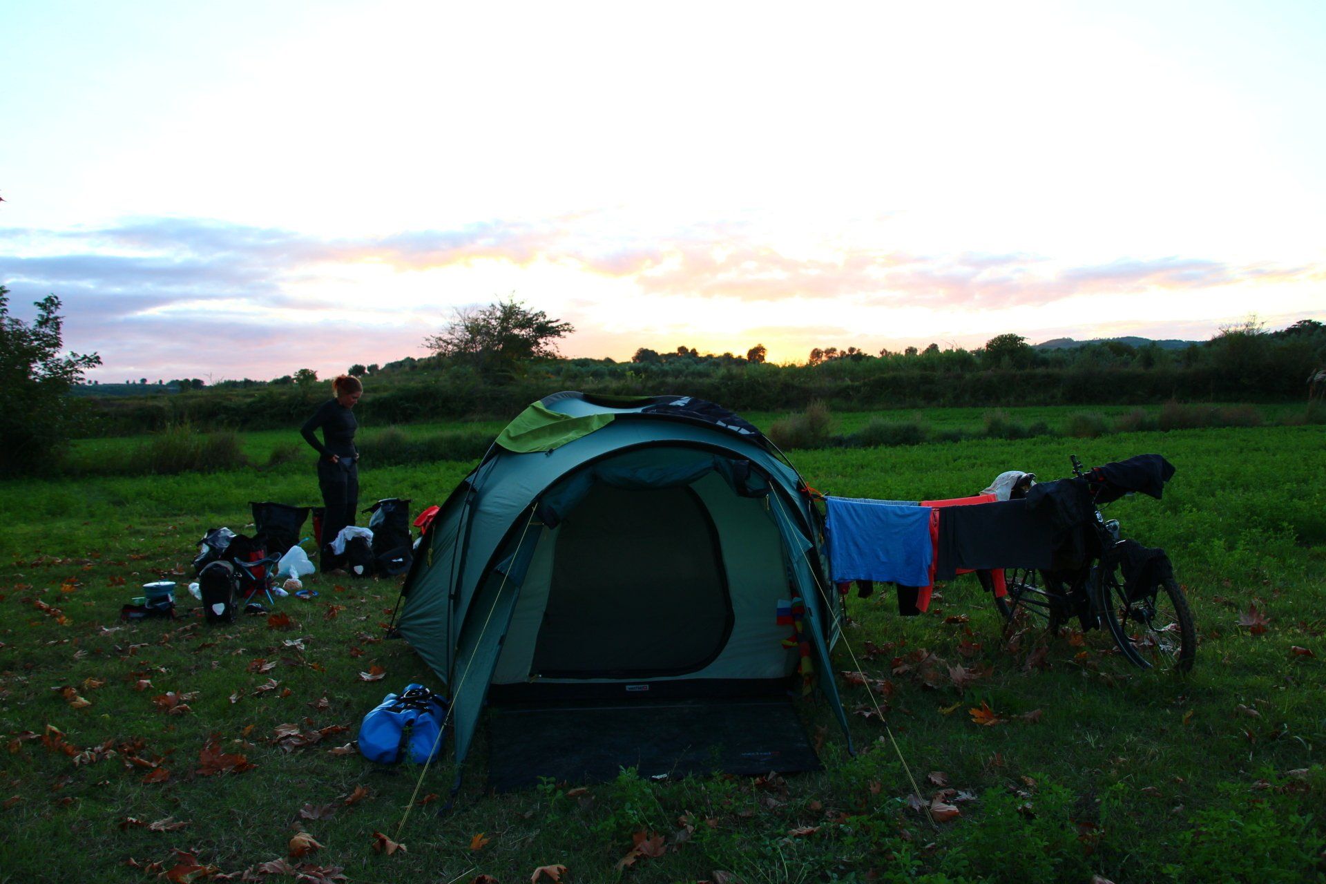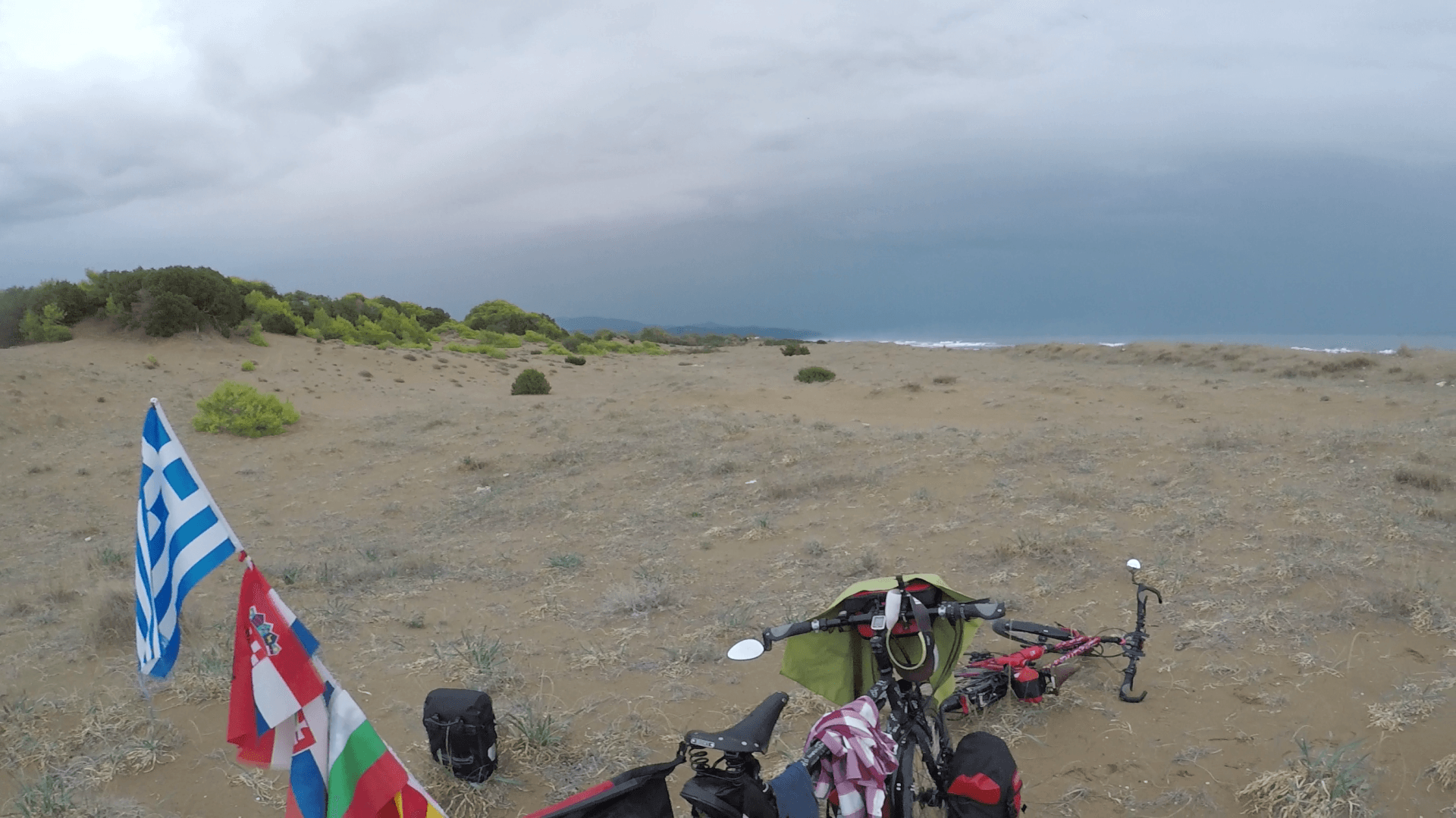 Jetzt geht es weiter Richtung Süden. Natürlich geht es hinter Olympia erst einmal wieder steil rauf. Gut das wir uns mit Keksen gestärkt haben. Auf unserem Weg Richtung Süden und zurück an die Küste, queren wir einen Staudamm und fahren durch eine große recht flache Ebene. Links und rechts der Straße sind immer wieder Seen und unglaublich hoch gewachsene Bambusgräser. Ein paar Kilometer später erreichen wir die kleine Ortschaft namens Kallikomo, die wir einmal durchqueren. Am anderen Ende der kleinen Ortschaft befindet sich eine Bar, die so unglaublich laute Musik spielt, dass wir sie schon von weitem hören. Selbst als die Ortschaft schon ein ganzes Stück hinter uns liegt, können wir die Musik immer noch hören. Nenene, wenn es wenigstens gute Musik wäre. So was wie Slipknot oder Rammstein, aber die Musik ist ein Mix aus schnellen Elektrobeats gepaart einem Gesang, der sich anhört als würde jemand einer Katze am Schwanz ziehen. Aber Geschmäcker sind ja bekannter Maßen unterschiedlich. In Samiko führt uns unser Weg durch enge kleine Gassen rauf und runter. Von hier aus haben wir eine super Aussicht auf die Küste. Unser Plan für heute ist es, einen Schlafplatz am Strand zu finden. Hinter Samiko geht es runter auf Meereshöhe. Die Straße führt uns direkt zur Küste. Von weitem ziehen schon wieder dunkle Regenwolken auf. Na hoffentlich ziehen sie an uns vorbei. Rechts neben der Straße befindet sich ein kleiner Waldstreifen und hinter ihm versteckt sich die Küste. An einem kleinen Waldweg machen wir Halt und ich schaue mal wo dieser Weg hinführt. Nach wenigen Metern komme ich an einem alten und zugewachsenem Bahngleis an. Auf der anderen Seite der Gleise ist weicher Sand. Der Weg führt einmal über dieses Gleis und in hohen sandige Dünen. Ich laufe den Weg weiter entlang und erreiche den Strand. „WOW“ flüstere ich vor mir her. Der Strand ist wirklich wunderschön. Vor mir liegt ein breiter Sandstrand. Ich schaue nach links und rechts und entdecke ein paar Campervans. Ich gehe zu Jasmin zurück und erzähle ihr was ich gesehen habe. Wir beschließen noch ein wenig weiter zu fahren, um nicht direkt bei den Campern unser Lager aufzuschlagen. Wenige Meter führt wieder ein Weg in den Wald. Auch diesmal laufe ich zuerst vor, um die Lage zu peilen. Hier sieht es gut aus. Wir schieben unsere Räder den Sandweg entlang. An fahren ist hier nicht zu denken. Der Weg führt wieder direkt zum Strand. Auch hier stehen wieder zwei Vans. Was uns aber nicht weiter stört. Wir schieben unsere Räder links an den Vans vorbei und suchen uns eine schöne Stelle etwas entfernt von den Vans. Als wir an ihnen vorbei kommen, sehen wir das beide deutsche Kennzeichen haben. „Lustig. Fast immer sind es Deutsche, wenn wir andere Reisende mit Rädern oder Campern sehen“ sage ich zu Jasmin. „Ja. Irgendwie komisch“ sagt sie lachend zurück. Wir packen unsere Räder ab und bauen das Zelt auf. Eigentlich würde ich ja wirklich gerne eine Runde baden gehen, aber die Brandung ist wirklich etwas doll. Die Wellen, die kurz vor dem Strand brechen, sind gute 1,5m hoch. Auf Waschmaschine habe ich jetzt nicht so wirklich Lust und lasse es daher. Während wir uns etwas zu Abendessen kochen, kommen wir auf den Gedanken, doch einfach mal einen Tag Pause zu machen. Und zwar hier am Strand. Bis zur nächsten Ortschaft ist es nicht weit. Ungefähr 10 Minuten mit dem Rad. Dort gibt es einen Supermarkt, an dem wir morgen einkaufen könnten. Außerdem könnten wir auch dort unsere Wasservorräte auffüllen. Wir entscheiden uns dafür, erst übermorgen weiterzufahren und mal einen Tag die Seele baumeln zu lassen. Da der Wind etwas gedreht hat, bleiben wir sogar von den Regenwolken verschont. Während die Sonne langsam am Horizont verschwindet, genießen wir unser Abendessen. Als die Sonne dann endgültig am Horizont verschwunden ist, gehen wir ins Zelt und legen uns schlafen.