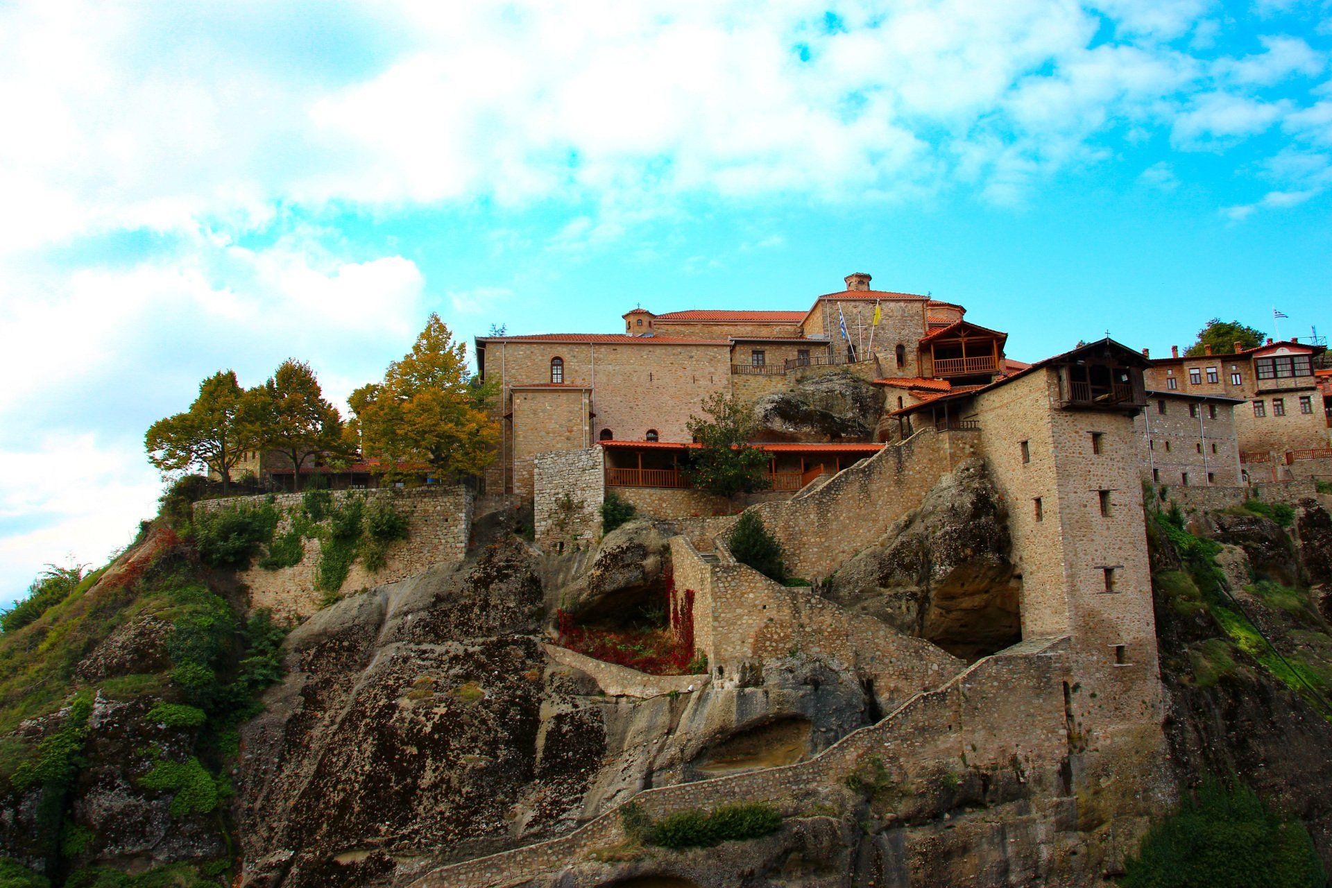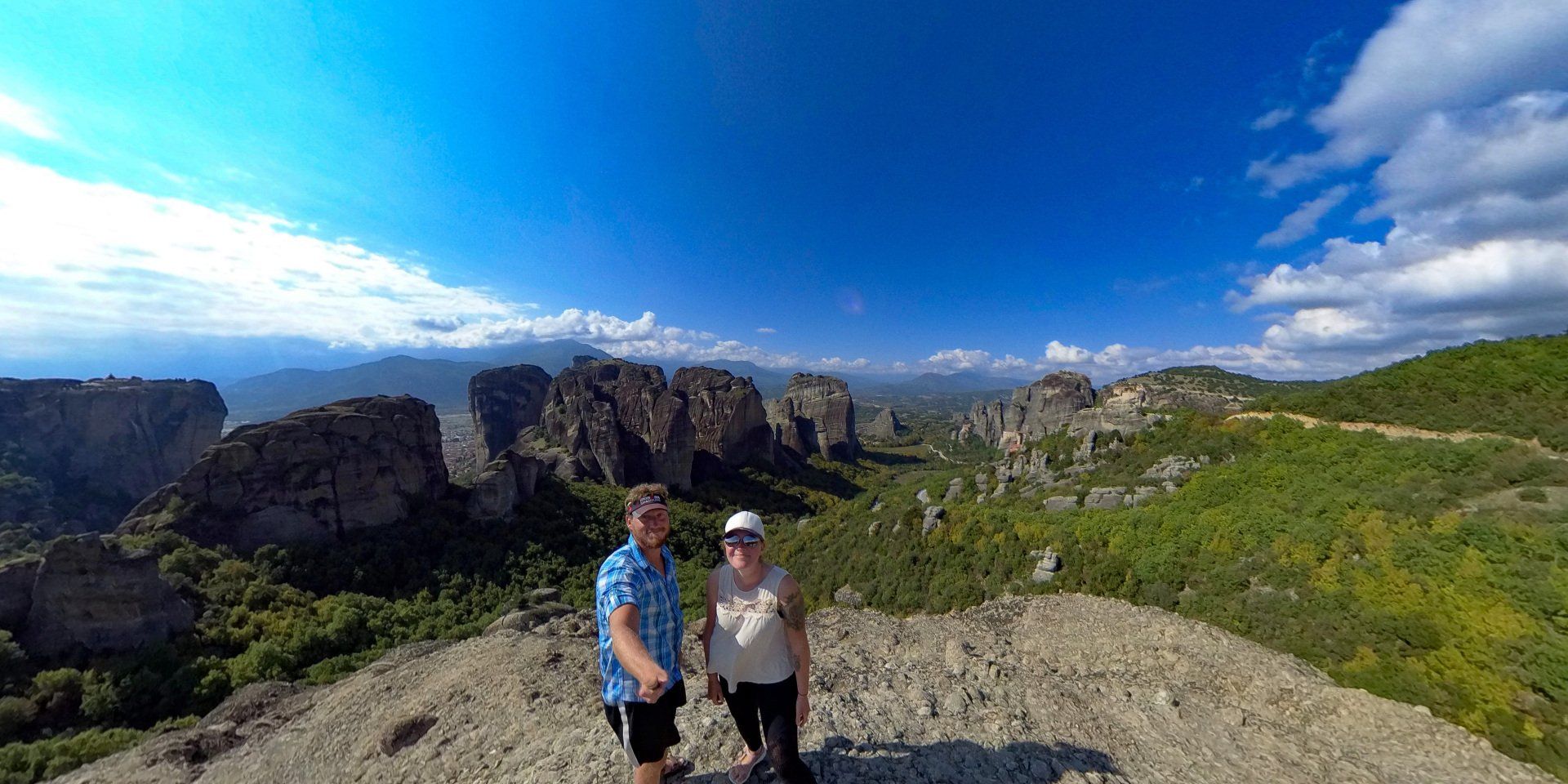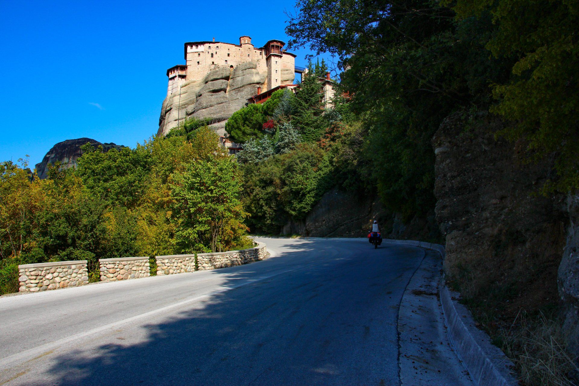 Pünktlich um halb acht werden wir sanft vom Wecker geweckt. Kurz was frühstücken, schnell die letzten Sachen packen und dann heißt es, alle Taschen raus bringen. Nachdem die Räder beladen sind, geht es auch schon los. Heute ist Tag 100 unserer Fahrradweltreise. Mal gucken, was wir heute alles so erleben.Um zu den Klöstern zu gelangen, heißt es zuerst einmal bergauf radeln. Schon von unten sehen die steilen Felsformationen mit den auf sich befindenden Klöstern beeindruckend aus. Eine gut asphaltierte Straße führt nach oben. Da wir recht früh dran sind, ist noch nahezu nichts los. Auf dem Weg nach oben kommen wir an ein paar Straßenarbeitern vorbei, die die alten Leitplanken durch neue und schönere Steinblöcke erneuern. „Kaliméra“ grüßen wir sie, als wir an ihnen vorbei fahren. Mit großen Augen und einem Lächeln im Gesicht grüßen sie zurück „Kaliméra“. Unser erstes Ziel ist das Megálo Metéoro. Das erste und größte Kloster der insgesamt neun Klöster von Meteora. Als die ersten 2; 3 Autos an uns vorbei fahren, bemerken wir, dass die Handykameras auf uns gerichtet sind und nicht auf die Klöster. So schnell wird man also zum Highlight, denk ich mir und winke mit einem Lächeln in die Kamera. Als wir endlich oben ankommen, sind bis auf uns nur zwei Verkäufer da, die vor ihren kleinen Souvenirshops sitzen und uns lächelnd begrüßen. Wir stellen unsere Räder ab und genießen die wunderschöne Aussicht auf das Kloster, sowie die Landschaft und die anderen Klöster von der Aussichtsplattform. Leider sind aufgrund der anhaltenden Pandemie (COVID-19) die Klöster geschlossen. Aber das soll uns nicht die gute Laune verhageln. Dann genießen wir halt die schöne Aussicht. Als wir wieder zurück zu unseren Rädern gehen, kommen gerade ein paar E-Bike-Touristen mit einem Reiseführer an. Sie stellen die Räder ab und staunen nicht schlecht über unsere vollbeladenen Räder. Basti flüstert zu mir „Wetten das sind Deutsche?“ und kann sich das grinsen nicht verkneifen. Als sie sich staunend über unsere Räder unterhalten und Fotos machen, gehen wir zu ihnen rüber und grüßen sie standardgemäß mit einem freundlichen „Moin“. Sie gucken uns verwundert an und fragen uns ob wir auch Deutsche sind. Wir unterhalten uns eine Weile mit ihnen und machen auch ein paar Fotos mit ihnen. Irgendwann fängt dann ihr Tourguide an sie etwas zur Eile zu drängen, da sie laut Zeitplan weiter müssen. Wir verabschieden uns und sie radeln weiter. Wir hingegen genießen noch ein wenig die Aussicht. „Bin ich froh, dass wir alle Zeit der Welt haben und keinen festen Zeitplan folgen müssen“ sage ich zu Basti. „Ist das ok, wenn ich mir ein Armband zur Erinnerung bei einem der Souvenirshops kaufe?“ frage ich ihn. Er nickt und antwortet mir „Na klar. Mach ruhig“. Ich schlender zu dem Ständer mit den vielen Armbändern von einem der Souvenirshops. Der Verkäufer kommt auf mich zu und wir kommen ein wenig ins Gespräch. Wo wir herkommen und natürlich ob ich Hilfe bräuchte. Es dauert eine ganze Weile bis ich mich entschieden habe, da es so viele tolle Farben gibt. Schlussendlich entscheide ich mich für eines in rot. Kurz noch etwas trinken und dann geht es schon wieder weiter. Auf zum nächsten Kloster. So fahren wir von einem Kloster zum nächsten und bestaunen, was die Natur und der Mensch hier gemeinsam geschaffen haben. Nachdem wir alles gesehen haben, heißt es wieder runter vom Berg.