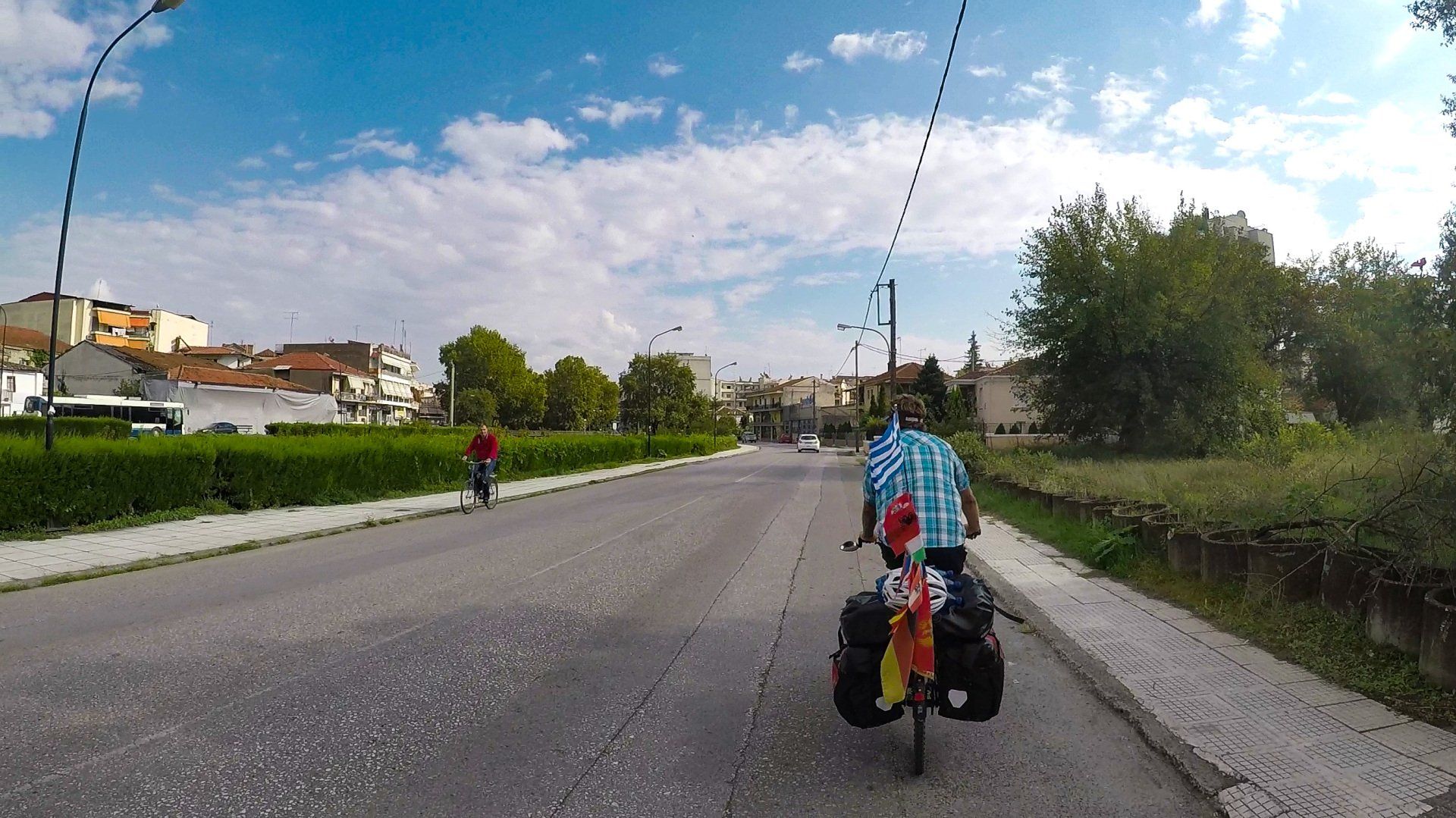 Einige Kilometer später kommen wir in der Fahrradstadt Karditsa an. So preist jedenfalls das Ortsschild die Stadt an. Und ja es stimmt. Direkt hinter dem Ortsschild beginnt ein Fahrradweg. Außerdem sind viele junge und ältere Leute auf Fahrrädern unterwegs. Kurz hinter dem Ortsschild tauchen mehrere größere Gebäudekomplexe auf. „Sieht aus wie Schulgebäude“ sagt Basti zu mir. Wenige Meter weiter taucht dann auch ein großes Schild auf, dass seine Vermutung bestätigt. Wir schlängeln uns durch die Stadt und machen Halt an einem Supermarkt, um uns mit frischen Lebensmitteln zu versorgen. Denn ab morgen geht es einmal quer durch das griechische Mittelgebirge, für ungefähr 2 bis 3 Tage und auf unserem Weg durch die Berge werden wir nur sporadisch auf kleine Bergdörfchen treffen. Also decken wir uns mit reichlich Proviant ein. Zusätzlich gibt es eine Kleinigkeit zum Mittag. Wir verstauen alles und fahren ein Stückchen weiter, um einen schönen Platz für die Mittagspause zu finden. Wir werden schnell fündig. Eine kleine Grünfläche mit einer Bank unter einem großen Baum und einem Brunnen lädt zum verweilen ein. Wir stellen unsere Räder am Baum ab und setzten uns auf die Bank. Nach dem essen füllen wir unsere Wasservorräte wieder auf und ich wasche noch kurz ein paar Klamotten. Gerade als ich fertig bin, geht eine Frau mit einem Jungen an uns vorbei. Als sie uns sieht, bleibt sie stehen und winkt uns zu und fragt uns woher wir kommen. Basti steht auf und geht zu ihr rüber und unterhält sich mit ihr. Während sie sich unterhalten, kommt eine Frau aus dem Haus, dass direkt an der Grünfläche ist und geht zu den beiden rüber und redet mit der Frau auf griechisch. Danach geht die Frau wieder zurück ins Haus und auch die andere Frau mit dem Jungen geht weiter. Basti kommt lächelnd zu mir zurück und ich frage ihn, was sie alles gesprochen haben. „Also, die erste Frau ist Elektroingenieurin und lehrt hier an der Uni und ist begeisterte Fahrradfahrerin. Die andere hat eben gesehen, wie wir unser Wasser am Brunnen aufgefüllt haben. Leider kann sie kein englisch und hat daher die Chance genutzt, als sie gesehen hat, dass ich mich gerade mit der Frau auf englisch unterhalten habe. Was auch noch zufällig ihre Nachbarin ist. Naja, jedenfalls wollte sie uns nur sagen, dass gestern wohl eine Meldung der Stadt kam, dass man aktuell das Leitungswasser wegen Verunreinigung nicht trinken solle. Sie möchte uns gerne abgefülltes Trinkwasser aus dem Supermarkt schenken, damit wir nicht krank werden. Voll nett. Ach ja und die andere Frau, Elena, kommt auch gleich wieder. Sie will kurz ihr Handy holen, um ein Bild zu machen und es ihren Studenten zu zeigen“. Wow. Das ist ja lieb. Da kommt auch schon die Frau mit einem ganzen Secherträger 1,5L Wasserflaschen. Basti geht zu ihr rüber und sagt ihr, dass das wirklich super lieb ist, aber uns reichen zwei Flaschen. Das ist mehr als genug. Kurz darauf kommt Elena auch schon wieder. Sie hat uns zwei kleine Tafeln Schokolade und eine Packung Kekse mitgebracht. „Hier für euch. Die Extra Energie braucht ihr“ sagt sie zu uns und überreicht sie uns. Wir bedanken uns und unterhalten uns noch ein wenig mit ihr. Bevor wir uns verabschieden, macht sie noch schnell ein Bild von uns, ehe sie wieder los muss. Was für nette Menschen es gibt. Wir schwingen uns wieder auf die Räder und fahren weiter. Es geht mehrere Kilometer nahezu nur gerade aus. „Also, den halben Tag nur stumpf und flach geradeaus fahren ist zwar zur Abwechslung mal ganz angenehm, aber auf Dauer auch nicht wirklich spannend“ sage ich zu Basti. „Keine Sorge, ab morgen geht es wieder rauf und runter“ antwortet er mir. In der kleinen Ortschaft Cedrus fahren wir von der Hauptstraße ab und biegen Richtung Westen in die Berge ab. Kurz hinter der Ortschaft entdecken wir eine große flache Wiese neben der Straße. „Du, wir haben mittlerweile 17Uhr durch. Sollen wir für heute Schluss machen? Es wird ja auch bald dunkel“ sagt Basti zu mir. Hört sich gut an. Wir suchen uns eine nette Stelle auf der Wiese und machen Schluss für heute. Leider ist die frisch gewaschene Wäsche noch nicht ganz trocken, daher spannen wir unsere Wäscheleine zwischen unseren Rädern, um die Sachen in den Sonnenstrahlen der untergehenden Sonne zu trocknen. Währenddessen kochen wir uns etwas zu essen und essen zu Abend. Noch eben spülen und dann ab ins Bett.
