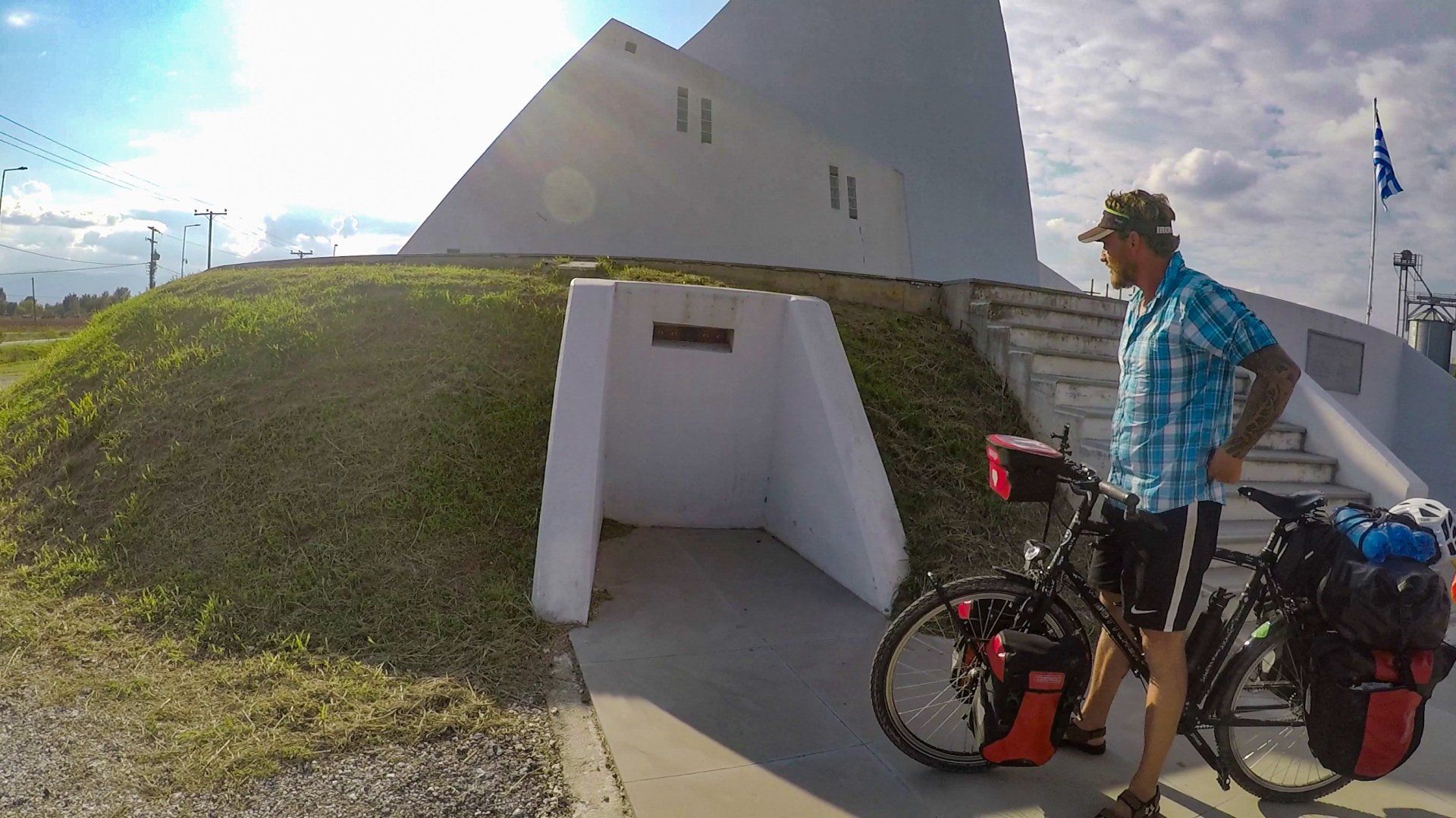 Der folgende Tag beginnt wie jeder andere. Aufstehen, frühstücken, Sachen packen und weiter. Es geht weiter Richtung Süden. Weiter vorbei an Felder, Felder und Felder. Wir wechseln immer wieder zwischen Hauptverkehrsstraße und Nebenstraße. Beide verlaufen nahezu parallel zu einander. Mitten im nirgendwo taucht auf einmal ein merkwürdiges Gebäude auf. Zuerst halten wir es für eine sehr komisch gebaute Kirche. Als wir näher kommen, sehen wir jedoch, dass es ein großes Denkmal ist. „Komm, dass gucken wir uns mal an“ sagt Basti zu mir und biegt zu dem Gebäude ab. Es dauert einen Moment, bis wir raus haben um was es sich handelt. Es ist ein Denkmal an die Schlacht und der Gefallenen auf dem Hügel 731 aus dem zweiten Weltkrieg. „Guck mal. Wir werden beobachtet. Wie gruselig“ sage ich zu Basti und zeige auf einen kleinen Schlitz in einer Betonwand, aus der mich vier Augen anstarren. „Das soll einen Bunker darstellen, aus dem die Soldaten die Umgebung beobachteten“ sagt er zu mir und macht ein Foto.