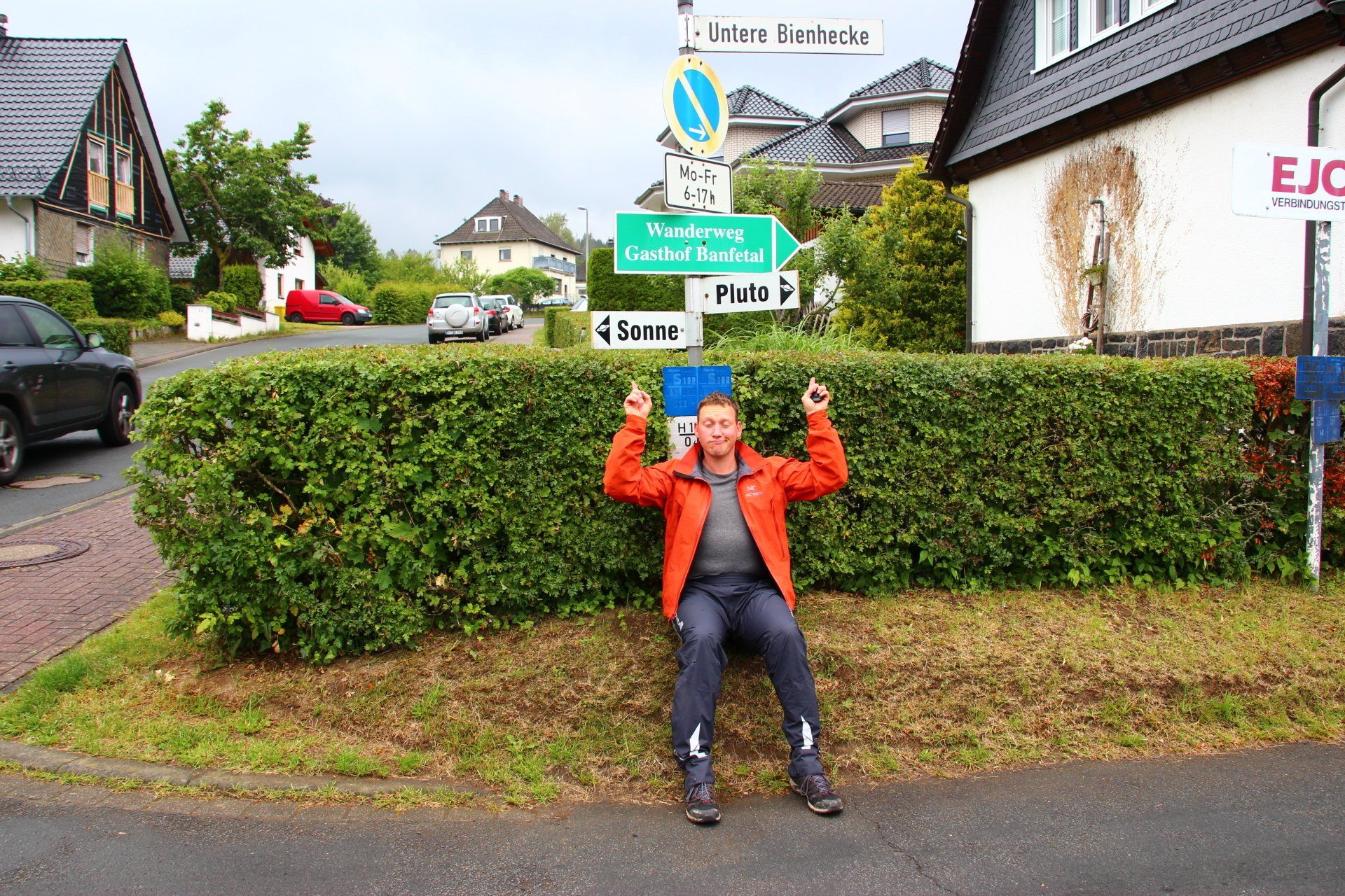 Egal, anrufen. Keiner geht dran. Auch nicht beim 4,5 und 6 mal. Nächstes Geschäft. Betriebsferien. Schön für sie, doof für uns. Fahrradgeschäfte in Siegen, eine Option. Basti findet sie nicht besonders prickelnd. „Von dort kommen wir gerade erst her“ schnauft er. Nochmal nachschauen ob es nicht noch eine andere Möglichkeit gibt. Fahrradgeschäft in ca. 20Km Entfernung. Zwar müssen wir dann die Route etwas umlegen, aber es hilft ja nichts. „Ja, haben wir“ ist die Antwort vom Verkäufer am Telefon. Jetzt heißt es Bergauf schieben und Bergab rollen. Räder bepacken und los. Nach kurzer Zeit Bergauf schieben fährt ein Service Wagen der Firma Günther Bau an mir vorbei.
