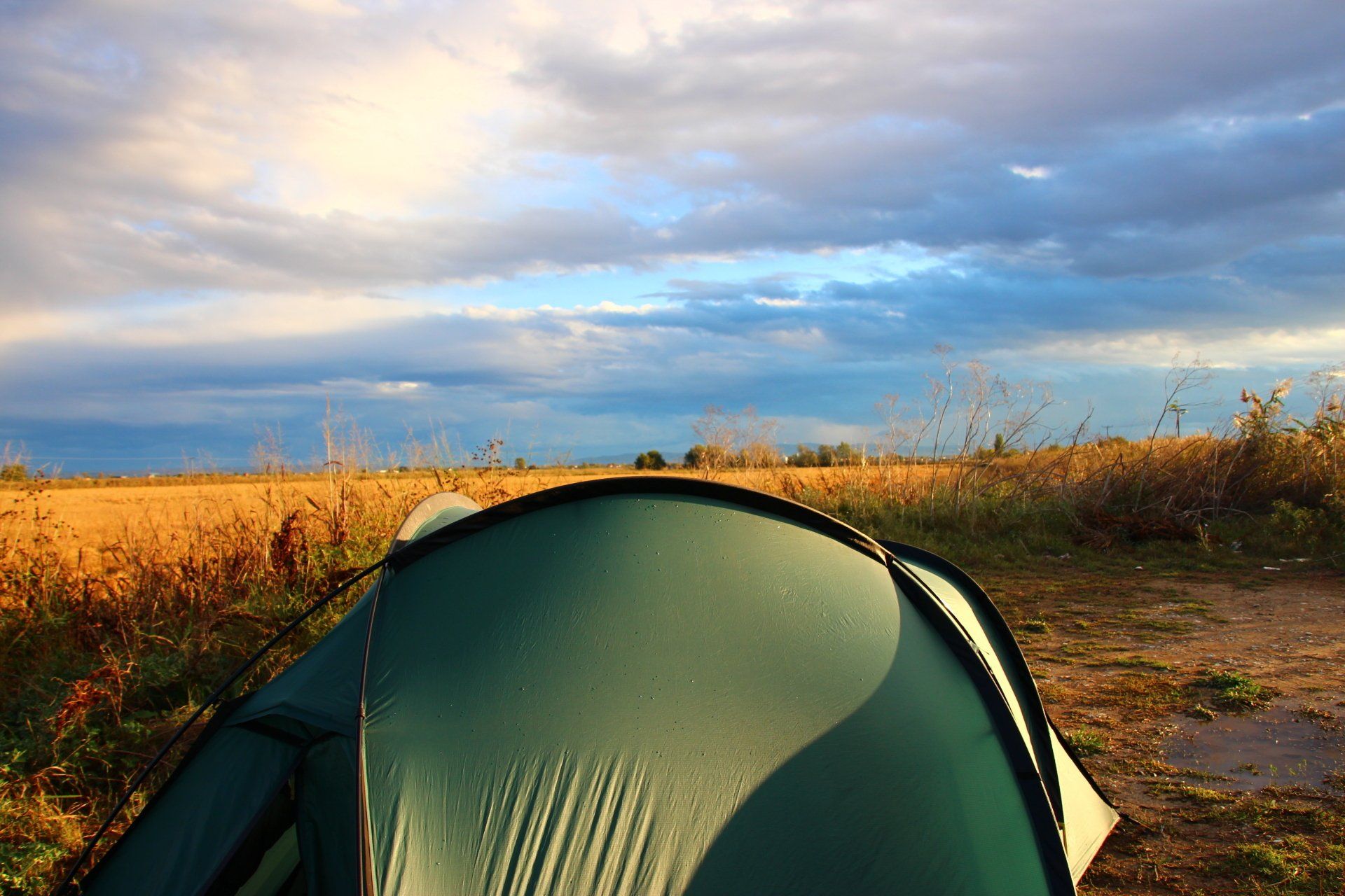 In der Nacht werden wir von starkem Regen und Wind geweckt, der am Zelt rüttelt. Als ich mich umdrehen möchte, bemerke ich, dass sich neben meiner Matte eine Pfütze gebildet hat. Oh nein, schießt es mir direkt durch den Kopf. „Hey! Unter und neben meiner Matte ist eine Pfütze!“ sage ich aufgeregt zu Basti. „Was! Wie ne Pfütze?“ antwortet er mir, richtet sich auf und schnappt sich die Kopflampe, die er immer direkt neben sich griffbereit liegen hat. Im nun hell erleuchteten Zelt sehen wir das Malheur. Durch den starken Seitenwind wird das Außenzelt so doll an das Innenzelt gedrückt, dass das herunterfließende Wasser zwischen Zeltunterlage und Zeltboden gelangt und sich schließlich dann irgendwann durch den Zeltboden drückt. „So ein Mist!“ ruft Basti. Ich krame schnell mein Handtuch raus, um alles halbwegs trocken zu legen. Basti macht das Zelt an der Kopfseite auf um zu schauen, ob er etwas von drinnen gegen das eindringende Wasser unternehmen kann. Er schafft es von innen soweit nachzuspannen, dass wenigstens kein neues Regenwasser zischen Zeltunterlage und Zeltboden gelangt. Mittlerweile habe ich das Zelt mit meinem Handtuch wieder halbwegs trocken gelegt. Aber gerade als Basti das Innenzelt schließt, verabschieden sich die Heringe vom Vorzelt. „Das darf doch wohl nicht wahr sein!“ brüllt er merklich wütend. Also macht er vorsichtig den Eingang vom Vorzelt auf und wir sehen, dass durch den starken Regen der Boden total aufgeweicht und matschig ist und der Wind nun leichtes Spiel hatte, die Heringe aus dem Boden zu ziehen. „Mist, Mist, Mist“ meckert Basti vor sich hin, während er versucht die Heringe wieder irgendwie fest in den Boden zu bekommen. Doch leider klappt es einfach nicht, da der Boden zu aufgeweicht ist. Nun geht er soweit raus ins nicht mehr ganz vorhandene Vorzelt, und macht hinter sich den Reißverschluss soweit zu, dass nur noch seine nackten Füße im Zelt sind. Ich hören ihn draußen fluchen und meckern. Ich suche ihm schon mal sein Handtuch raus. Nach kurzer Zeit kommt er wieder rein und ich reiche ihm sein Handtuch. „So das sollte jetzt halten. Ich habe die Heringe gegen unsere großen Packtaschen getauscht. Ich glaube die gehen nicht fliegen“ sagt er zu mir und trocknet sich ab. Wir legen uns wieder hin und wir hoffen einfach nur, dass der Wind und der Regen bald nachlassen. Irgendwann nicken wir beide weg. Am frühen morgen werden wir dann von unserem Wecker geweckt. Es hat aufgehört zu regnen und der Wind hat sich auch gelegt. Es scheint sonnig draußen zu sein, denn das Zelt ist hell erleuchtet. Wir ziehen uns an und Basti öffnet den Eingang zum Vorzelt, damit wir herausgucken können. Der Boden vor dem Zelt ist komplett aufgeweicht und matschig. Wir verpacken alles was trocken ist und Basti geht schon mal raus, um alles entgegen zu nehmen. Die nassen Matten legt er aufgeblasen auf unsere Taschen in die Sonne zum trocknen. Zum Glück sind nur die Matten von unten etwas nass geworden. Nachdem alles draußen ist, komme auch ich raus. „Unglaublich. In der Nacht war Weltuntergangsstimmung und jetzt scheint wieder die Sonne und es ist komplett windstill. Als wäre nie etwas gewesen“ sage ich zu Basti, als ich mich draußen umschaue. Die dicken schwarzen Wolken sind noch in einiger Entfernung am Himmel zu sehen. Basti ist gerade dabei das Zelt von außen ein wenig trocken zu wischen. Wir entscheiden uns heute uns bei dem Frühstücken etwas mehr Zeit zu lassen, sodass alles noch ein wenig trocknen kann. Ungefähr eine dreiviertel Stunde später ist auch schon alles wieder trocken. Naja, jedenfalls alles bis auf den Zeltboden. Da stand das Zelt ja drauf. Wir packen alles zusammen, beladen die Räder und fahren dann weiter.