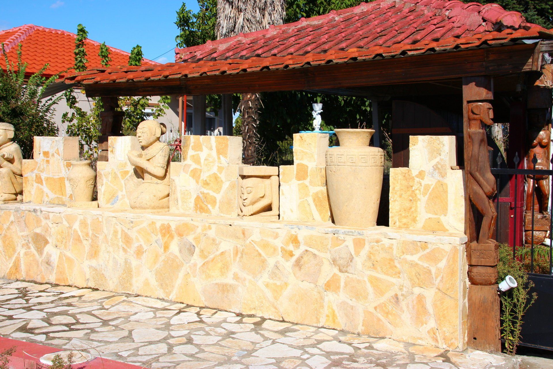 Nach ein paar Kilometern müssen wir eine alte große mit Holzplanken ausgelegte Brücke überqueren. Direkt hinter der Brücke müssen wir die geteerte Straße verlassen und auf einen Schotterfeldweg abbiegen. „Ob das eine gute Idee ist hier lang zu fahren? Ich meine, zwar sieht der Weg momentan noch gut aus, aber nachdem was die Nacht runter kam, kann es weiter hinten ganz schön blöd werden“ sage ich zu Basti, während wir anhalten. Er schaut auf das Navi und sagt dann zu mir, nachdem er wieder aufsieht „Also. In knapp 5Km kommt ein großer Fluss, sowie ein großes Flussdelta. Über diesen Fluss führt nur eine Brücke und zwar eine Autobahnbrücke. Wir haben jetzt zwei Möglichkeiten. 1. Wir nehmen diesen Weg. Der führt uns weiter Flussaufwärts zu einer Brücke, die keine Autobahn ist oder 2. wir fahren in 2Km auf die Autobahn und fahren dann für ca. 6Km über die Autobahn bis zur nächsten Abfahrt“. „Wäre es denn ein großer Umweg über die andere Brücke?“ frage ich ihn. „Mehr Strecke auf jeden Fall. Das wären ca. 16Km dann. Aber wir haben ja keinen Zeitdruck und ich fahre lieber ein paar Kilometer mehr durch die Natur, als auf der Autobahn“ antwortet er mir. Ich sehe das genau so. Also nehmen wir den kleinen Umweg. Denn wer weiß, was man sonst verpasst. Also weiter. Anfangs ist der Weg noch super, aber nach ein paar hundert Metern wird er schlechter. Viele Schlammpfützen zieren den Weg, sodass wir Schlangenlinien fahren müssen. In der nächsten Ortschaft namens Κλειδί (Klidi) angekommen, entdecken wir an einem Haus lustige Holz- und Steinstatuen. „Guck mal, der sieht so aus wie du, wenn du dich mal wieder voll gestopft hast“ sage ich lachend zu Basti. „Und die dahinter wie du. Bäh“ antwortet er mir und streckt mir die Zunge raus. Auf unserem Weg kommen wir noch durch zwei weitere kleine Ortschaften, ehe wir dann durch einen Tunnel fahren müssen, der unter einer anderen Autobahn verläuft. Und wie sollte es anders sein, natürlich steht hier das Wasser. „Augen zu und durch!“ ruft Basti und radelt los. Heile auf der anderen Seite angekommen, ruft er „Jetzt du“. Ok dann mal los. „Halt nur nicht an, sonst bekommst du nasse Füße“ ruft er mir zu, als ich gerade die Mitte erreicht habe. Anhalten? Nö! Und siehe da, ich habe es auch heile rüber geschafft. „Eigentlich hätten wir das filmen müssen“ sagt er zu mir, zieht die Kamera aus der Tasche und schaut erst mich an und nickt dann Richtung Tunnel. Ich schau ihn stirnrunzelnd an, nach dem Motto, das ist doch jetzt nicht dein Ernst. „Naja, ich würde es ja auch machen, aber ich muss ja filmen“ antwortet er mir und fängt an zu lachen. Jetzt muss ich auch anfangen zu lachen. Ach was soll´s, hat ja eigentlich Spaß gemacht. Also wende ich mein Rad und fahre wieder zurück. Auf der anderen Seite drehe ich erneut und Basti ruft mir zu „Kann los gehen“. Und wieder zurück. Drüben angekommen, sagt Basti „Mist, ich habe die Kappe drauf gelassen“ und lacht los. „Willst du mich vera......!“ frage ich ihn, sehe aber dann das er die Kappe in der Hand hält. „Du bist ja fies“ entgegne ich ihm. Er verstaut die Kamera wieder und wir fahren weiter.