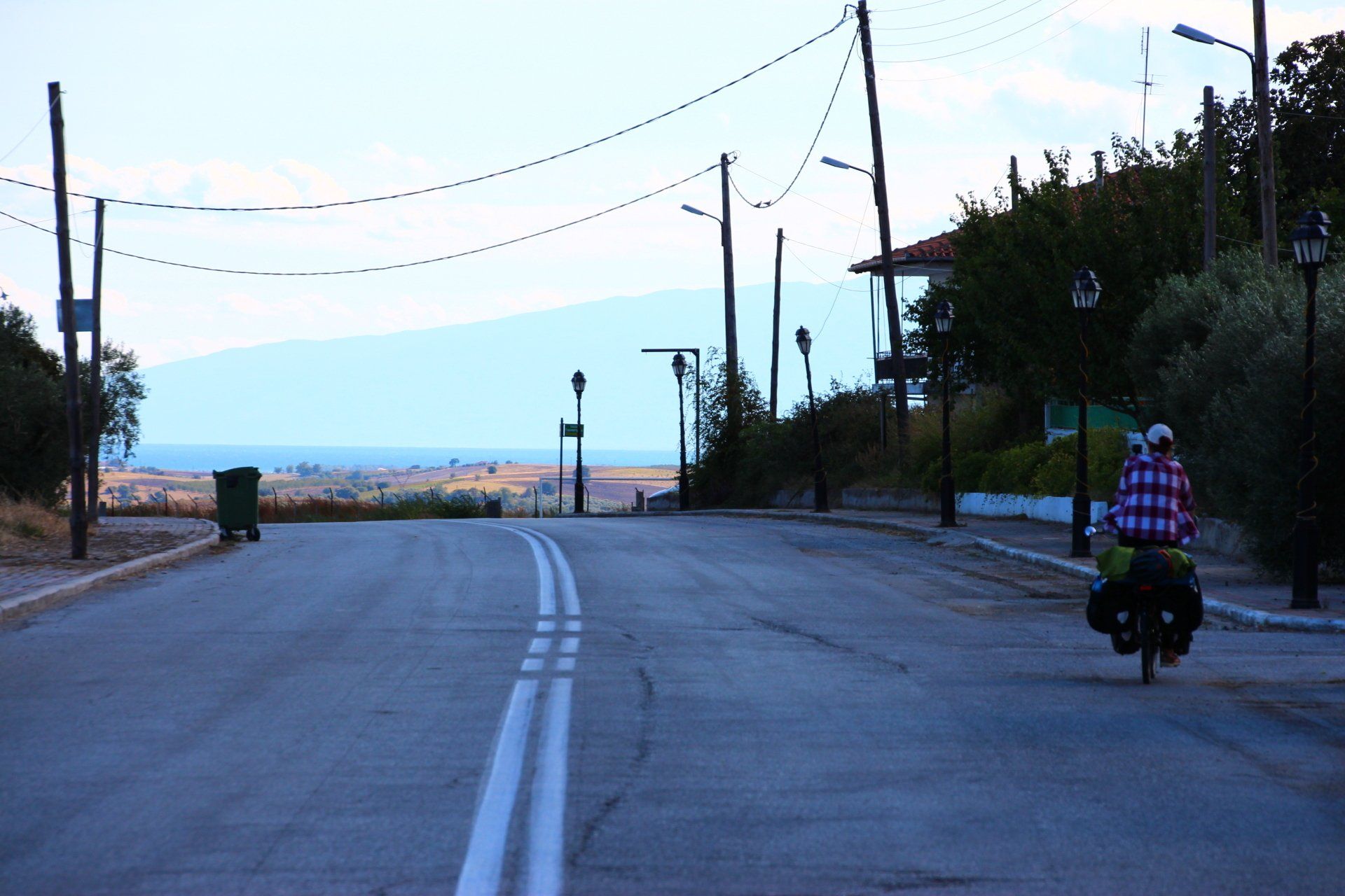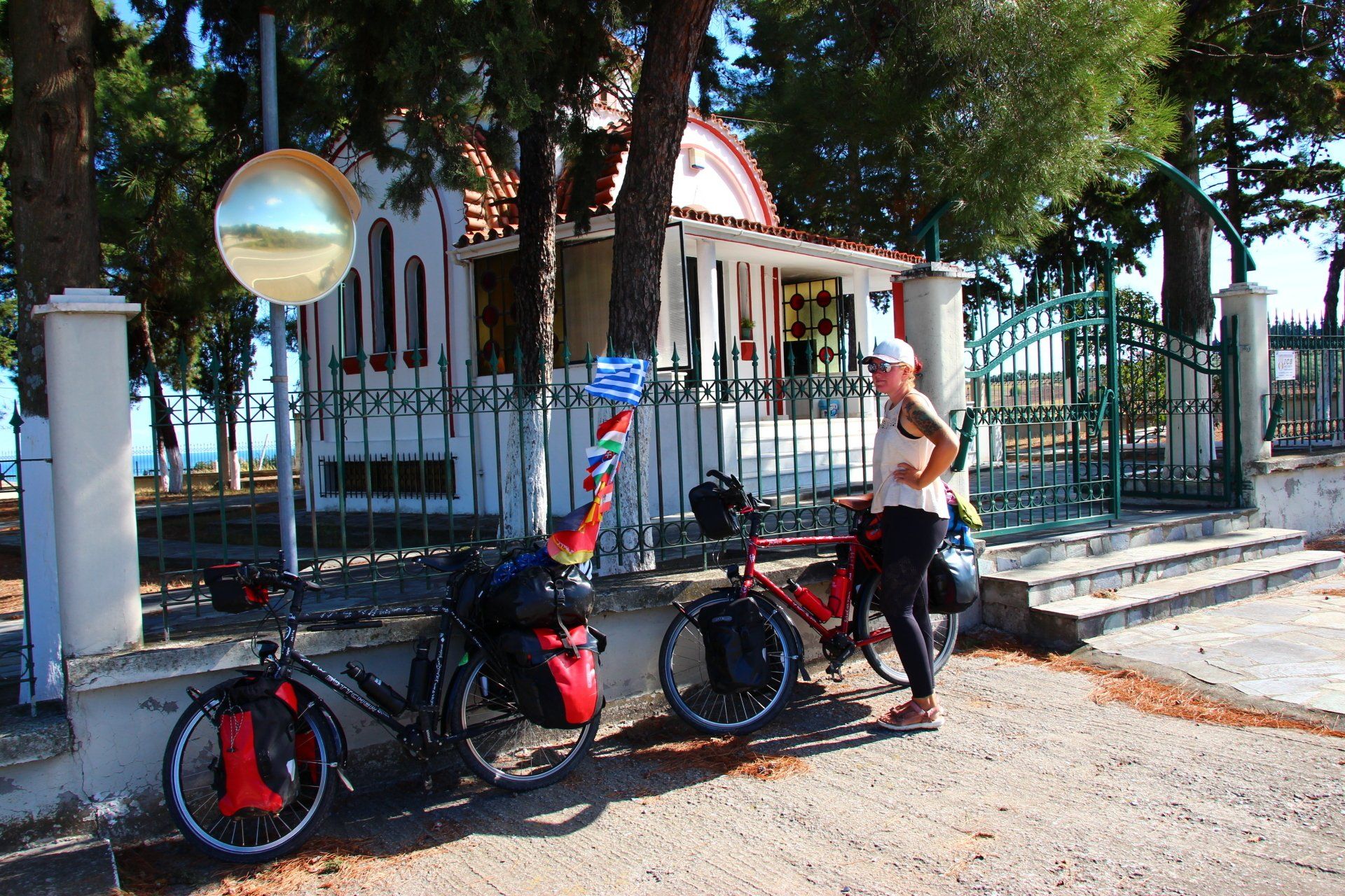 Leider hört der Asphalt nach ein paar Metern auf und wird zur Schotterpiste. Vorbei geht es an Apfelbäumen. Kurz bevor der Weg auf die Brücke führt hält Basti an, dreht sich zu mir um und sagt „Guck mal, die sehen total lecker aus“ und zeigt dabei auf die Äpfel. „Ja, aber wir können doch keine Äpfel klauen“ antworte ich ihm. „Ich glaube nicht, dass der Bauer etwas dagegen haben wird, wenn wir uns jeder einen Apfel nehmen“ antwortet er mir. Ja ok, denk ich mir. Die sehen aber auch wirklich lecker aus. Basti steigt ab, pflückt schnell zwei Äpfel und hampelt zu mir zurück. „Waschbärstyle“, gackert er. So, jetzt geht es einmal über die Brücke. Die Straße ist wirklich super geteert. Als wir an einer Tankstelle vorbei kommen, beschließen wir eine kleine Mittagspause einzulegen. Zu essen gibt es ein paar Kekse und die frischen Äpfel. Ein paar Kilometer später erreichen wir die Ortschaft Αιγίνιο (Eginio). „Da vorne kommt ein Supermarkt. Sollen wir kurz anhalten?“ fragt Basti mich und zeigt auf das Geschäft. „Ja“ antworte ich ihm und er fährt rechts ran. Wie praktisch, dass direkt gegenüber ein kleiner Stadtplatz mit Bänken und Bäumen ist. Während Basti draußen bei unseren Rädern bleibt, flitze ich schnell rein und kaufe Vorräte für die nächsten 2 bis 3 Tage ein. Nachdem ich wieder bei ihm bin, verpacken wir alles, fahren weiter und verlassen wieder die Ortschaft. Wenig später heißt es dann, bergauf fahren. „Bor sieht die Steigung fies aus“ sage ich zu Basti. Unser Weg führt unter einer Brücke durch und geht dann direkt hinter der Unterführung steil rauf, sodass man noch nicht einmal das Ende sehen kann. Basti hält an und ruft mir zu „Fahr du ruhig weiter. Ich will kurz ein paar Bilder machen. Ich hole dich eh ein“. Und auf ungefähr der Hälfte der Strecke zieht er an mir grinsend vorbei. Wie gemein, denke ich mir. Egal gleich geschafft. Oben angekommen, empfängt mich Basti jubelnd. „Komm wir machen hier an der kleinen Kapelle eine Pause. Da vorne gibt es auch einen Wasserhahn, da können wir auch unsere Wasservorräte wieder auffüllen“ sagte er zu mir. Wir schieben unsere Räder zu der Kapelle und ich setzte mich auf die Steinstufen die auf das Gelände der Kapelle führen, während sich Basti unsere leeren Wasserflaschen schnappt und sie auffüllen geht. Kurze Zeit später ist er wieder zurück, setzt sich zu mir und reicht mir eine Flasche mit kaltem Wasser. „Hier, noch ist es kalt“. In diesem Moment hält direkt vor uns ein weißes Auto mit rumänischem Kennzeichen. Aus dem Beifahrerfenster wird uns eine Kamera von einer jungen Frau entgegengehalten. Sie begrüßt uns auf englisch und fragt uns, ob die Straße die links abgeht Richtung Strand und zu einer Bar führt. Basti antwortet ihr, dass wir aus der Richtung der anderen Straße kommen, aber das die Straße die sie meinen zum Strand führt. Aber ob da eine Bar ist, wissen wir nicht. Dann erzählt sie uns, dass sie und ihr Freund, der am Steuer sitzt, aus Rumänien sind und eine Rundreise durch Griechenland machen und fragt uns, ob wir auch eine Rundreise durch Griechenland machen. Basti lacht und sagt ihr, ja so ungefähr. Nur das sich unsere Rundreise nicht nur auf Griechenland beschränkt. Die beiden im Auto staunen nicht schlecht, als Basti ihnen grob die Route erzählt. Sie wünschen uns noch eine gute Weiterreise und fahren weiter. Wir machen es ihnen gleich und schwingen uns wieder auf die Räder.