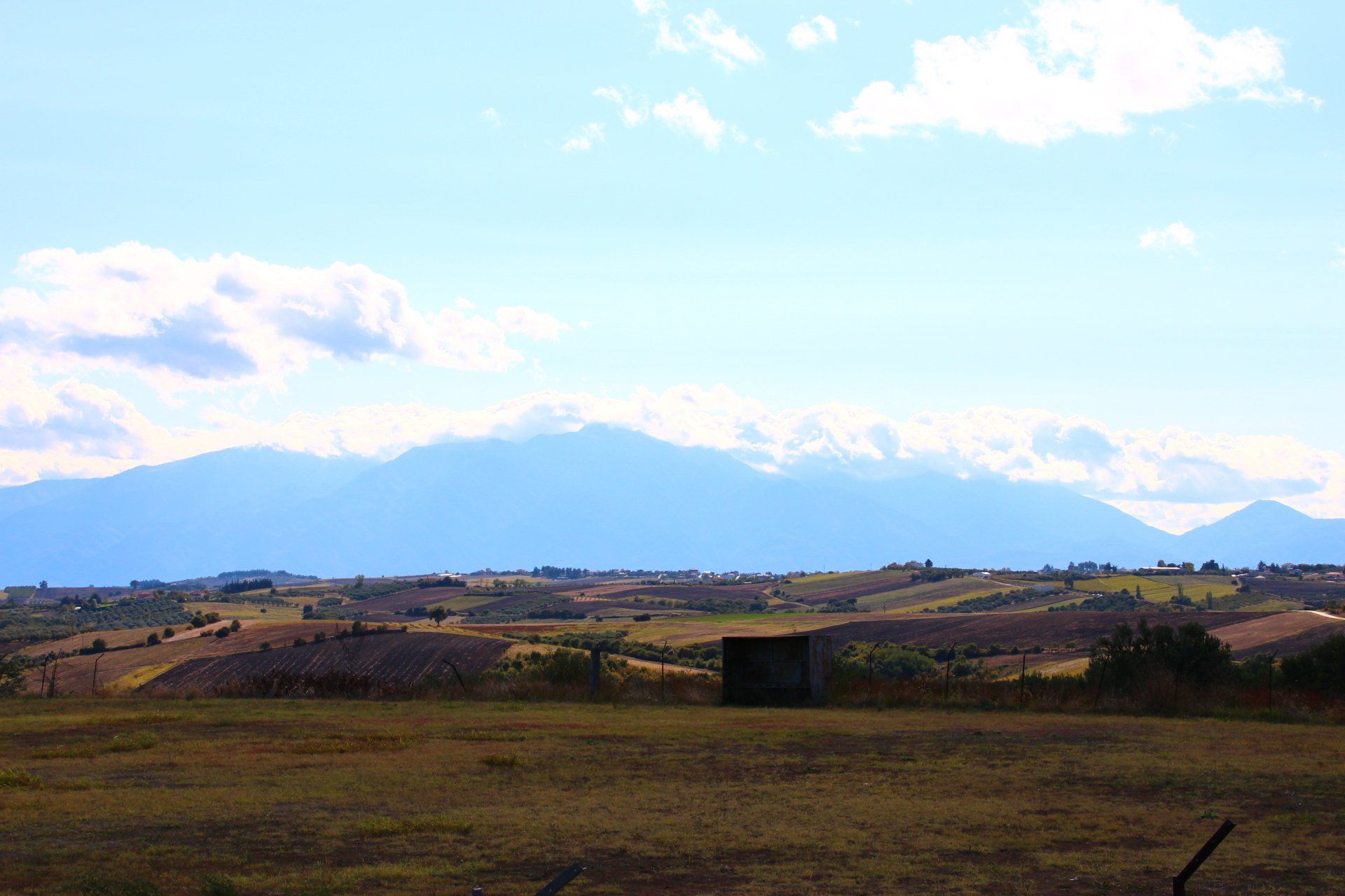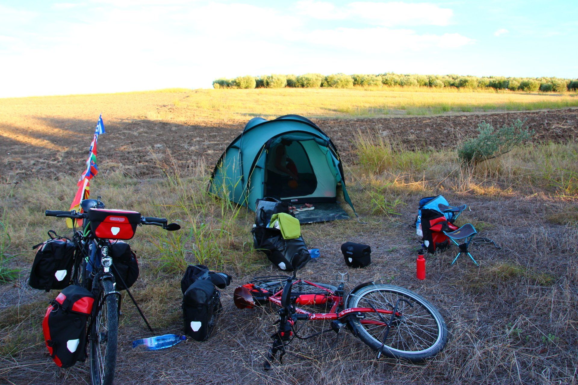 Hinter der nächsten Kurve geht es noch ein kleines Stück weiter bergauf, ehe es wieder ein Stück bergab zu einer Ortschaft geht. In der Ortschaft entdecken wir mehrere Bäume, die die Straße säumen. Sie tragen Früchte oder Knospen, die wir vorher noch nie gesehen haben. Auch nach einer langen Internet Recherche sind wir noch nicht schlauer geworden. Vielleicht wisst ihr ja, was das für Dinger sind? Am Ende der Ortschaft halten wir an. „Wow, guck mal. Man hat einen super Ausblick auf den Olymp. Unser erstes Ziel“ sagt Basti zu mir. Man hat wirklich einen super freien Blick auf den Olymp. Da es langsam dem Abend entgegen geht, halten wir ab sofort Ausschau nach einem Schlafplatz. Links und rechts von uns sind Felder, Felder und Felder. Es dauert eine Weile, bis wir etwas finden. An einem kleinen Feldweg, der zwischen einem Kiwifeld und einem Olivenfeld lang führt, halten wir an. „Ich guck mal ob wir hier was finden“ sagt Basti zu mir und läuft den Feldweg entlang. Nach nur wenigen Metern schon kann ich ihn wegen der Hecken, die zwischen den Feldern und der Straße liegen, nicht mehr sehen. Sichtschutz hätten wir also schon mal. Wenig später kommt er zurück. „Der Weg endet nach ein paar Metern auf einem gepflügten Feld. Wenn wir uns am Rand von dem Olivenfeld zu dem gepflügten niederlassen, sollte es kein Problem sein“. Wir passen den Moment ab, in dem kein Auto zu sehen ist. Uns muss ja nicht gleich jeder sehen. Wir suchen uns eine Stelle aus und stellen die Räder ab. Da wir noch eine Weile Sonnenlicht haben werden, beschließen wir erst zu kochen und zu essen bevor wir das Zelt aufbauen. Gerade als wir am kochen sind, kommt ein roter Pickup den Weg entlang und hält an. Ohje, hoffentlich gibt es keinen Ärger. Vier Männer steigen aus und gucken zu uns rüber. Basti steht auf und grüßt sie. Doch leider verspricht er sich und ruft ihnen „Kaliméra“ (Guten Morgen) statt „Kalispéra“ (Guten Abend) zu. Die vier Männer lachen und winken uns zu. Basti dreht sich zu mir um „Upps“. Die Männer verschwinden ins Kiwifeld, setzten sich auf den Boden und unterhalten sich. „Scheinbar wollen sie noch nicht nach Hause zu ihren Frauen“ sage ich lachend zu Basti. Während wir essen, gehen die Männer zurück zum Auto und wünschen uns noch eine gute Nacht, ehe sie ins Auto steigen und wieder fahren. Nach dem Abspülen schlagen wir das Zelt auf und verstauen alles, ehe wir uns schlafen legen.