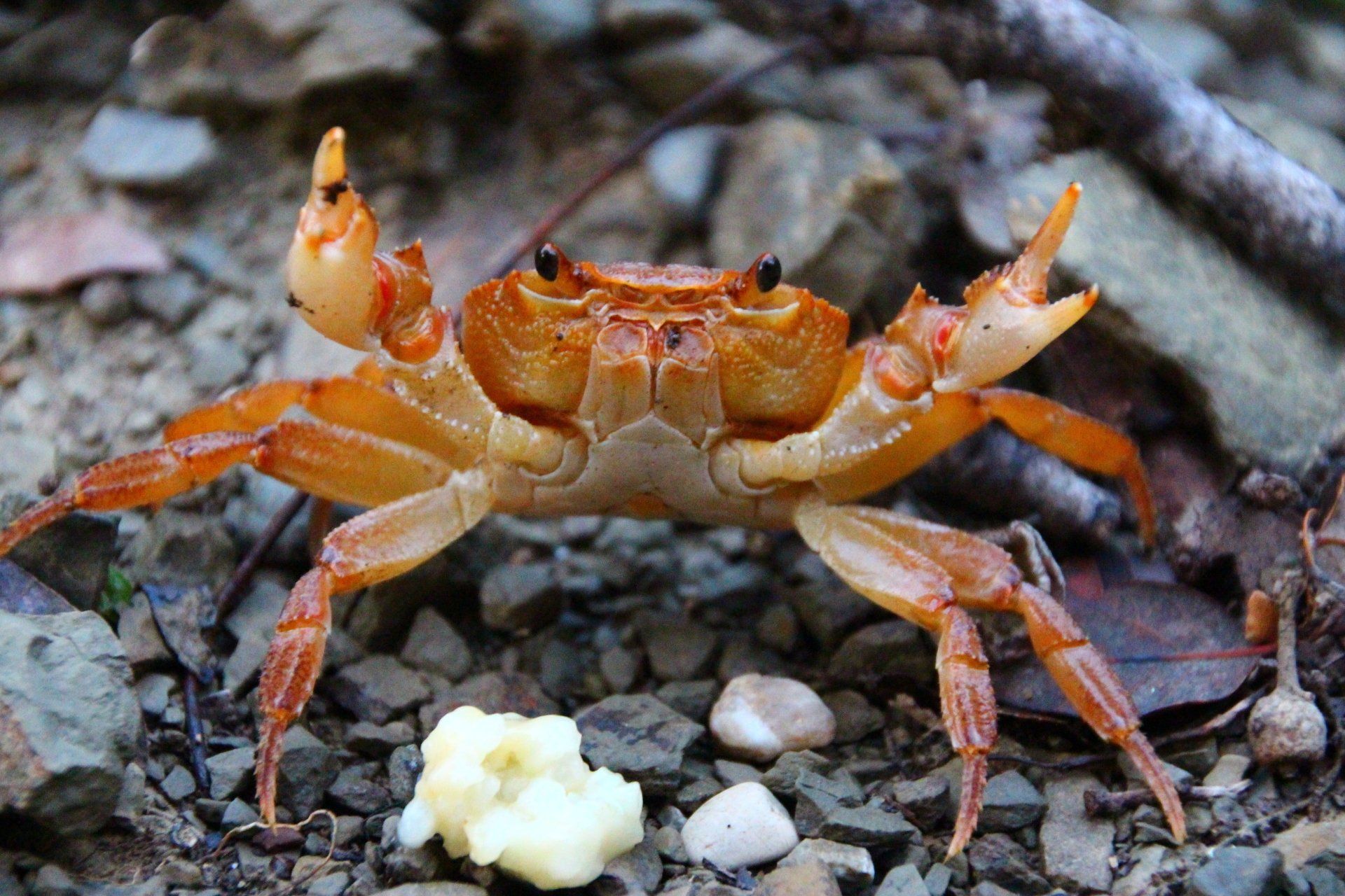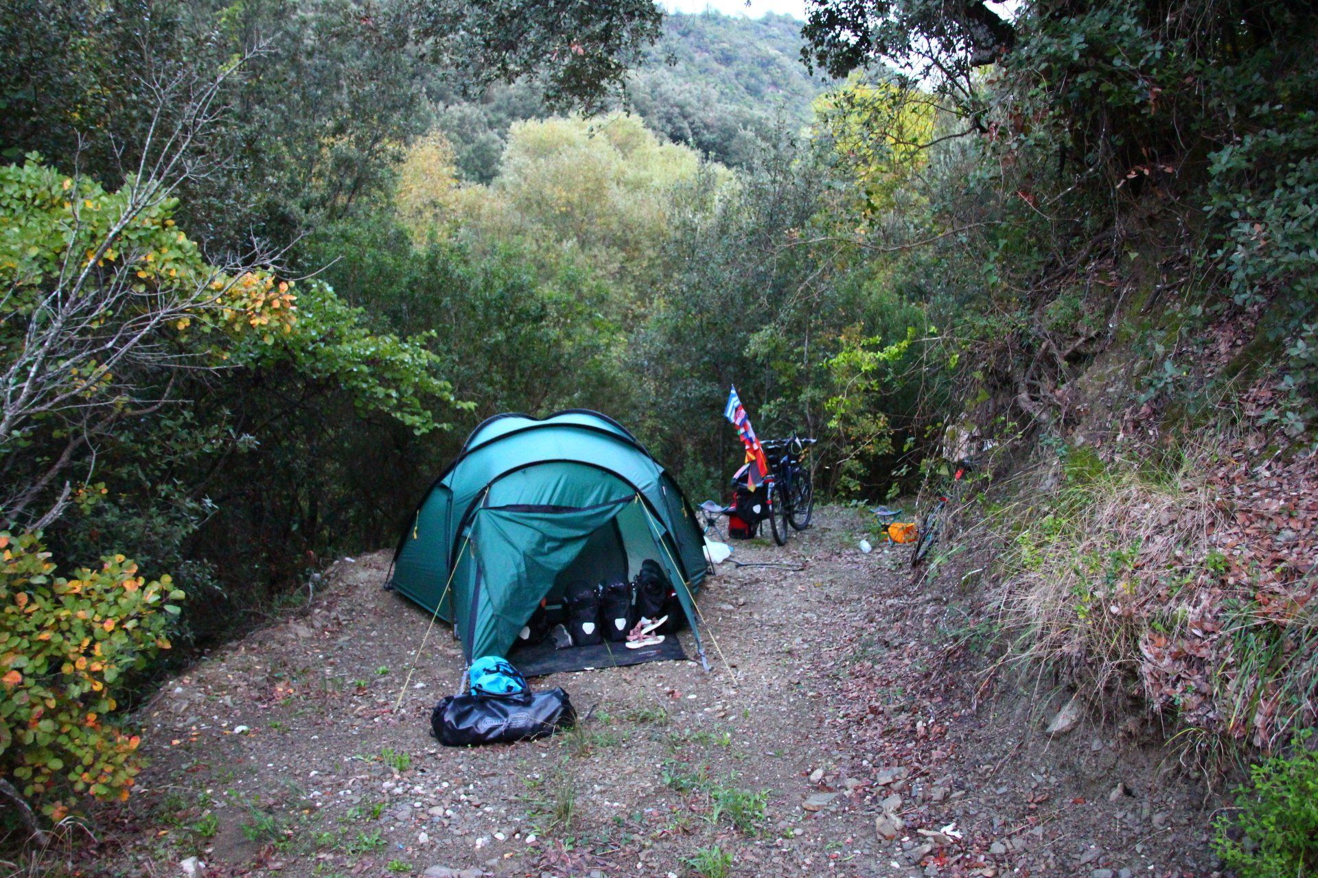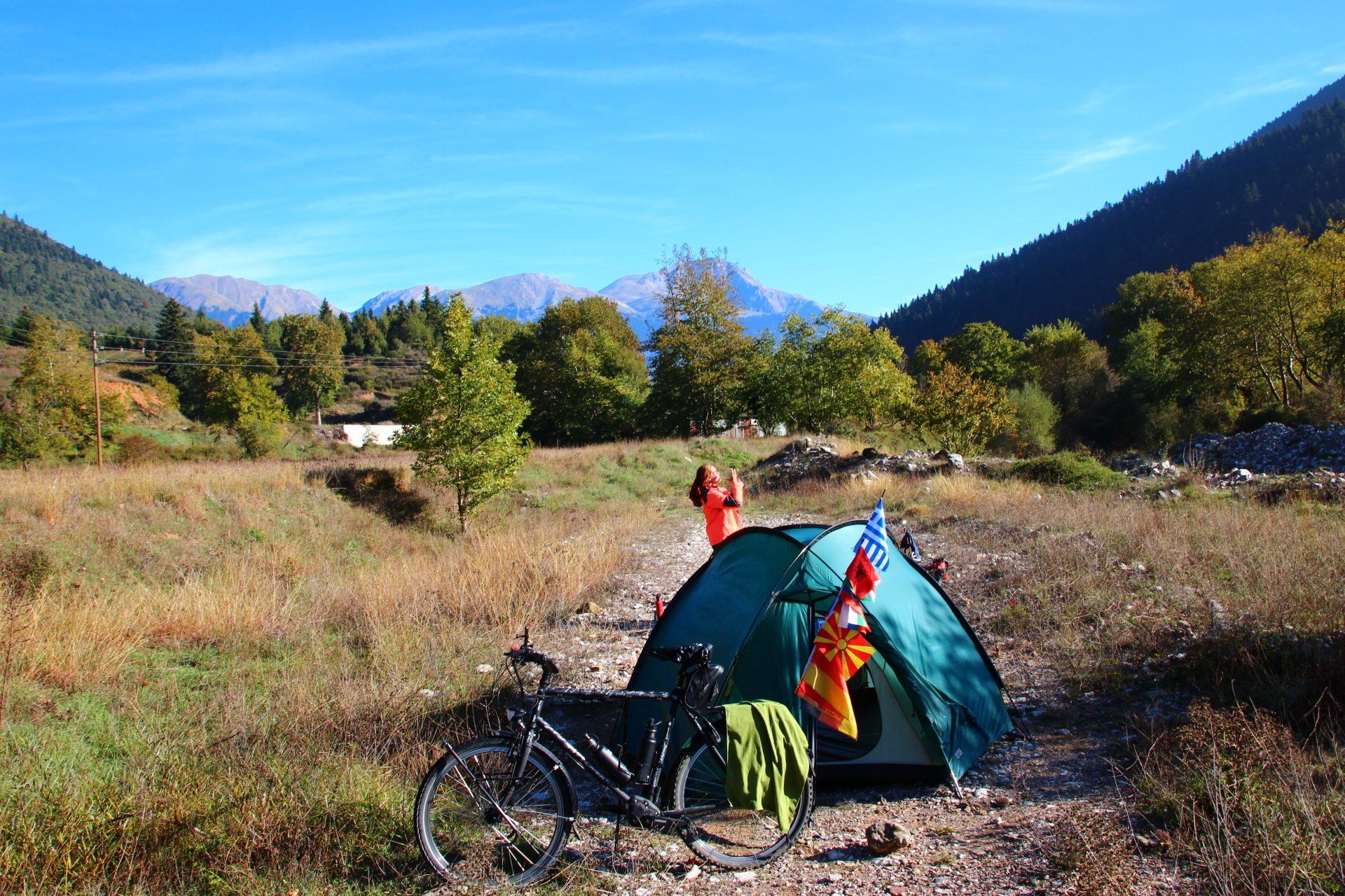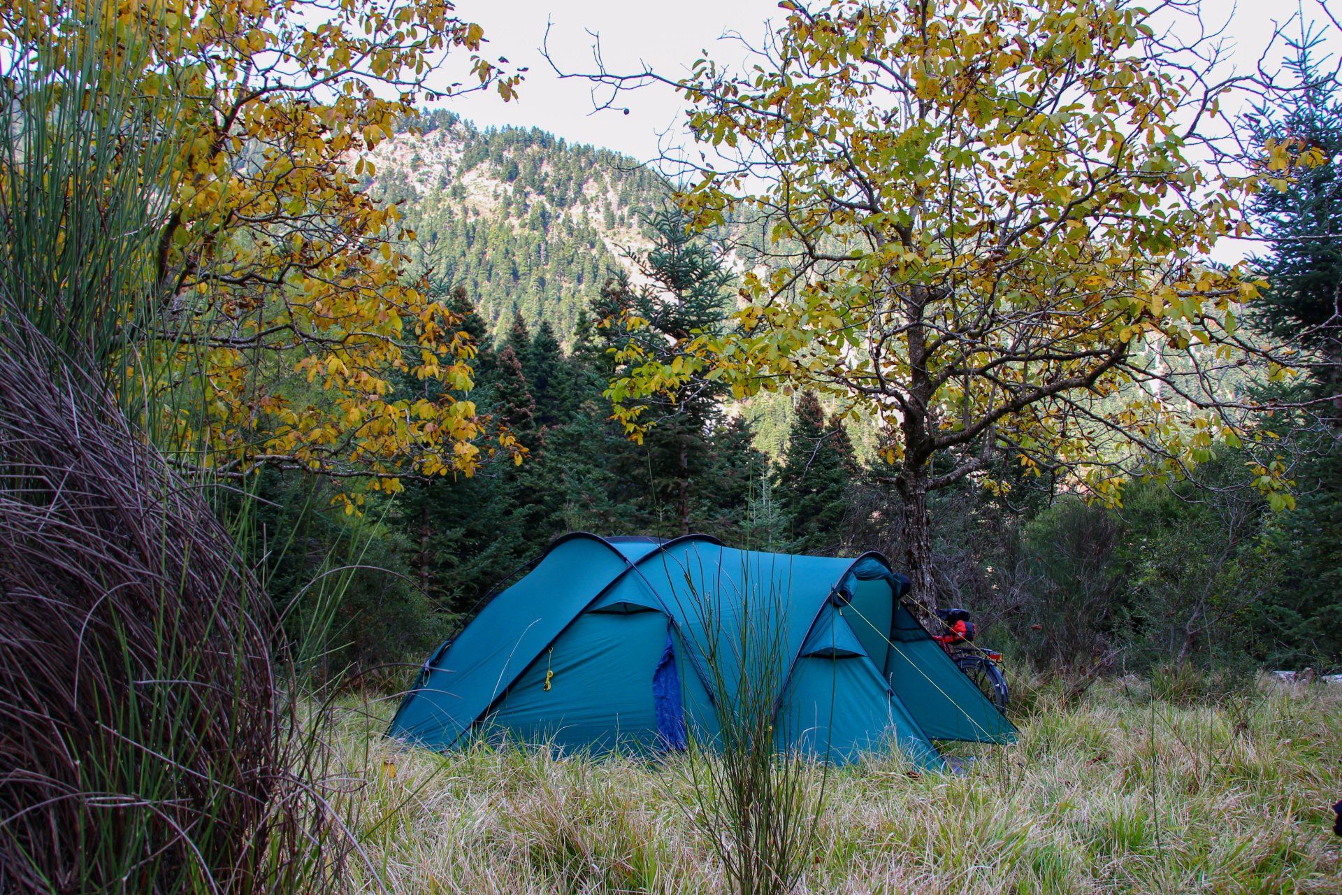 Wir kommen durch eine weitläufige flache Ebene. Links und rechts von der Straße stehen viele sehr alte und große Olivenhaine. „Bor, die müssen aber schon sehr alt sein“ sagt Jasmin. Am anderen Ende der flachen Ebene, beginnen wieder Berge. Aber diesmal nur Kleine im Vergleich zu dem was wir gerade hinter uns haben. In der Ortschaft Kato Makrinou haben wir nun die Qual der Wahl, wie wir weiterfahren wollen. Option A, kurz und schmerzlos einmal über die Hügel rüber oder Option B, ein bisschen mehr Strecke aber dafür nicht so steil und auf gut asphaltierter Straße. Nach kurzem abwägen und Blick auf die Karte, entscheiden wir uns für Option A. Doch nach den ersten Metern sollten wir schnell merken, nein doch lieber Option B. Denn direkt hinter Kato Makrinou geht es auf unbefestigten Weg gleich mal mit 18% rauf. Fahren ist nicht mehr möglich. Nach einem erneuten Blick auf die Karte, merken wir schnell, dass der Weg auch nicht wirklich besser werden soll. Da es auch schon mittlerweile nach 16Uhr ist und wir mit schieben nicht wirklich schnell vorankommen, entscheiden wir uns fürs umdrehen und doch lieber die asphaltierte Straße zu nehmen. Schon viel besser. In vielen Serpentinen geht es wieder rauf. Wenigstens ist nicht viel los. Nur selten kommen uns Autos entgegen. Auf unserem Weg kommen wir an einigen Ziegenställen vorbei. Auch hier merkt man noch die Auswirkungen des vor nicht all zu langer Zeit über Südgriechenland hinweg gezogenen Sturm (Mitte September 2020). Immer wieder sieht man neben der Straße Überbleibsel von Geröll, der die Berghänge runterkam. Die Straße ist aber mittlerweile wieder freigeräumt. Langsam neigt sich der Tag dem Abend entgegen. Doch leider sieht es momentan sehr schlecht aus, was die Schlafplatzsuche angeht. Seit knapp einer halben Stunde halten wir schon Ausschau, aber gefunden haben wir noch nichts. Hin und wieder führen kleine Trampelpfade von der Straße ab. Jedes Mal machen wir Halt und ich gucke, ob wir dort einen Platz für heute Abend finde. Aber leider jedes Mal Fehlanzeige. Entweder ist viel zu wenig Platz zwischen den Bäumen und dem Gestrüpp oder der Boden ist mit großen Steinbrocken überseht und somit ist es nicht einmal ansatzweise möglich, das Zelt aufzubauen. Meistens macht uns jedoch das Gelände selbst einen Strich durch die Rechnung, denn neben der Straße geht es meistens direkt steil rauf oder steil runter. Langsam ist die Motivation echt im Keller. Nach einer gefühlten Ewigkeit werden wir dann doch noch fündig. Zwar ist es nicht optimal, aber etwas besseres werden wir nicht mehr vor Einbruch der Nacht finden. Wir schieben unsere Räder den kleinen Pfad entlang bis zur einer kleinen Stelle, die gerade so ausreichend ist für unser Zelt. Der Pfad führt noch ein paar Meter weiter und endet dann an einem kleinen Bachlauf. Da es schon sehr bald dunkel wird, kochen wir uns schnell etwas zum Abendessen. Während Jasmin nach dem Essen abspült, baue ich das Zelt auf. „Hey guck mal! Wir haben Besuch. Hey Kleiner, ganz ruhig“ sagt Jasmin zu mir und zeigt auf unseren kleinen Besucher. Ich gehe zu ihr rüber und schaue mal nach dem Rechten. „Oh, ein kleiner Krebs“ antworte ich ihr. Kurz nachdem wir uns ins Zelt verkrochen haben, ist es auch schon dunkel. Jetzt wird geschlafen.
