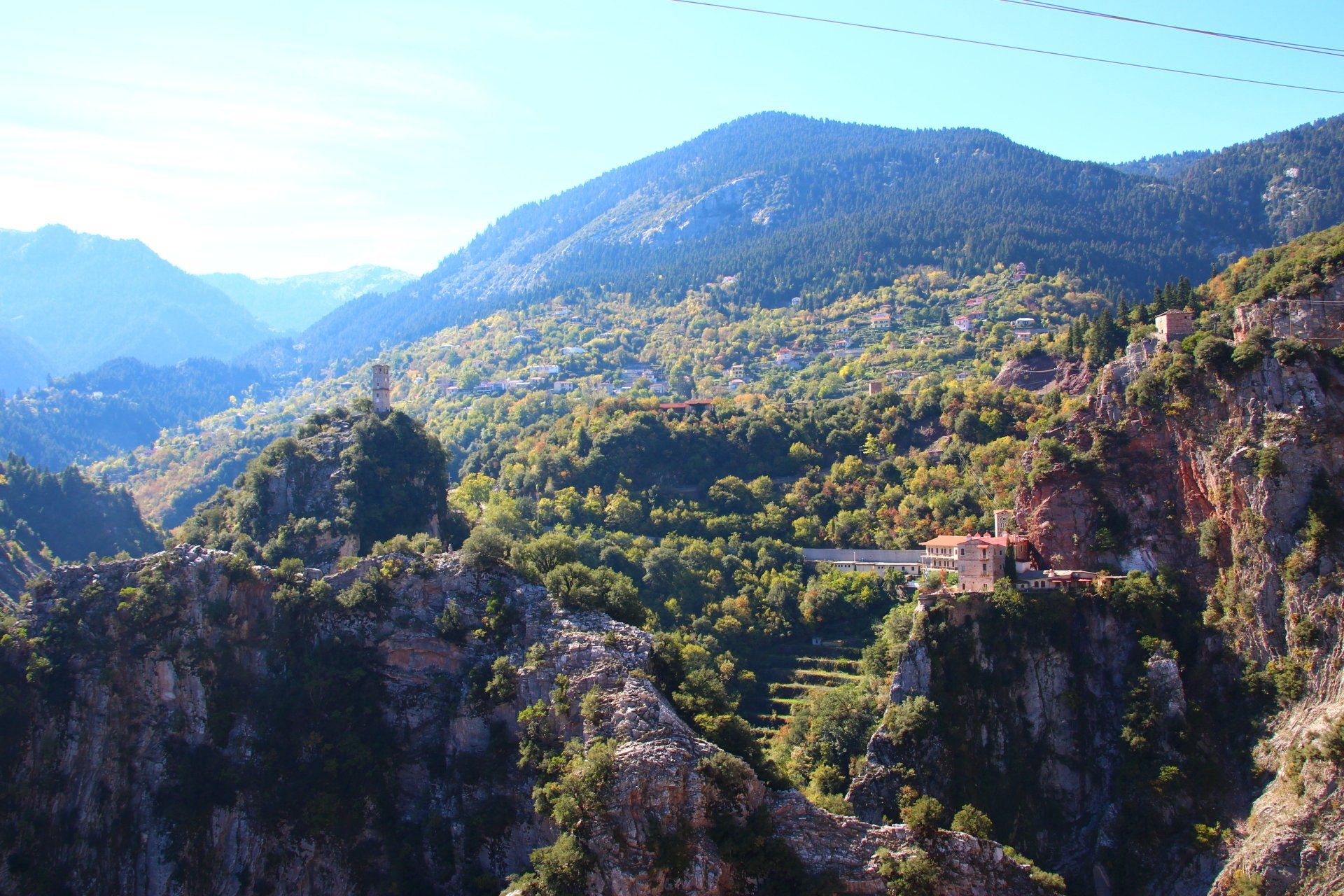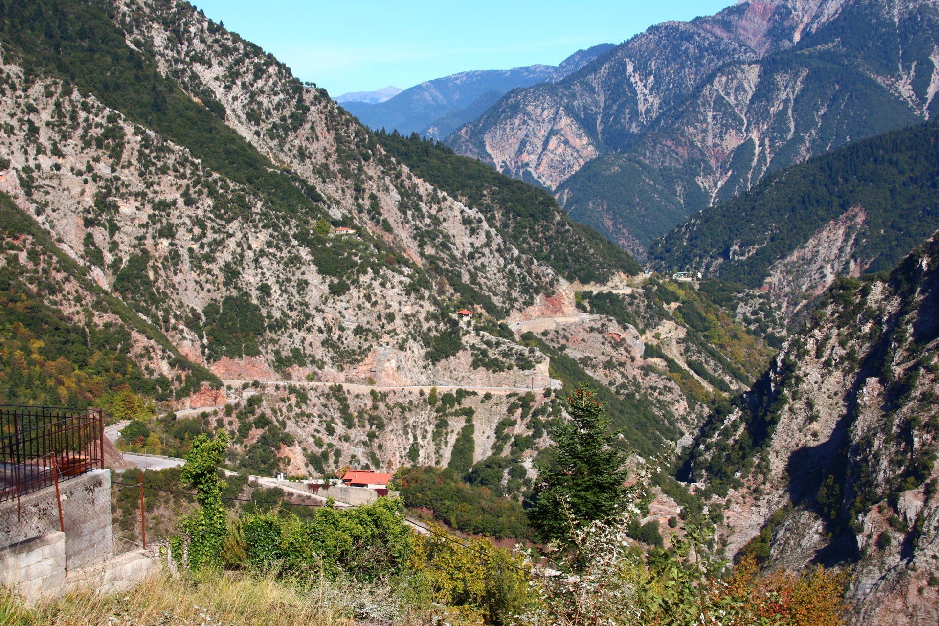 Irgendwann haben wir die tiefste Stelle des Canyons erreicht. Dort trifft der Fluss Karpenisiotis, den wir die ganze Zeit gefolgt sind, auf den größeren Rema Krikeliotis. Für uns geht es aber über eine große Brücke weiter geradeaus. Von der Brücke aus kann man noch die Überreste der alten Brücke sehen. Direkt hinter der Brücke geht es dann mal gleich mit 12% bergauf. Das wird sich auch erst einmal nicht wirklich sonderlich ändern. Mal sind es nur angenehme 4%, dann wieder 12% oder auch schon mal nette 17%. Hilft ja alles nichts. Da müssen wir jetzt durch. Wenigstens ist die Landschaft wunderschön. Das entschädigt alles. Wir folgen der sich durch die Berge schlängelnden Straße immer weiter rauf. Hinter einer Kurve öffnet sich dann auf einmal der Canyon und gibt einen wunderschönen Blick auf die Landschaft frei. Direkt gegenüber von uns liegt mitten in die Berge gebaut, ein Klosterkomplex. Dabei handelt es sich um das Prousos-Kloster. Wir beschließen einen kurzen Halt zu machen, um die Aussicht genießen zu können. Also stellen wir unsere Räder soweit wie möglich am Straßenrand von der Straße entfernt ab. Gar nicht so leicht, wenn direkt neben der Straße die Felsen in die Höhe ragen. Auch der Verkehr hat merklich zugenommen. Grund dafür ist, dass hier gleich drei Hauptverkehrsstraßen zusammen laufen. Ein paar Meter hinter uns steht ein Auto am Straßenrand, mit mehreren Personen. Während wir die Aussicht genießen und ein paar Fotos machen, kommt ein jüngeres Mädel von der Gruppe zu uns rüber. Sie spricht uns auf englisch an und fragt, ob wir Deutsche seinen. Etwas verwundert antworte ich ihr „Yes, Why?“ Sie fängt an zu lachen und ruft zu ihrem Vater auf griechisch „Siehst du, habe ich doch gesagt“. Sie wendet sich wieder an uns und bedankt sich und klärt uns auf. Als wir an ihnen vorbei gefahren sind, meinte sie zu ihrem Vater, dass sind bestimmt Deutsche. Nur Deutsche machen so etwas verrücktes. Ihr Vater war anderer Meinung und sie haben um 5€ gewettet. Um nun herauszufinden wer Recht hat, musste sie uns natürlich fragen. Wir fangen an zu lachen und beglückwünschen sie zu ihrem Sieg. Weiter geht’s. Wir folgen der Straße, die auch direkt am Kloster vorbei führt. „Guck mal, da vorne ist eine Pausecke mit Bänken“ sage ich zu Jasmin. Wir stellen unsere Räder wieder am Fahrbandrand ab und gehen zu den Bänken und machen eine kleine Naschpause. Diese haben wir uns ja auch schließlich nach dem ganzen bergauf fahren redlich verdient. Nach einer Weile heißt es dann aber wieder rauf aufs Rad. Knapp einen Kilometer später kommen wir durch ein kleines Dorf Namens Prousos. Ein schnuckliges kleine Bergdorf. Kurz hinter Prousos finden wir einen kleinen Rastplatz, unter ein paar großen Bäumen mit Bänken und einem Brunnen. Auch hier machen wir wieder Halt. Aber diesmal nur kurz, um unsere Wasservorräte aufzufüllen. „Schade das es noch so früh ist, hier wäre ein wirklich schöner Platz zum schlafen“ sagt Jasmin zu mir. „Das stimmt, aber direkt an der Straße, ich weiß ja nicht“ antworte ich ich lachend. Nachdem Wassersack und Flaschen wieder voll sind, geht es weiter. Weiter bergauf. Als wir knappe 4km später an einer kleinen Grünfläche vorbei kommen, beschließen wir für heute Schluss zu machen. Auch wenn es gerade mal kurz nach 15 Uhr ist. Genug bergauf gefahren für heute. Außerdem darf man nicht zu wählerisch sein, was die Platzwahl in den Bergen angeht. Also steigen wir ab und schieben unsere Räder auf die Grünfläche und suchen uns einen Platz aus. „Na, ist doch perfekt! Von der Straße aus kann man uns so gut wie nicht sehen“ sage ich zu Jasmin. „Finde ich auch“ antwortet sie mir. Wir bauen das Zelt auf und machen uns anschließend etwas warmes zu essen. Kurz abspülen und dann den Rest des Tages genießen. Ich nutze die Zeit, um mir mal die Umgebung etwas genauer anzusehen. So klettere ich ein wenig durch die Gegend. Als dann die Sonne langsam hinter den Bergkuppen verschwindet, bin ich aber dann auch wieder zurück. „Da bist du ja wieder“ begrüßt mich Jasmin. Als die Sonne dann ganz verschwunden ist, verkriechen wir uns ins Zelt.