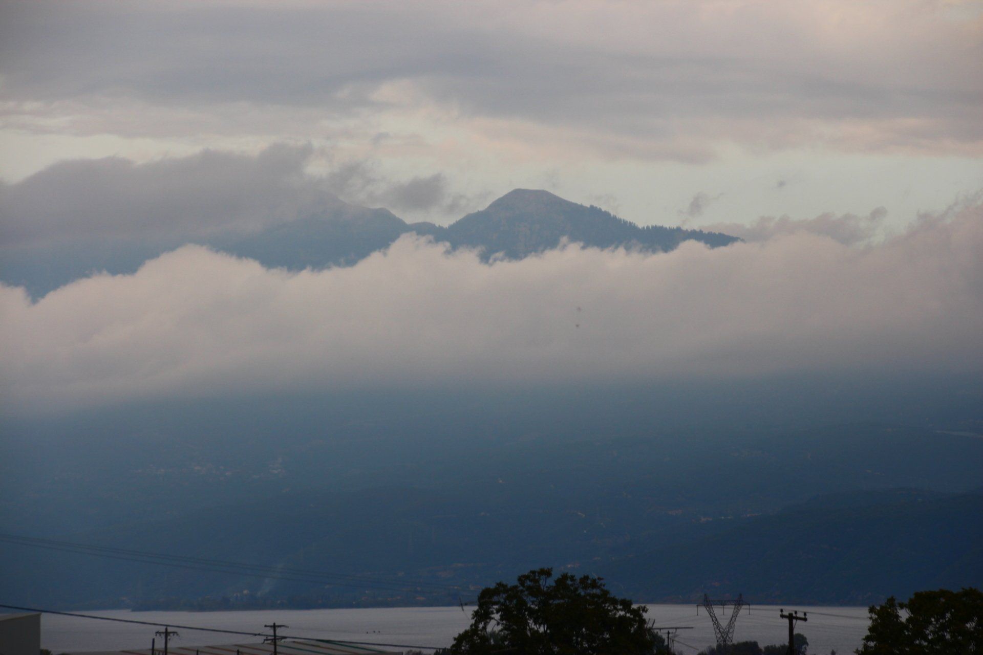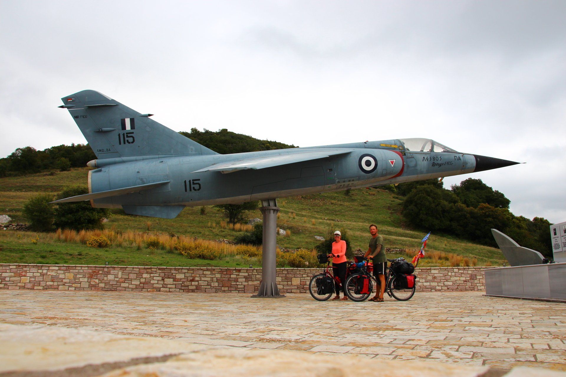 Nach einer ruhigen und erholsamen Nacht, geht es weiter. Wir machen da weiter, wo wir gestern aufgehört haben. Bergauf fahren. Zum Glück ist es nicht mehr weit bis zum höchsten Punkt, denn wir befinden uns aktuell auf 1009hm und es geht nur noch rauf bis auf 1438hm. Zwar ist es am heutigen Morgen nicht so kalt wie gestern, aber dafür ist es leider bewölkt. Nach 7,5km haben wir dann den Bergkamm erreicht. Jetzt geht es satte 40km bergab. Das heißt, warm anziehen. Schnell die Jacke übergezogen und dann geht es los. Wir rollen die kurvenreiche Straße bergab. Wir kommen an mehreren kleine Kapellen vorbei. Was uns auffällt, ist das uns immer wieder Autos mit gut angezogenen Insassen entgegen kommen. Es dauert einen Moment, bis wir eins und eins zusammengezählt haben. Es ist Sonntag Vormittag, dass heißt sie sind auf den Weg zur Kirche. Die eine Hälfte winkt uns zu und die andere Hälfte guckt uns nur verwundert an, ganz nach dem Motto, was sind das denn für Verrückte. Wir winken ihnen einfach mit einem Lächeln im Gesicht zurück. Alle paar Kilometer kommen wir an kleinen Tavernen vorbei. Dort wird schon mal das Essen vorbereitet, für die Kirchen Rückkehrer. Heute steht Zieglein auf der Speisekarte. Auf einem großen Drehspießgrill drehen sich die armen Ziegen. Nach einer gefühlt endlosen Abfahrt, erreichen wir das Ende der Bergkette, die sich einmal von Nord nach Süd durch die Mitte Griechenlands zieht. An einer Bank am Straßenrand machen wir Halt. Während wir dort pausieren, ziehen dunkele Wolken auf. „Na hoffentlich bleibt es trocken“ sagt Jasmin. Da der Wind die Wolken Richtung Gebirge drückt, also genau in die Richtung aus der wir gerade kommen, hoffen wir, dass wir von Regen verschont bleiben. Also schnell weiter. Und wir sollten Glück haben. Es bleibt für den Rest des Tages trocken und es kommt sogar ein wenig die Sonne raus. Unser Weg führt uns weiter Richtung Süden. Dabei umfahren wir einmal den wirklich großen See Limni Trichonida. Während wir ihn umfahren, kommen uns mehrere Rennradfahrer entgegen, die uns ganz begeistert zujubeln und eine schöne Reise wünschen. Kurz vor der Ortschaft Thermo treffen wir wieder auf einen alten Kampfjet. Auch diesmal halten wir an und machen eine kleine Pause. Anschließend geht es durch Thermo. Leider finden wir keine heißen Quellen, um uns aufzuwärmen. Also weiter.