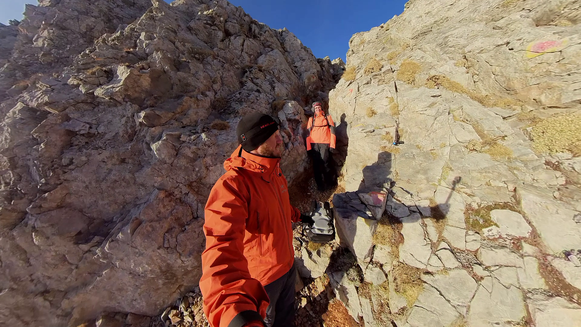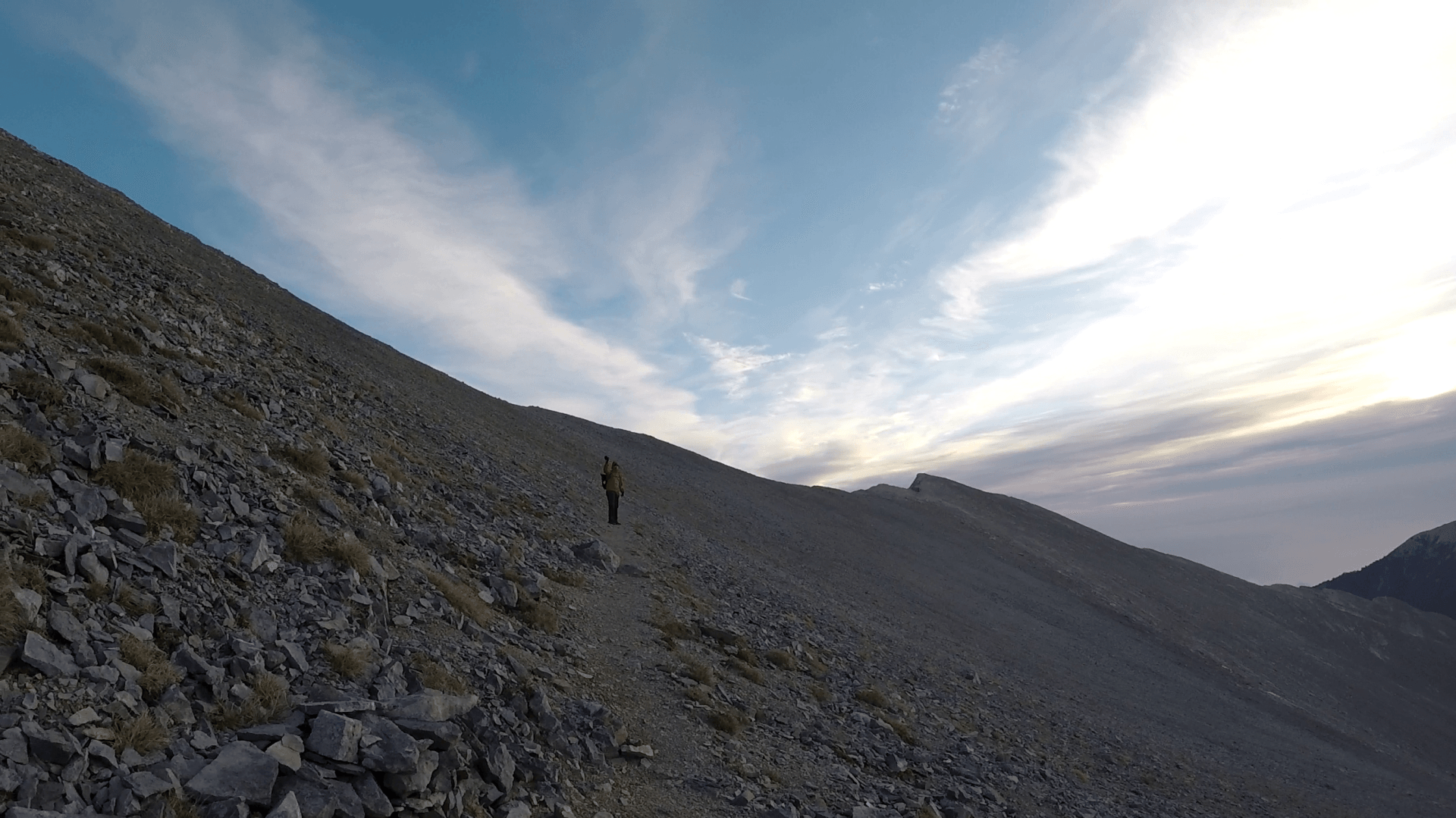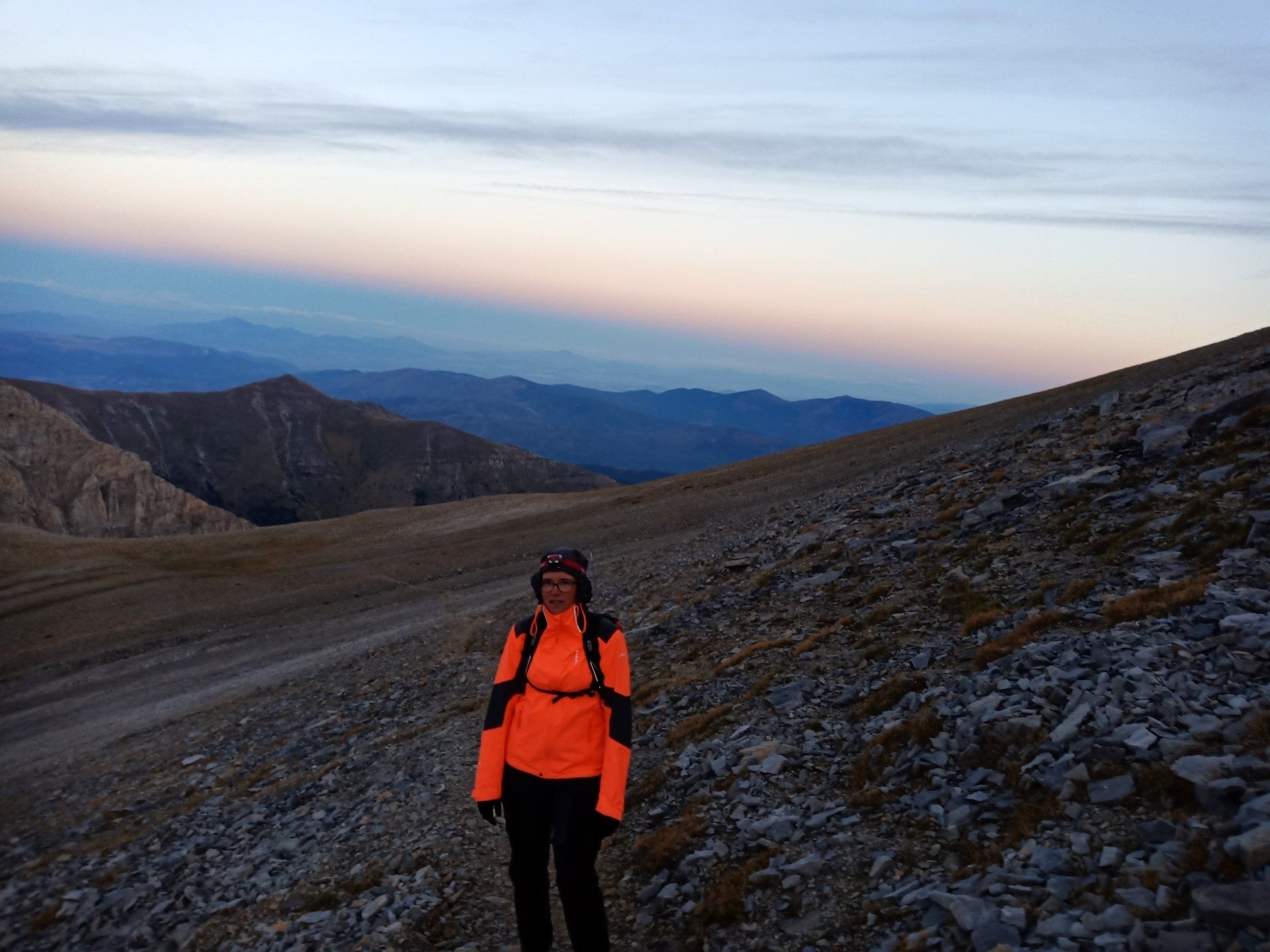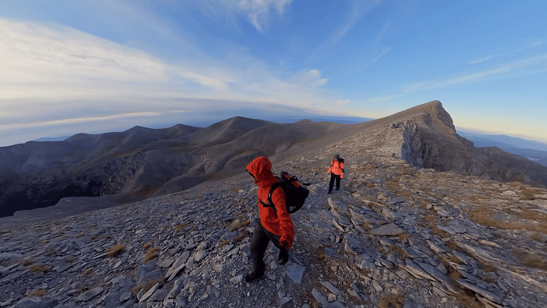 Leider hat der eisige Wind nicht nachgelassen. Wenigstens sind keine Wolken zu sehen. Hinter der Bergkuppe sieht man schon, wie es langsam heller wird. Leider werden wir es wohl nicht ganz bis zum höchsten Gipfel zum Sonnenaufgang schaffen. In einigen Metern Entfernung sehen wir zwei Hunde. Einer von ihnen scheint ein Welpe zu sein, der sich hinter ein paar größeren Felsbrocken zu verstecken versucht, aber immer wieder neugierig den Kopf herausstreckt. Der andere Hund, scheinbar die Mama, fängt an zu bellen als sie uns sieht. „Hey, ganz ruhig. Wir tun dir doch nichts“ sagt Basti ruhig zu ihnen, während wir an ihnen vorbei gehen. Kaum sind wir an ihnen vorbei, beruhigt sie sich wieder und hört auf zu bellen. Jetzt geht es steil rauf. Wir folgen dem kleinen Wanderpfad, der mit Wegpfeilern markiert ist. Oben angekommen, befinden wir uns auf einem kleinen Plateau und haben direkten Blick auf den Skala Gipfel (2866hm) und den höchsten Punkt des Olymps, Mytikas mit 2918hm. Was für eine wunderschöne Aussicht. Hinter Mytikas sind die ersten Sonnenstrahlen zu sehen. Jetzt sind es nur noch wenige Meter bis zu Skala. „Schön wieder hier zu sein“ sagt Basti, als wir bei Skala ankommen. Es ist nicht das erste Mal das wir hier stehen. In den letzten Jahren ist es bei uns zur Tradition geworden, wenn wir zu Besuch bei Bastis Großeltern in Griechenland sind, einmal den Olymp zu besteigen. Diese Tradition wollten wir natürlich fortführen. Von Skala aus hat man einen wirklich beeindruckenden Ausblick auf den Kakoskala Grat, der zum Gipfel (Mytikas) führt. Auf diesem Grat muss man jetzt entlang krachseln um zu Mytikas zu gelangen. Für geübte Kletterer und Wanderer an sich kein Problem. Solange man schwindelfrei ist. Doch leider ist der Wind ziemlich stark und es sind immer wieder starke Böen dabei. Nicht gerade optimal, wenn man auf einem Grat lang klettern möchte. Wir stellen uns in eine einigermaßen windstillen Ecke und beratschlagen uns kurz, ob wir trotz des Windes zum Gipfel klettern wollen oder nicht. Am Ende entscheiden wir uns dafür, dass ich hier warte und Basti alleine zum Gipfel klettert. Die Windböen sind so stark, das ich mich teilweise nicht auf den Beinen halten kann. Das ist mir dann doch zu gefährlich. „Pass ja auf“ sage ich noch zu ihm, ehe er aus meinem Sichtfeld verschwindet. Immer wieder sehe ich ihn, wie er Mutterseelen alleine auf dem Grat entlang klettert. Vom ganzen auf der Stelle stehen wird mir ganz schön kalt. Zwar wärmen mich die Sonnenstrahlen ein wenig, aber der eisige Wind bringt mich echt zum frösteln. Dann sehe ich Basti, wie er an der Gipfelfahne steht und mir zuwinkt. Super, er hat es geschafft. Jetzt bin ich echt ein wenig neidisch, dass ich nicht mit geklettert bin. Er macht ein paar Fotos und Videos und trägt sich anschließend noch ins Gipfelbuch ein, ehe er sich wieder auf den Rückweg macht.