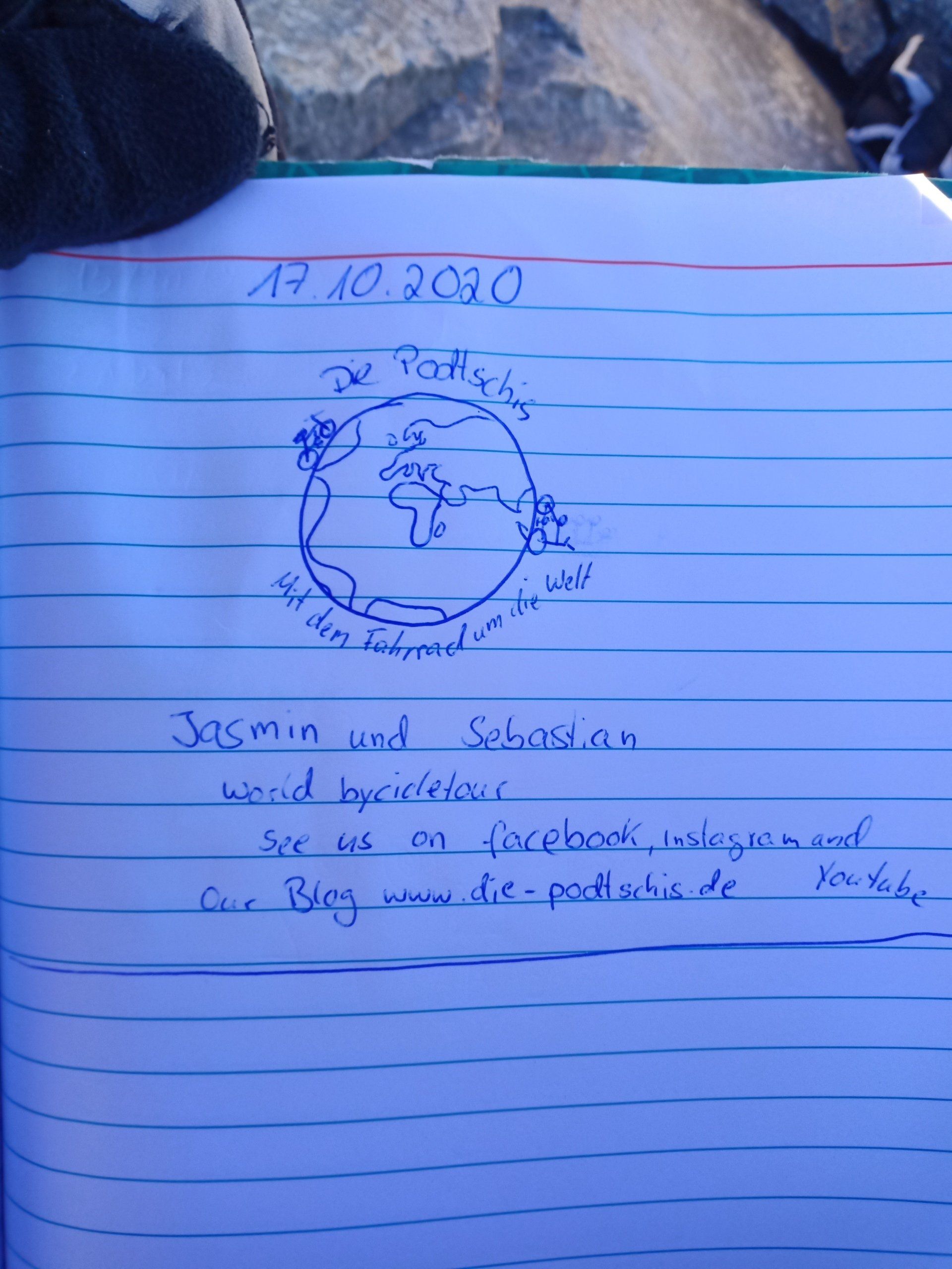 Mitleerwille sind auch einige Bergsteiger am Skala Gipfel angekommen, die sich ihre Kletterausrüstungen anziehen um auch den Gipfel zu besteigen. Es scheinen geführte Touren zu sein, denn einer von ihnen erklärt den anderen, wie man die Ausrüstung richtig anlegt. Außerdem hat er ein Logo von einer Abenteueragentur auf der Jacke. Doch ehe sich die Gruppe auf den Weg macht, ist Basti schon wieder zurück. „Gut das wir so früh dran waren, so hatten wir wenigstens den Gipfel für uns alleine“ sagt Basti zu mir. Jetzt heißt es, den ganzen Weg wieder zurück. Kurz bevor wir fast wieder an dem Plateau ankommen, laufen direkt neben dem Weg die beiden Hunde von vorhin. Diesmal bellt die Mutter nicht. Der kleine kommt sogar zu uns rüber gelaufen. Die beiden sind ganz schön abgemagert. „Wir haben doch noch ein bisschen was von dem süßen Brot oder?“ fragt mich Basti. Ich hole das restliche Brot aus der Tasche und gebe es ihm. Der kleine ist zwar etwas schüchtern, freut sich aber sichtlich über das Brot. Der Mutter wirft Basti auch ein Stück von dem Brot zu. Als alles verputzt ist, verabschieden wir uns von den beiden Wauwaus und gehen weiter. Auf dem Weg zurück zur Nothütte, kommen uns ein paar Leute entgegen. Als wir wieder an der Hütte ankommen sehen wir, dass hier mittlerweile mehrere Geländewagen und Jeeps geparkt stehen. An einem Jeep stehen zwei Männer, die uns grüßen und fragen, ob wir oben waren. Wir unterhalten uns kurz mit ihnen und gehen dann weiter. Im Gegensatz zu den anderen, haben wir schließlich noch einen ordentlichen Fußmarsch vor uns. Als sie sehen, dass wir zu Fuß weiter gehen, rufen sie uns hinter her „Hey, seid ihr etwa den ganzen Berg zu Fuß hoch?“. „Nicht ganz. Auf 1600hm stehen unsere Räder“ antwortet ihnen Basti. Die beiden Männer schauen sich verwirrt gegenseitig an und fangen an zu lachen. Nach insgesamt knappen 34km erreichen wir wieder die kleine Hütte, in der hoffentlich noch unsere Sachen drinnen sind. Wir öffnen die Tür und alles ist zum Glück noch da. „Jetzt bin ich aber echt fertig“ sage ich zu Basti und setzte mich vor die Hütte auf das kleine Mäuerchen. Basti hingegen, fängt an alles wieder raus zu räumen und die Taschen wieder umzupacken. Unser Plan ist es, heute noch ein Stück wieder herunter zu fahren, bis zu der Stelle, an der wir von vorgestern auf gestern genächtigt haben. Ich brauche jedoch erst einmal eine kleine Pause. Meine Beine fühlen sich schwer wie Blei an. Nachdem wieder alles ordnungsgemäß verstaut ist, werden die Räder beladen und es geht abwärts. Zwar geht es abwärts, aber das heißt nicht, dass es einfacher wäre. Man merkt die Beine schon ein wenig und man muss aufmerksam und konzentriert bleiben. Sonst landet man bei dem losen Untergrund schnell auf der Nase. So kriechen wir nur geringfügig schneller den Berg wieder hinab, den wir gestern noch hochgeeiert sind. An der uns bekannten Stelle wieder angekommen, werden wir auch gleich wieder von den Brüllkühen in Empfang genommen. Wir stellen die Räder ab und bauen das Zelt auf. So, jetzt wird gekocht, denn wir haben beide ziemlich Hunger. Nach dem essen wartet schon das nächste Highlight auf uns. Heute heiratet Bastis Cousine in Deutschland. Da wir ja leider verhindert sind, haben wir uns mit Bastis anderen Cousine, die auch gleichzeitig die Trauzeugin ist, in den letzten Tagen in Verbindung gesetzt, um einen Videoanruf zu ermöglichen. So konnten wir wenigstens ein wenig an der Hochzeit teilnehmen und unsere Glückwünsche persönlich übermitteln.