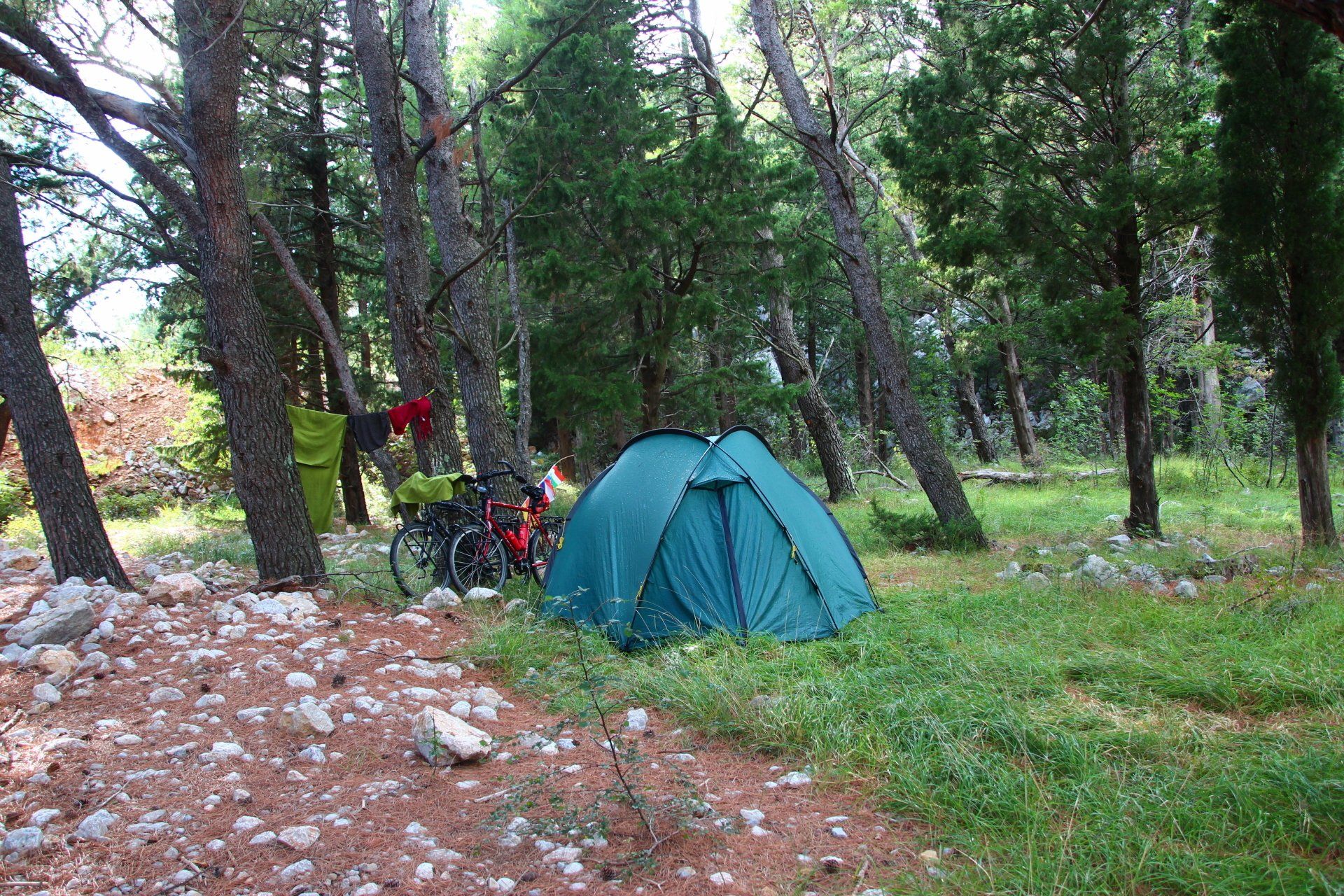Wir verabschieden uns von einander und sie fahren weiter. Wir machen es ihnen gleich und fahren auch weiter. Nach einer Weile hört es wieder auf zu regnen und es zeigt sich sogar hin und wieder die Sonne. Als wir in der Ortschaft Tribanj sind und uns ein kleines Eis aus einem kleinen Geschäft gönnen, treffen wir Zelko wieder (Radreisender aus Bulgarien). Er ist knapp 20 Minuten vor uns hier angekommen. Wir unterhalten uns eine Weile. Irgendwann verabschieden wir uns dann von ihm, denn wir wollen weiterfahren. Er will noch etwas länger Pause machen. Als wir über eine kleine Brücke fahren, entdecken wir einen super schönen und einsamen Strand. Naja fast einsam. Eine dreiköpfige Familie ist auch noch dort. Und das beste an dem Strand, auf der einen Seite der Brücke befindet sich der Strand und auf der anderen Seite ein kleiner lichter Wald. Perfekt zum Zelten. Nach dem Basti einmal kurze die Lage peilen war, schieben wir auch schon unsere Räder auf einem kleinen Trampelpfad neben der Brücke runter zum Wäldchen. „Der Platz ist perfekt“ sage ich zu Basti. „Ja, der ist wirklich mal Top!“ erwidert er. Wir lehnen unsere Räder an einen Baum und packen ab. Da es noch eine Weile hell ist und wir noch gerne ins Wasser gehen möchten, bauen wir das Zelt nach dem schwimmen auf. Wir ziehen uns um und gehen unter der Brücke zum Strand. Leider ziehen wieder ein paar Wolken auf und es ist auch wieder etwas windiger geworden. Aber das soll uns nicht stören. Als die Sonne dann komplett hinter den Wolken verschwunden ist, gehen wir zurück zu unseren Rädern. Wir ziehen uns um und bauen anschließend das Zelt auf. Während Basti uns etwas zu essen kocht, bereite ich das Zelt von innen vor. Matten auslegen, Kissen aufblasen und Schlafsack raus. Auch wenn Basti seinen nicht wirklich nutzt, da es ihm selbst abends immer noch viel zu warm ist. „Hey, hier draußen läuft ein Eichhörnchen rum. Ich fühle mich ein wenig beobachtet“. „Lass dir nicht unser Essen klauen“ antworte ich ihm. Taschen ins Zelt und natürlich dürfen Fee und Foo nicht fehlen. Mittlerweile ist auch das Essen fertig. Gerade als wir fertig sind, fängt es wieder an ein wenig zu tröpfeln. Was für ein Timing.