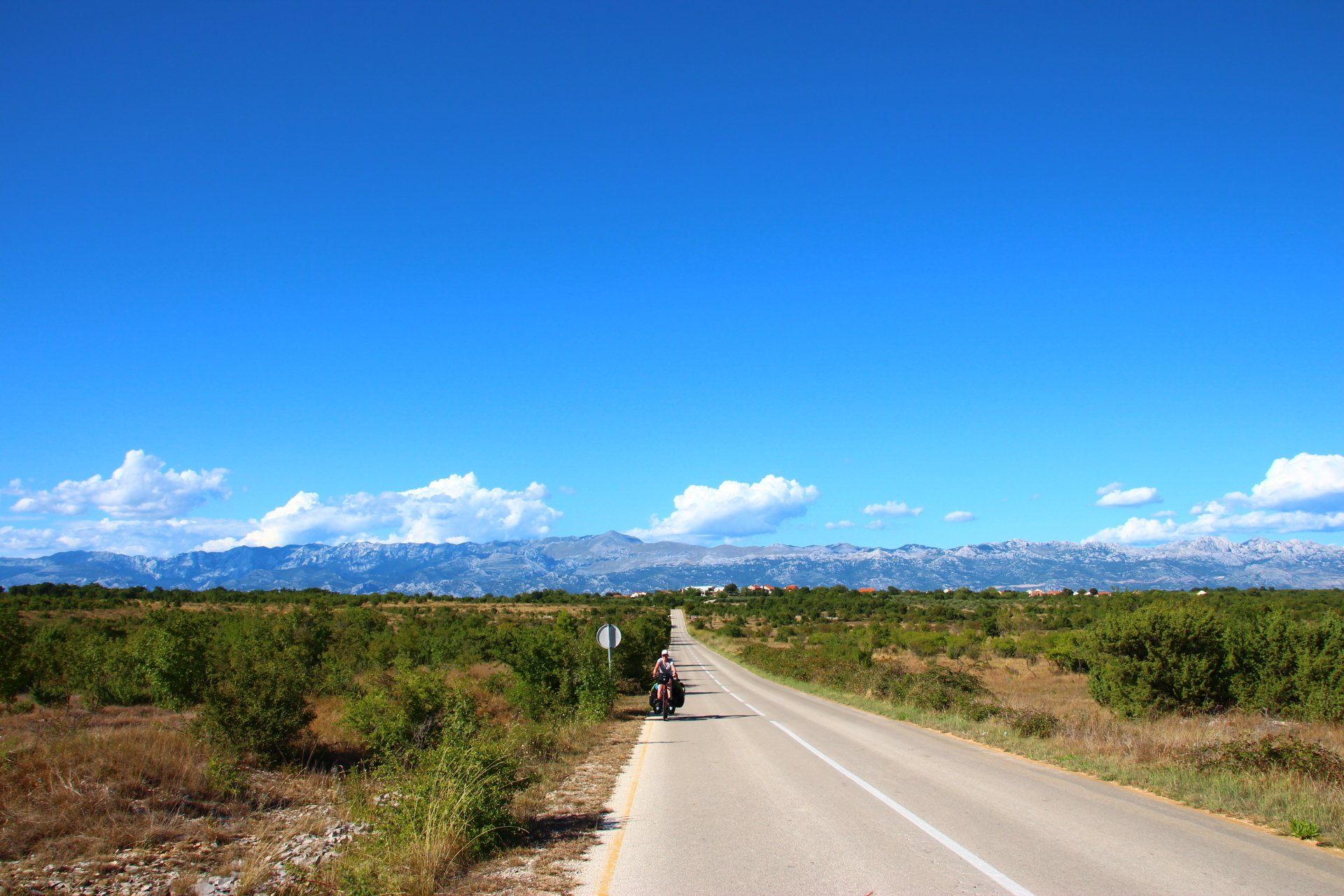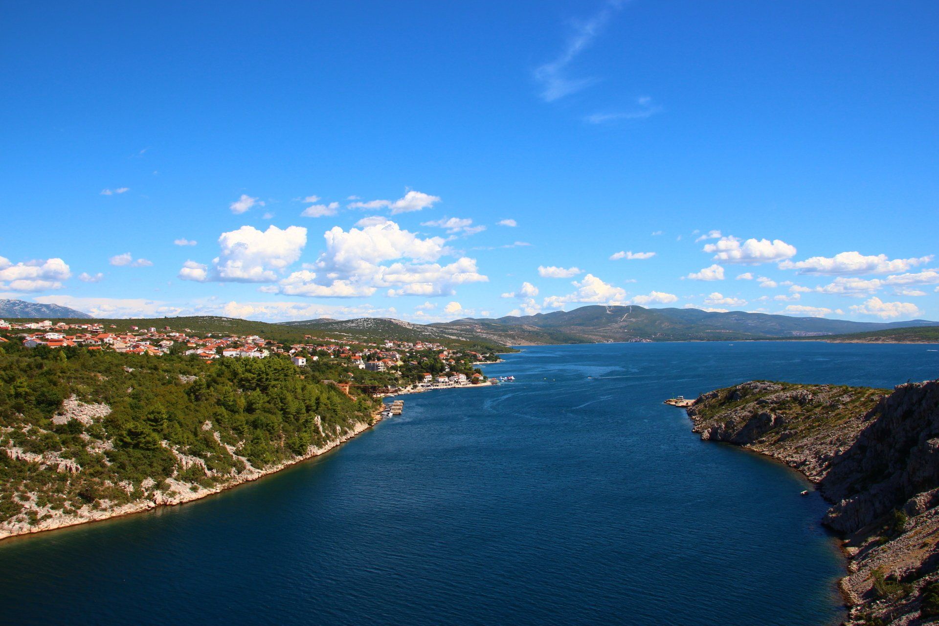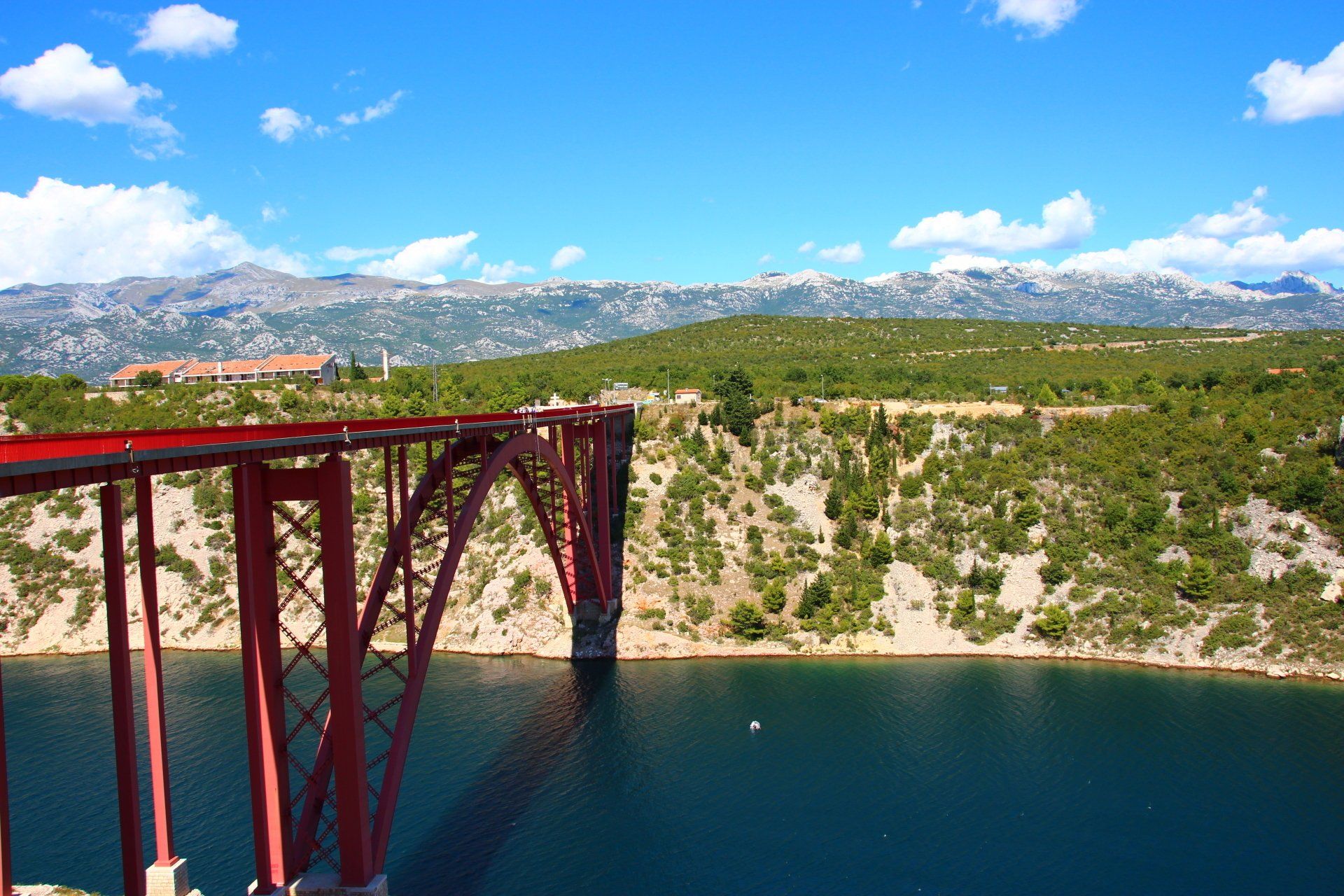 Der nächste Morgen sollte vom Wetter her erst einmal nicht wirklich besser sein. Zwar regnet es nicht aber der Himmel ist mit dunklen Wolken verhangen. Was solls. Wir frühstücken und packen anschließend zusammen. Wie sollte es anders sein, fängt es an zu nieseln, während wir die letzten Taschen packen. Wir tragen unsere Taschen und die Räder zur Brücke. Ersteinmal unterstellen. Wir entscheiden uns dann aber weiter zu fahren und nicht abzuwarten. Schließlich ist es ja trotzdem warm und wir sind ja nicht aus Zucker. Also tragen wir alles hoch zur Straße, packen unsere Räder und fahren los. Nur wenige Minuten später hört es auf zu nieseln und es kommt die Sonne raus. Schlagartig werden es gefühlte 20°C wärmer. Als wir durch eine größere Ortschaft namens Starigrad Paklenica fahren, halten wir an einem Super Markt an um unsere Vorräte wieder aufzufüllen. Hier ist einiges los. Man merkt gleich das hier der Tourismus boomt. Man hört alle möglichen Sprachen. Deutsch, englisch, kroatisch, italienisch, polnisch und noch weitere. Kurz hinter der Ortschaft befindet sich ein kleiner Parkplatz, der direkt am Wasser liegt. Wir sind zwar noch nicht lange unterwegs, aber was solls. Wir sind ja schließlich nicht auf der Flucht. Wir folgen dem Fußweg zum Strand. Der Strand ist wirklich schön und es ist auch nicht so viel los und das beste, eine nagelneue öffentliche Toilette. Super, so können wir gleich auch noch unsere Wasservorräte füllen. Wir gehen eine Runde schwimmen und genießen die Sonne. Doch irgendwann müssen wir dann aber auch wieder weiter. Also rauf aufs Rad und los. So fahren wir weiter, immer entlang der Küste Richtung Süden. Die Landschaft ist wirklich schön. Bei Maslenica fahren wir über eine hohe Brücke. Auf der Brücke sehen wir, dass man hier Bungee jumping machen kann und das sich gerade eine Frau bereit macht. „Das will ich mir ansehen“ sagt Basti zu mir. So halten wir auf der anderen Seite der Brücke an, stellen unsere Räder auf die Seite und schauen uns das Spektakel an. „Für mich wäre das nichts“ sage ich zu Basti als sich die Frau kreischend in die Tiefe stürzt. „Ich würde viel lieber mal Fallschirmspringen ausprobieren“ antwortet er. Nachdem alles vorbei ist und die Frau unten von einem Boot eingesammelt wird (heile natürlich), fahren wir weiter.