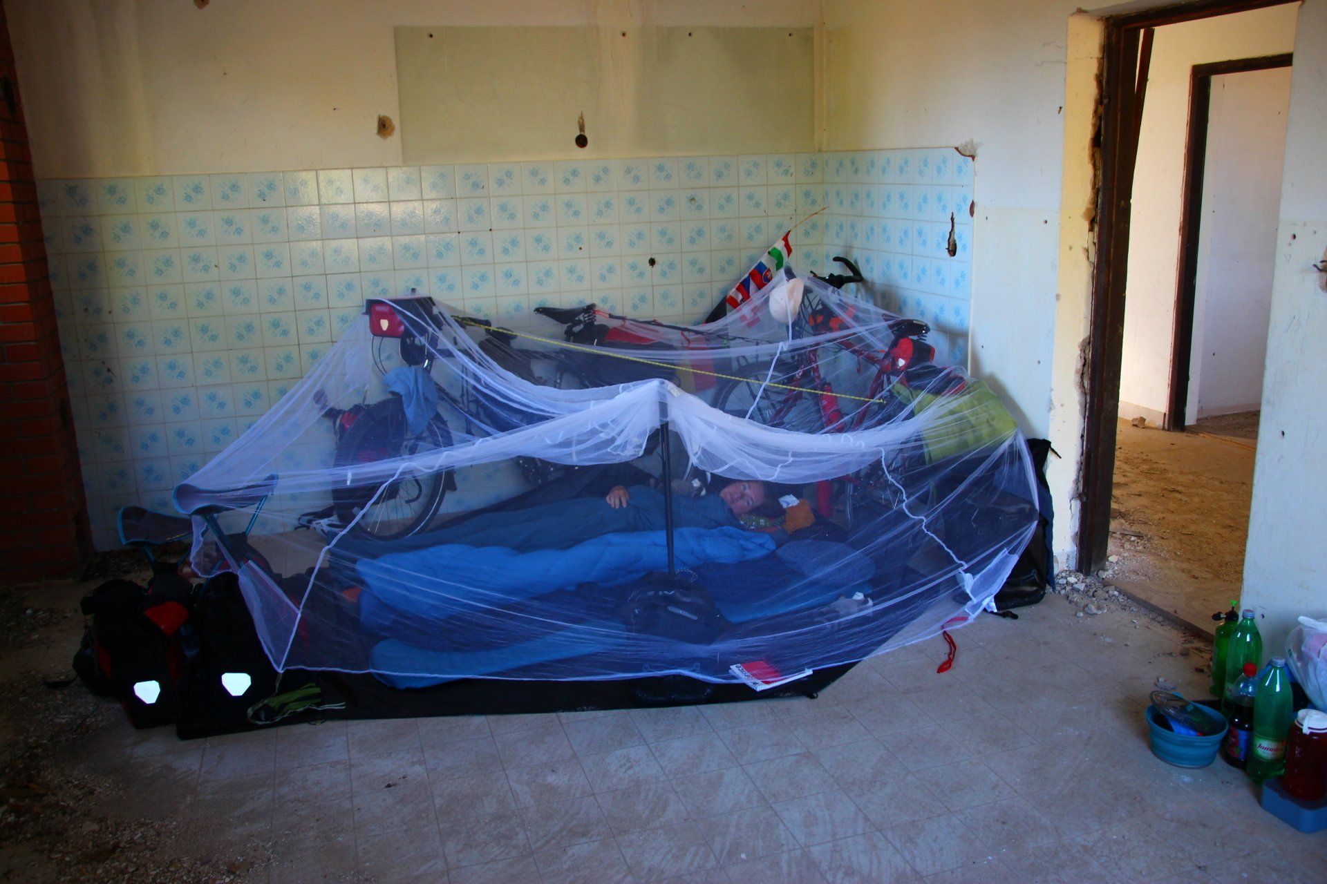Die Landschaft hat sich seit der Brücke deutlich verändert. Sie ist deutlich trockener und es sind nahezu keine Bäume mehr vorhanden. Links und rechts der Straße sind hügelige Felder und Wiesen, die fast durchgehend von verschiedenen Stachelpflanzen bedeckt sind. Hoffentlich finden wir heute einen Schlafplatz. Wir fahren immer wieder durch kleine Dörfchen. Die Leute schauen uns meist sehr verdutzt an. Aber sie grüßen immer freundlich. „Ich glaube hier kommen wohl eher selten Touristen lang“ sagt Basti zu mir als uns wieder eine ältere Frau verdutzt hinterher guckt. „Hier ist ja fast nichts. Die meisten wollen ja eher Urlaub am Strand machen. Ich finde es schön hier“ antworte ich ihm. Irgendwo im nirgendwo ruft Basti lachend zu mir „Ich hab einen Schlafplatz für uns gefunden“ und deutet auf eine alte Matratze die rechts von uns am Wegesrand liegt. Lachend antworte ich ihm „Oh, nein danke“. Als wir an einer großen Y-Kreuzung ankommen, entdecken wir ein kleines verlassenes Haus. Naja, Ruine trifft es schon fast eher. Wir halten an und Basti schaut sich das mal an. Als er wieder kommt, sagt er zu mir „Steht noch zur Verfügung. Deshalb habe ich gleich mal die ganze Ferienwohnung für uns gebucht. Nur leider ist kein Frühstücksbuffet inbegriffen“. „Naja, man kann nicht alles haben“ antworte ich ihm lachend. Also schieben wir unsere Räder zu unserem Ferienhaus. Die Räder stellen wir in den Flur unserer 4 Zimmer Wohnung. Leider ist das Bad bezüglich Renovierungsarbeiten geschlossen und die Küche bleibt leider auch kalt. „Na dann gehe ich halt in den Garten“ sagt Basti grinsend. In der ehemaligen Küche, schlagen wir unser Nachtlager auf. Zwischen den Rädern spannen wir das Mückennetz auf und legen unsere Zeltunterlage drunter. Bevor wir uns aber schlafen legen, kochen wir uns im Nachbarzimmer noch etwas leckeres zum Abendessen. Satt und glücklich legen wir uns in unser Bett.