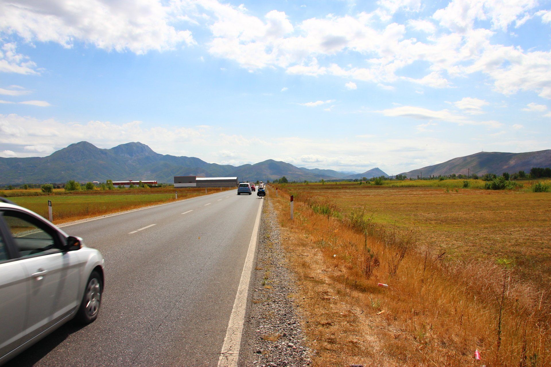 Pünktlich um 6 Uhr morgens werden wir von dem Morgengebet der Moschee geweckt. Wir packen zusammen und fahren weiter. Wir folgen einem Feldweg, der uns zuerst zu einer Nebenstraße führt und dann wieder zurück auf die Hauptstraße. Die Nebenstraße ist mit groben Kies ausgelegt. Also entweder die Straße ist so, oder sie wird gerade erneuert. Ein Mann auf einer Kutsche kommt uns entgegen und grüßt uns freundlich. Hinter der nächsten Kurve ist die Nebenstraße auch schon wieder geteert. Also doch Erneuerungsarbeiten. Wir kommen an einer großen Y-Kreuzung an, die uns wieder auf die Hauptstraße führt. An der Kreuzung ist viel Polizei. Sie kontrollieren ein paar Autos. Als uns einer der Polizisten entdeckt, spricht er die anderen an und deutet auf uns. Daraufhin wird uns von mehreren Polizisten freundlich zugerufen. „Hello“ und „welcome to Albania“. Wir winken zurück und antworten mit einem freundlich „hello, thank you“. Wie unglaublich nett hier alle sind. Auf der Hauptstraße ist wieder deutlich mehr Verkehr. So gut wie jedes Auto hupt uns zur Begrüßung zu und aus dem Inneren winken uns die Leute zu. Jung, alt, Mann oder Frau. Alle haben ein Lächeln im Gesicht und winken. Wir haben ja gehört das die Albaner sehr gastfreundlich sind, aber mit so etwas haben wir echt nicht gerechnet. „Guck mal, da vorne kommt ein Supermarkt. So viel dazu, dass es in Albanien keine Supermärkte gibt“ rufe ich Jasmin zu und zeige auf den Supermarkt zu unserer Rechten. „Frühstückspause?“ ruft Jasmin. Ich nicke ihr zu und wir fahren auf den Parkplatz vor dem Geschäft. Während Jasmin rein geht, warte ich draußen bei den Rädern. Dabei entdecke ich, dass direkt neben mir eine öffentliche Toilette ist. Wenig später ist Jasmin auch schon wieder zurück, mit vielen leckeren Sachen. Heute gibt es zum Frühstück frisches albanisches Brot mit Marmelade und Schokoaufstrich. Während wir frühstücken, erzähle ich ihr von meiner Entdeckung. Das Brot ist wirklich lecker. Nachdem wir fertig sind mit frühstücken, füllen wir noch unsere Wasserreserven auf der Toilette auf, bevor wir weiterfahren.