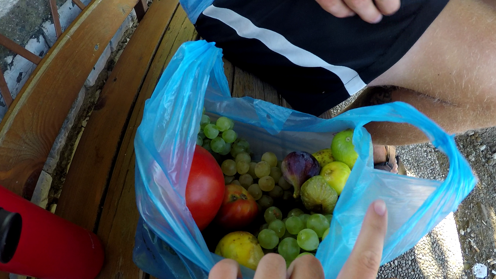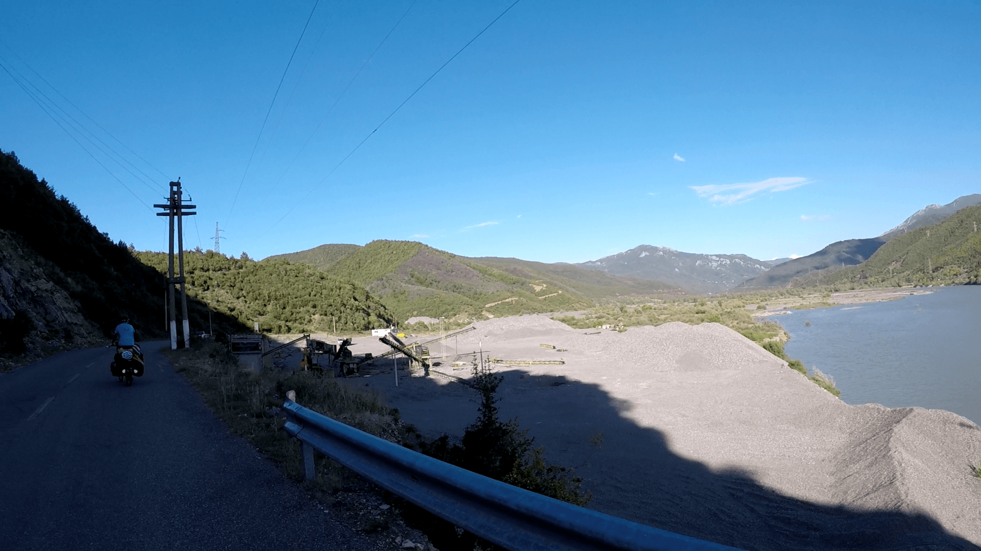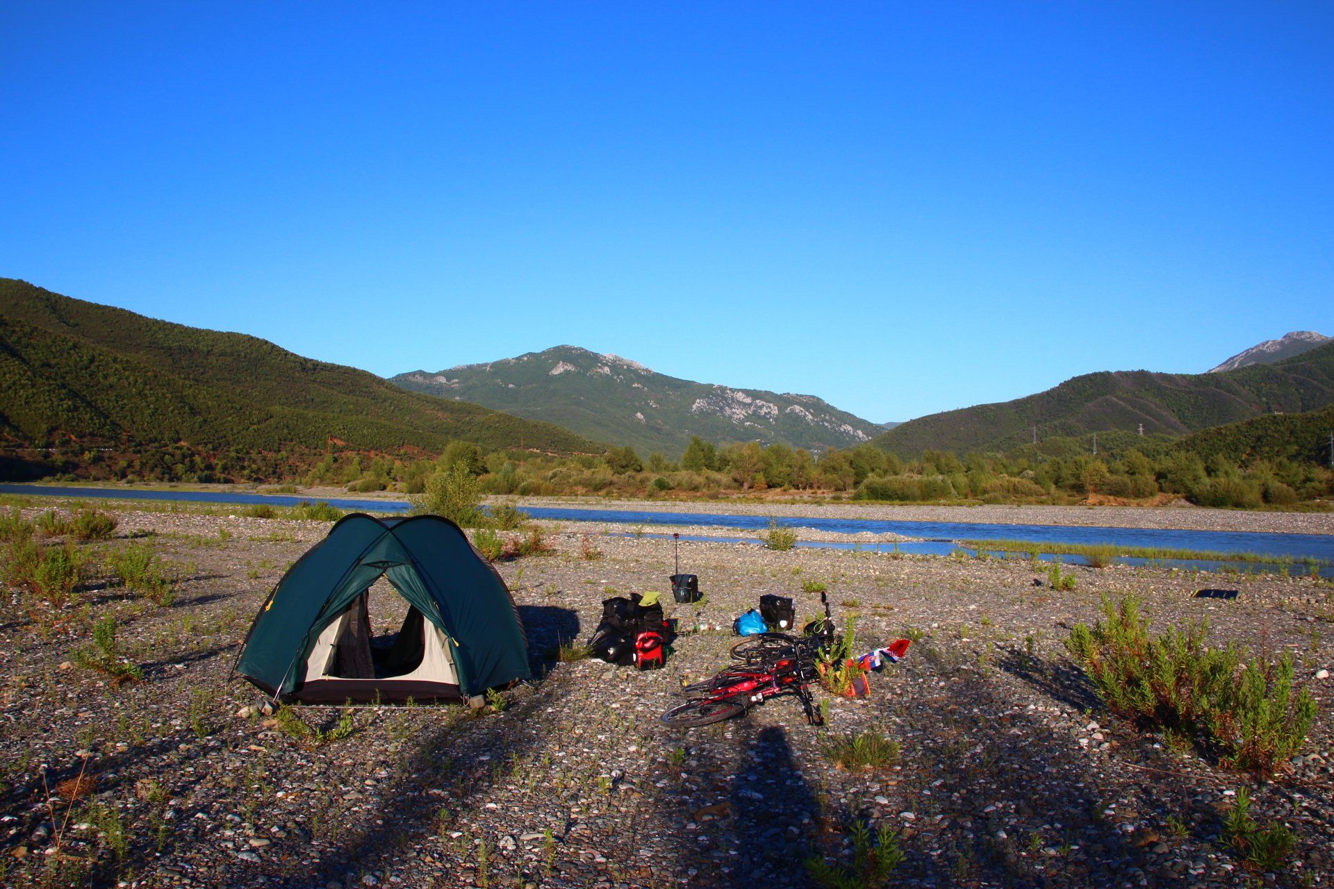 Vor uns liegt die Stadt Lezhë. Dort fahren wir über eine Brücke, die über den Fluss Lumi Drin führt. Auf der anderen Seite befindet sich die Innenstadt. Da hier mehrere Bankautomaten sind, decken wir uns erst einmal mit etwas albanischem Bargeld ein. In der Stadt ist ganz schön viel los. Fußgänger schlendern zwischen den Geschäften hin und her und auf der Straße herrscht ein stetiger Fluss an Autos. Wir fädeln uns in den Verkehr ein und folgen ihm aus der Ortschaft. Kaum sind wir aus der Ortschaft raus, lässt der Verkehr auch schon wieder stark nach. Auf unserem Weg kommen wir durch mehrere kleine Dörfer. Auch hier werden wir jedes mal, wenn uns Leute entgegen kommen, gegrüßt. „Hello, welcome to Albania“. Links von uns sind Berge und rechts von uns eine große flache Ebene. Wir verlassen die Hauptstraße und biegen in einen Canyon ein. „Da vorne geht es gleich ein Stück bergauf, bevor es dann wieder abwärts geht“ sage ich zu Jasmin. „Da vorne kommt eine Bank im Schatten. Können wir kurz eine Pause machen?“ fragt mich Jasmin. „Klar“ antworte ich ihr. Die Bank steht im Schatten eines großen Baumes. Hinter der Bank ist eine kleine Mauer mit einem Zaun. Hinter dem Zaun befindet sich eine Kirche und ein Gebäude, dass aussieht wie eine Schule. Wir stellen unsere Räder an dem Zaun ab und setzten uns auf die Bank. Gerade als wir uns hingesetzt haben, hält vor uns ein Auto und öffnet das Fenster. Im Auto sitzt ein Mann, der uns fragt wo wir herkommen und ist sehr beeindruckt als wir im erzählen, aus Deutschland mit dem Fahrrad. Dann fragt er uns wie uns Albanien bis jetzt gefällt und ob wir irgendetwas bräuchten. Wasser oder etwas zu essen. Wir bedanken uns und sagen ihm, das wir alles haben was wir brauchen. Ich unterhalte mich noch ein wenig mit ihm. Dabei stellt sich raus, dass er ein paar Jahre in Belgien gelebt hat. Kurze Zeit später hören wir, wie jemand hinter dem Zaun auf uns zukommt. Als wir uns umdrehen, staunen wir erst nicht schlecht. Eine ältere Dame, die gekleidet ist wie Mutter Teresa. Sie begrüßt uns und fragt uns, ob wir ein paar Früchte haben möchten. Dieses Angebot nehmen wir gerne an. Sie verschwindet wieder und kommt wenig später mit einer großen Tüte wieder und zeigt uns, dass wir zum Tor kommen sollen. Dort überreicht sie uns die große Tüte, die mit allen möglichen Dingen gefüllt ist. Trauben, Feigen, Gurken und Tomaten. Wir unterhalten uns noch ein wenig mit ihr, bevor wir uns wieder auf unsere Räder schwingen und weiter fahren. Zuerst geht es ein Stück bergauf. Oben auf der Kuppe angekommen, haben wir einen tollen Blick in den vor uns liegenden Canyon. Wir folgen der Straße abwärts in den Canyon. „Guck mal, da vorne geht ein Pfad hinunter zum Fluss. Vielleicht finden wir dort einen schönen Schlafplatz“ sag ich zu Jasmin und halte an. „Sieht gut aus“ antwortet sie. Also folgen wir dem Weg hinab ins breite Flussbett. Wir suchen uns eine schöne Stelle und schlagen unser Zelt auf. Während ich Essen koche, wäscht sich Jasmin die Haare im Fluss. Nach dem Essen gönne ich mir noch eine Dusche am Flussufer. Anschließend legen wir uns schlafen.