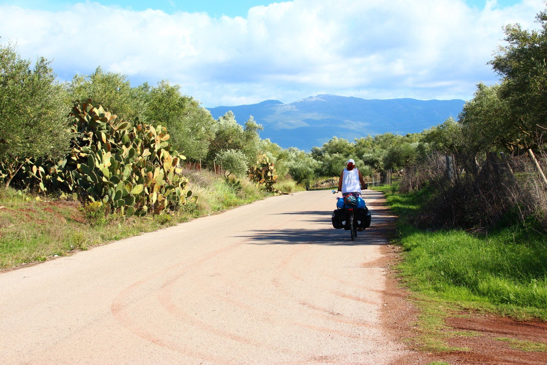 Nach einem sehr erholsamen Tag wachen wir strotzend vor Energie auf. In den ersten Strahlen der aufgehenden Sonne frühstücken wir vor unserem Zelt und genießen die Sonne. Heute wird wohl auch wieder ein ziemlich warmer Tag werden. Nach dem Frühstück packen wir alles zusammen und schieben unsere Räder den sandigen Weg durch die Dünen zurück zur Straße. Unser nächstes Ziel ist Kalamata, dass wir wohl morgen erreichen werden, denn bis dorthin ist es jedoch ein ganzes Stück. Wir folgen der Straße ein ganzes Stück immer entlang der Küste Richtung Süden, bis wir nach ungefähr 26km dann ins Landesinnere abbiegen. Was auch wieder bedeutet, bergauf. Mittlerweile sind wir das aber gewöhnt und es macht mir auch nicht mehr viel aus. Schließlich habe ich es ja sogar mit dem Rad auf den Olymp geschafft. Auf unserem hügeligen Weg kommen wir immer wieder an kleinen Ortschaften vorbei. Auf einem Streckenabschnitt wachsen riesige Kakteen. „Das ist die Kakteen avenue“ witzelt Basti. In einem kleinen Dorf namens Stenyklaros lungern ganz schön viele Streuner auf der Straße. Und wie sollte es anders sein, gehen sie direkt lautstark bellend auf uns los. Wenigstens halten sie etwas Abstand. Wir fahren einfach weiter. Als wir das Dorf nach nur wenigen hundert Metern wieder verlassen, lassen sie auch schon wieder von uns ab. Das waren mal wieder welche von der nervigen Sorte. In Meligalas wird Basti langsamer und dreht sich zu mir um. „Komm wir halten hier mal kurz an“ sagt er zu mir und bleibt stehen. Eine Pause ist nicht schlecht. Wir stellen unsere Räder an einer Mauer ab, Basti dreht sich um und läuft die Straße zurück. Dabei ruft er mir noch zu „Bin gleich wieder da“. Mmh.. ok, was hat er denn jetzt wieder vor? Ich setzte mich neben unsere Räder an die Mauer. Nach nur wenigen Minuten kommt er wieder und hat dabei die Hände hinter seinem Rücken. „Links oder rechts?“ fragt er mich. „Mmmh... dann links“ antworte ich ihm und deute auf seinen linken Arm. „Gute Wahl“ sagt er und zeigt mir was er in der linken Hand hält. „Ha! Dachte ich es mir“. Er hat uns zwei Eisbecher von der Marke Merenda besorgt. Das ist so etwas wie Nutella. Nur halt von einer anderen Marke und viel leckerer als Nutella. Finde ich, denn es schmeckt wie eine Tafelschokolade halt nur als Brotaufstrich. „Ok und was hast du in der anderen Hand?“ frage ich ihn und nehm einen der beiden Eisbecher. „Eine kalte Zitronen Limonade für uns beide“ antwortet er mir. So versüßen wir uns die Pause mit etwas leckerem Eis und kalter Limonade. Da es langsam dem Abend entgegen geht, beschließen wir nur noch aus Meligalas raus zu fahren und dann nach einem Schlafplatz Ausschau zu halten. Relativ schnell werden wir auch fündig. Neben der Straße ist eine große Wiese mit ein paar Gebüschen. „Na das sieht doch vielversprechend aus“ sagt Basti. Wir halten an und schieben unsere Räder auf die Wiese hinter die Gebüsche. Die Wiese bietet einen super Schlafplatz. Leider stellen wir jedoch schnell fest, dass es zur anderen Seite hin sehr einsichtig ist. Was jetzt nicht so das Problem wäre, wenn sich am Ende der Wiese nicht ein Containerdorf befinden würde, was ziemlich.....Naja zwiespältig wirkt. Viel Müll, alte Autowracks, eingerissene Zäune mit Stacheldraht, Wohnwagen und etliche Leute die durcheinander schreien. Wir überlegen kurz hin und her, kommen aber beide zu dem Entschluss, dass wir auf unser beider Bauchgefühl hören sollten, was uns sagt, lieber wo anders zu zelten. Also drehen wir um und schieben unsere Räder zurück zur Straße und fahren weiter. Ein kleines Stückchen weiter die Straße entlang, entdecken wir wieder eine Wiese. Wir halten wieder an und schieben unsere Räder in einem passenden Moment, als kein Auto zu sehen ist, auf die Wiese. Auch hier haben wir einen Sichtschutz zur Straße hin durch ein paar Bäumen, sowie Gebüschen und einem alten Gebäude, wovon aber nur noch zwei kleine Mäuerchen stehen. Zur anderen Seite hin haben wir ein dichtes Gestrüpp, wo wohl niemand durch kommen sollte. Wir lauschen kurz, ob irgend etwas zu hören ist, aber es ist nichts zu hören, jedenfalls nichts bis auf ein einzelnes Auto was die Straße entlang kommt. „Hier ist super“ sage ich zu Basti, der mir zustimmend zunickt. Wir packen unsere Räder ab und bauen das Zelt auf. So wie jeden Tag kocht uns Basti etwas zum Abendessen, während ich das Zelt von innen fertig mache. Isomatten aufblasen, Schlafsäcke auspacken und die Taschen vom Vorzelt rein holen. Mittlerweile sind wir ein echt gut eingespieltes Team, bei dem jeder seine Aufgaben hat und damit auch sehr glücklich ist. Kurz nachdem ich mit allem fertig bin, ist auch das Essen fertig und wir essen zu Abend. Anschließend noch schnell abwaschen, denn wir wollen nicht wieder in der Nacht überraschend Besuch bekommen. Gute Nacht.