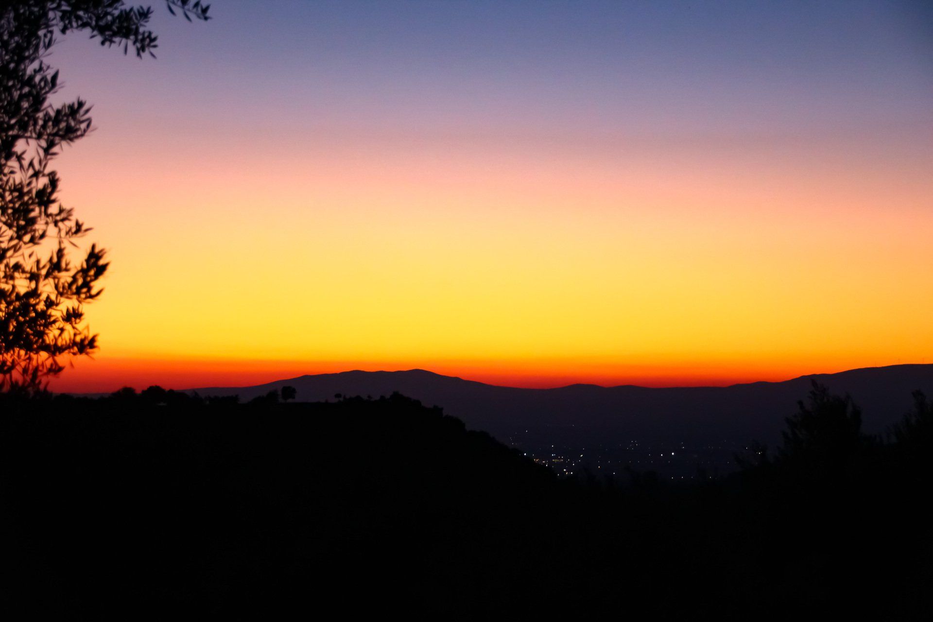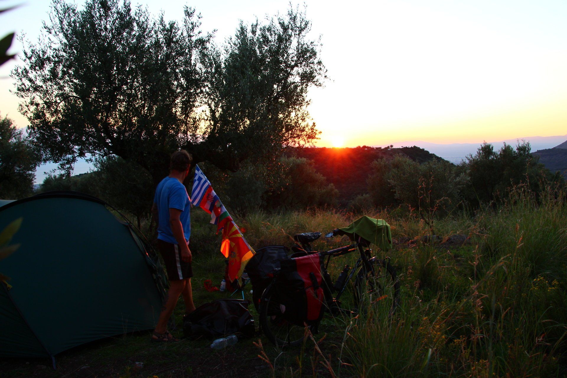 Als Basti dann fertig ist und der neue Blogbeitrag online ist, machen wir uns wieder auf den Weg. Unser nächster Zwischenstopp ist ein anderer Supermarkt direkt um die Ecke. Dort wollen wir die noch fehlenden Dinge einkaufen. Nach einer kurzen Fahrt durch die Stadt sind wir auch schon da. Diesmal geht Basti rein und ich bleibe bei den Rädern. Als er wieder zurück ist, präsentiert er mir ganz stolz, was er alles gekauft hat. „Guck mal, ich habe einen Kürbis gekauft. Leider hatten sie keine normalen Kürbisse, deswegen habe ich einen länglichen Hokkaidokürbis genommen. Ich habe mir überlegt, ich könnte ja heute eine Kürbiscremesuppe kochen. Schließlich ist ja heute Halloween. Und, was noch viel cooler ist, ich mache uns aus ihm eine Kürbislaterne!“. Der hat vielleicht immer Ideen. Jetzt steht er vor mir, mit einem Kürbis in der einen Hand und in der anderen das Wechselgeld und strahlt mich mit einem Grinsen, das über beide Ohren geht, an. „Ja kannst du gerne machen“ antworte ich ihm und kann mir das Lachen nicht verkneifen. Nachdem alles verstaut ist, geht es auch schon wieder weiter. Unser nächstes Vorhaben, einen geeigneten Pauseplatz finden, an dem wir unsere Reste von gestern Abend essen können. Denn wir bekommen trotz des Kuchens, oder gerade wegen ihm, beide ein kleines Hüngerchen. Vor einem großen Gebäudekomplex entdecken wir eine kleine Wiese, an der wir Halt machen. Zu essen gibt es die restlichen Nudeln mit Bolognese vom Vortag. Selbstverständlich die vegetarische Variante mit Soja. Gesättigt geht es weiter. Nach langer Zeit fahren wir mal wieder auf einem richtigen Fahrradweg, auf dem mal nicht Autos geparkt haben oder große Müllcontainer abgestellt wurden, aus der Stadt raus. Kurz vor der Stadtgrenze endet der Fahrradweg auf der Straße. Halb so schlimm, denn hier ist nahezu kein Verkehr mehr. Grund dafür ist, dass vor uns die Nebenstrecke durch die Berge nach Sparta liegt, was auch unser nächstes Ziel ist. Gut für uns. Also auf in die Berge nach Sparta. Wir könnten zwar auch der Hauptverkehrsstraße folgen, die einmal um die Berge an der Küste entlang führt, aber irgendwie haben es uns die Berge angetan. Außerdem ist es hier, was den Verkehr angeht, deutlich angenehmer zu fahren. Jedenfalls geht es direkt hinter Kalamata los mit bergauf strampeln und das mal gleich mit im Schnitt 8% Steigung. Dabei kommen wir an einem weitläufigen Militärgelände vorbei. Als wir an einer Y-Kreuzung ankommen, haben wir nun zwei Möglichkeiten wie wir weiter fahren. Links oder rechts? Von der Länge her tut sich da nicht all zu viel und beide führen nach ein paar Kilometern wieder zusammen. Es sind eher die Höhenmeter und der Untergrund. Nach links geht es zwar etwas flacher bergauf, aber dafür ist der Untergrund nicht wirklich pralle. Rechts hingegen geht es zuerst wieder ein kleines Stückchen abwärts, ehe es dann wieder bergauf geht, aber dafür auf einer gut geteerten Straße. Während wir unsere beiden Möglichkeiten abwägen, kommt von rechts ein älterer Herr, der mit seinem Hund spazieren geht. Als er bei uns ankommt, macht er Halt und fragt uns wo wir hin möchten. Wir sagen ihm, dass wir durch die Berge nach Sparta wollen. Er rät uns den rechten Weg zu wählen, da der linke Weg nicht gut sei und auch auf einem Stück momentan nicht passierbar sei. Damit nimmt er uns die Entscheidung ab. Wir bedanken uns bei ihm und vertrauen auf seinen Rat. Also rechts lang. Wie geahnt geht e zuerst ein kleines Stückchen bergab, ehe es dann bergauf geht. Aber dafür ist der Weg in einem guten Zustand. Da es langsam dem Abend entgegen geht, halten wir ab sofort Ausschau nach einem Schlafplatz für heute. Gar nicht so leicht wieder in den Bergen, denn das Gelände ist sehr hügelig und steil. Nach 2,6Km kommen wir an der Weggabelung an, an der die zwei Wege wieder zusammenführen. Nach einem kurzen Blick in die Abzweigung wird uns schnell klar, dass es die richtige Entscheidung war, auf den älteren Herrn zu hören. Denn der andere Weg ist eher nur noch ein schmaler Feldweg mit groben Schotter. Wir folgen weiter der Straße, die sich immer weiter in die Berge schlängelt. Als wir an einer kleinen ziemlich zugewucherten Einfahrt entlang kommen, machen wir Halt und Basti läuft einmal den Pfad entlang, um zu schauen ob wir hier einen Platz zum schlafen finden. Wenige Minuten später ist er auch schon wieder zurück. „Sieht gut aus. Der Weg endet nach ein paar Metern an einer kleinen Wiese. Dort stehen etwas tiefer, auf einer Terrasse, vereinzelt ein paar Olivenbäume umher und ein alter Rohbau, der aber nie fertig gestellt wurde. Dort scheint aber auch schon länger keiner mehr gewesen zu sein. Wir können entweder auf der Wiese unser Zelt aufschlagen oder in dem Rohbau schlafen“ erzählt er mir. Ein kurzer Blick nach links und rechts, kein Auto zu sehen, dann los. Wir schieben unsere Räder den kleinen Pfad entlang zu der Wiese. Da es mir lieber ist, unser Zelt auf der Wiese aufzuschlagen, bleiben wir hier und beginnen das Zelt aufzubauen. Während ich das Zelt von innen herrichte, fängt Basti an die Kürbiscremesuppe zu kochen. Als ich fertig bin und wieder aus dem Zelt zu ihm kommen möchte, ruft er mir zu, „bringst du mir bitte meine Kopflampe mit raus?“. „Ja“ antworte ich ihm. Die Sonne verschwindet langsam hinter den Bergen. Der Himmel ist in wunderschönen roten und gelben Tönen gefärbt. „Guck mal was ich gemacht habe“ sagt Basti zu mir und hält mir den geschnitzten Kürbiskopf entgegen. „Das ist Klaus“. „Ach wie cool. Den hast du wirklich gut hinbekommen“ antworte ich ihm lachend. „Wir können meine Kopflampe in ihm verstecken, dann leuchtet er sogar“. Ich gebe ihm seine Kopflampe, die er zuerst noch in einer durchsichtigen Mülltüte steckt, ehe er sie in Klaus stopft. Anschließend stellt er Klaus vor unser Zelt. Sieht wirklich cool aus. Mittlerweile ist auch unser Essen fertig. Die Suppe ist wirklich unglaublich lecker