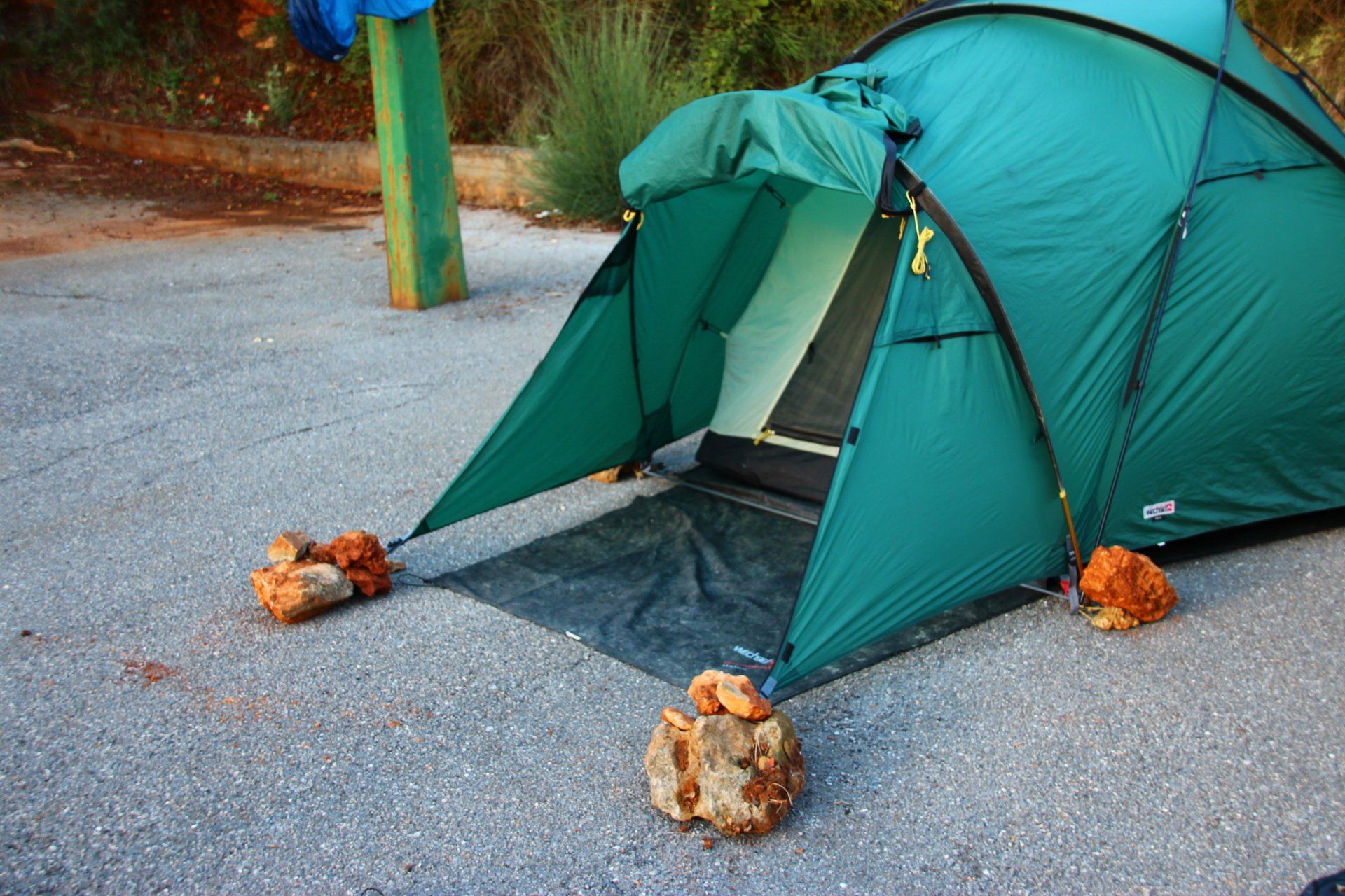 Es geht noch ein kleines Stückchen weiter abwärts, ehe es wieder rauf geht. Immer wieder kommen uns vereinzelt Läufer entgegen. Auch ein paar Läuferinnen sind dabei. Es sind immer wieder lustige Begegnungen. Wir feuern sie an und sie feuern uns an. An einer geraden etwas flachen Stelle machen wir am Straßenrand halt. Die Räder lehnen wir auf der anderen Straßenseite an der Leitplanke an, während wir uns in den Schatten setzten. „Ganz schön warm wieder heute“ sagt Jasmin zu mir, während sie ihre Trinkflasche öffnet. „Oh ja. Das Thermometer zeigt 28°C in der Sonne an“ antworte ich ihr. Wir machen einige Minuten Pause, ehe wir wieder aufsatteln und weiter bergauf radeln. Es geht noch eine ganze Weile bergauf. Die Landschaft ist wirklich unglaublich schön. Nach ungefähr 16Km und 1053Hm sind wir dann endlich oben angekommen auf 1307Hm. Und das Beste, hier oben gibt es ein kleines Restaurant. Hier machen wir Halt. Da Jasmins Motivation ein wenig angekratzt ist nach dem ganzen bergauf, glaube ich, ist es Zeit für eine kleine Motivationsspritze. „Lust auf ein Eis?“ frage ich sie. Sie strahlt mich mit großen Augen an „Ja! Das wäre toll“. Wir schieben die Räder an eine kleine Mauer und stellen sie dort ab. Jasmin nimmt das Portmonee an sich und geht mal rein gucken, ob sie auch Eis haben. Ich setzte mich währenddessen an einen der Tische, die auf dem Platz vor dem Restaurant stehen. Nach ein paar Minuten ist sie wieder mit zwei großen Eis in der Waffel zurück. Nun sitzen wir mitten in den Bergen in der Sonne und schlabbern ein Eis, nach der ganzen Anstrengung. Nach einer ausgiebigen Pause geht es aber dann irgendwann weiter. Jetzt geht es fast ganze 1000hm wieder bergab. Damit es uns nicht kalt wird während der Abfahrt, ziehen wir unsere dünnen Überziehjacken an. Sicher ist sicher. Genau am Scheitelpunkt steht ein Schild das auf ein Oliven Museum in Sparta hinweist. „Schau mal in Sparta gibt es ein Oliven Museum“ sage ich kichernd zu Jasmin. „Oliven. Sie sind überall“ antwortet sie lachend. „Jaja, immer diese Oliven. Na Lust auf eine kleine Olivenernte?“ frage ich sie. „Ne, gerade nicht. Vielleicht später“. So genug herumgealbert. Los geht’s. So sausen wir die Serpentinen auf der anderen Seite wieder hinab. Dabei geht es durch eine wunderschöne Berglandschaft. Aber das absolute Highlight der Abfahrt ist aber definitiv das Stück, wo die steilen Felswände über die Straße hinausragen und man sogar ein kleines Stückchen durch einen Tunnel fährt. Einfach nur atemberaubend. Die Straße führt vorbei an steilen Felswänden, hohen Gipfeln und tiefen Schluchten. Wir wollen noch aus den Bergen raus und uns dann einen Schlafplatz suchen. Nach ungefähr 17Km Abfahrt kommen wir in einem kleinen Dorf an. Von hier aus sind es nur noch knappe 8Km bis nach Sparta. „Wäre super wenn wir direkt nach der Ortschaft einen Schlafplatz finden würden“ sage ich zu Jasmin. „Wäre super“ antwortet sie mir. Und wir sollten Glück haben, denn nur wenige 100 Meter hinter der Ortschaft finden wir sogar gleich zwei geeignete Schlafplätze. Links neben der Straße befindet sich eine kleine flache Wiese und rechts führt ein kleiner Weg weg von der Straße zu einem etwas höher und hinter Bäumen und Gebüsch gelegenen Basketballplatz, der bis auf den offenen Eingang eingezäunt ist. So wird man nicht direkt von der Straße aus gesehen. Links, auf der Wiese wird man zwar direkt von der Straße aus gesehen, aber dafür liegt man bequem auf einer weichen Wiese. Bei dem Basketballplatz wird man zwar nicht direkt gesehen, aber dafür liegt man auf einem harten Betonboden. Wir beratschlagen uns kurz und entscheiden uns dann für das Basketballfeld. Wir folgen dem Weg zum Basketballfeld und fahren dann in die hinterste Ecke des Feldes. „Ist doch super hier“ sagt Jasmin. „Stimmt. Aber wir müssen ein paar dicke Steine sammeln, damit wir das Zelt richtig abspannen können“ antworte ich ihr. „Sollte kein Problem sein, da vorne liegen einige. Und wenn morgen früh ein paar Kids zum Basketballspielen auftauchen, spielen wir mit ihnen um den Platz“ erwidert Jasmin lachend. Da wir noch ein wenig warten wollen, ehe wir das Zelt aufbauen, falls doch noch jemand kommen sollte, wollen wir uns zuerst etwas zu Essen kochen. Als ich die große Rackpack Tasche von meinem Rad nehmen will, fällt mir auf, dass in ihr irgend etwas hin und her schwappt. Oh oh, nicht gut. Ich stelle die Tasche auf den Boden und öffne sie. Verdammt! Der kleine Verschluss des Wassersacks ist offen und fast das gesamte Wasser ist ausgelaufen. Und mein Schlafsack, der sich ebenfalls in der Tasche befindet, hat alles freudig aufgesogen. Schit! Irgendwie muss sich der Verschluss während der Fahrt geöffnet haben, oder er war nicht richtig zu. Zum Glück sind die Lebensmittel gut verpackt, naja, bis auf eine Packung Kritharaki (griechische Reisnudeln). Die Packung hatte wohl ein Loch. Die sind jetzt schön aufgequollen. Heute gibt es also 1 Kg Kritharaki mit Gemüse. Und der Schlafsack? Der wird wohl nicht mehr trocken werden bis zum schlafengehen. Wir packen den nassen Schlafsack aus und hängen ihn nach dem auswringen über einen der Basketballkörbe zum trocknen. Dann bleibt mir also nur noch mein Schlafsackinlett für die Nacht. Das könnte etwas frisch werden. „Wenn du lieb bist, bekommst du was von meinem Schlafsack ab“ sagt Jasmin lachend zu mir. „Ich schaue sie kritisch an und antworte ihr „Das überlege ich mir noch“ und strecke ihr anschließend die Zunge raus. Wir kochen uns die schon vorgeqollenen Kritharaki und essen anschließend. Nach dem Essen fängt Jasmin an Steine für zum abspannen zu sammeln, während ich das Zelt aufbaue. Nachdem das Zelt steht, helfe ich ihr beim Steine sammeln. Als wir genug Steine haben, spannen wir das Zelt so gut wie es geht ab. So erledigt. Das sollte halten. Während Jasmin das Zelt von innen herrichtet, mache ich draußen alles paletti 