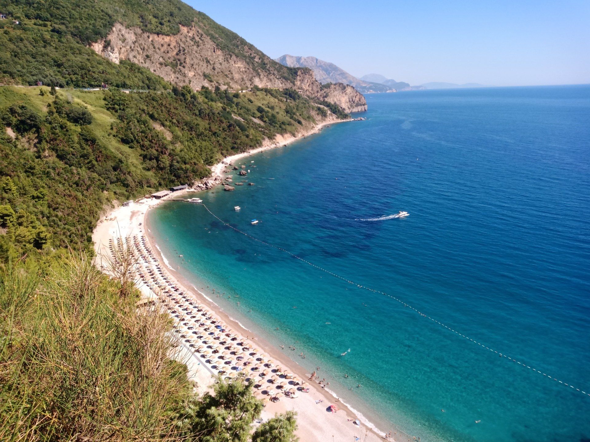 Nachdem wir das Eis aufgeschlabbert haben, fahren wir auch schon wieder weiter. Die Stärkung war genau richtig, denn vor uns lagen nun wieder einige Hügel die erklommen werden wollten. Und so wie es bei einer Küstenstraße immer ist, geht es erst rauf und dann direkt wieder runter. Auf Meereshöhe wieder angekommen, liegt vor uns auch schon direkt die Stadt Budva. Man oh man ist hier viel los. Es herrscht ein regelrechtes chaotisches Gewusel auf der Straße. Auch die Lärmkulisse ist ohrenbetäubend laut. Scheinbar jeder der eine funktionierende Hupe besitzt, nutzt diese auch durchgehend. Naja, was soll´s. Auf ins Getümmel. Was uns gleich auffällt ist, dass alle zu uns ausreichend Abstand halten. Worüber wir auch sehr froh sind. Sie selbst untereinander aber eher weniger. Es wird viel gedrängelt und gehupt. Es ist so viel los auf den Straßen, dass sich vor einer Ampel ein Stau bildet. Zwar zeigt die Ampel rot, aber trotzdem wird fleißig gehupt. Kann ja sein, dass sie dadurch früher auf grün springt. Als es grün wird, bewegt sich nur die linke Spur. Ich lehne mich ein wenig nach rechts, um zu sehen warum unsere Spur nicht fährt. Ein paar Autos vor uns, entdecke ich dann auf dem Bürgersteig Polizei und mehrere Passanten. „Da vorne scheint es mal wieder einen Unfall gegeben zu haben“ sage ich zu Jasmin. Dies hat natürlich zur Folge, dass nun alle versuchen auf die linke Fahrbahn zu kommen. Es wird viel gedrängelt und gehupt. Hinter uns drängt sich auch das Auto auf die linke Spur. Der Wagen dahinter, scheint uns auch nur im letzten Moment zu sehen, denn er hält nur ganz knapp hinter uns an. Er guckt uns nur kurz mit großen Augen an und senkt dann wieder den Kopf, um weiter am Handy zu spielen. „Ok, ich bin dafür das wir erst einmal auf den Fußgängerweg wechseln. Wir können ja hinter der Ampel wieder auf die Straße“ sage ich zu Jasmin und steige von meinem Rad ab, um es den Bordstein hochzuschieben. „Ja, finde ich gut“ antwortet sie und steigt ebenfalls vom Rad ab. Wir schieben unsere Räder an dem Unfall und den Polizisten vorbei und steigen hinter der Ampel wieder auf unsere Räder und fahren auf der Straße weiter. In dem Moment, in dem wir auf die Straße fahren, sehen wir auf der Gegenfahrbahn wie eine Autofahrerin, die auf der linken Spur fährt, von einem anderen einscherenden Auto in die Leitplanke gedrückt wird. Oh man, sind die denn hier alle verrückt oder was? Schießt es mir nur durch den Kopf. Wir fahren schnell weiter, um aus der Stadt zu kommen. Hinter der Stadt geht es dann auch direkt wieder bergauf. Als wir auf eine Haltebucht zufahren, signalisiere ich Jasmin, dass ich hier kurz Pause machen möchte. „Ist das verrückt hier. Das waren jetzt drei Unfälle in noch nicht einmal 30Km“ sage ich zu Jasmin, als wir unsere Räder an der Leitplanke anlehnen. „Ich bin froh, dass sie wenigstens zu uns Abstand halten“ antwortet sie. Während wir Pause machen, schaue ich auf dem Handy nach, wie weit es noch bis zum nächsten Campingplatz ist. „Also der nächste Campingplatz ist ungefähr 7Km entfernt. Sieht auch sehr gut aus“ sage ich zu ihr und zeige ihr die Bilder des Campingplatzes. „Nehmen wir“ antwortet sie. Also schwingen wir uns wieder auf unsere Räder und fahren weiter.