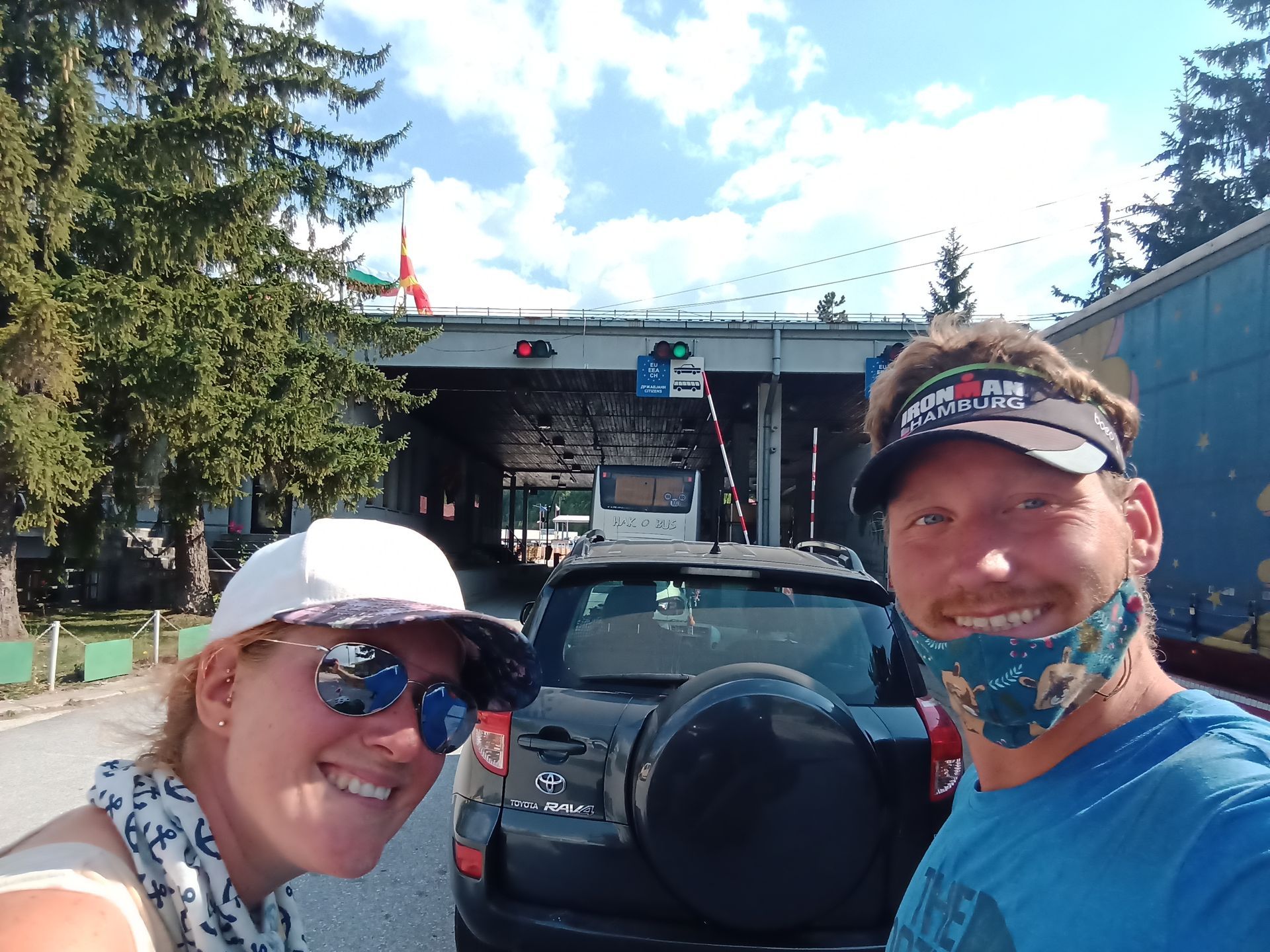 An der Grenze angekommen, stellen wir uns in der Schlange für Pkw´s an. Rechts von uns stauen sich noch einige Lkw´s in der Lkw Spur. Vor uns sind 3 Autos und ein Reisebus, der auch noch rappel voll mit Leuten ist und von denen jeder einzelne durch die Kontrolle muss. Ohje, dass kann dauern. Hinter uns wird langsam die Schlange immer länger. Nach einer ganzen Weile wird dann eine weitere Spur aufgemacht und ein Grenzbeamter winkt bestimmte Autos ran, die zu ihm kommen sollen. Alle vor und und hinter uns werden ran gewunken, wir jedoch nicht. „Ey, was soll das! Komm wir fahren rüber in die Schlange“ sage ich zu Jasmin und rolle auf die andere Spur rüber. Als mich der Grenzbeamte sieht, zeigt er mir an das wir warten sollen. Er spricht mit einem anderen Beamten und zeigt auf uns. Dieser nickt und kommt auf uns zu. Als er bei uns ist, sagt er uns, das wir rechts am Bus vorbei kommen sollen nach vorne. Ich schaue mir die Lücke zwischen Bus und Wand an und sage ihm, dass das nicht passen wird. Darauf hin dreht er sich wortlos um und geht zu dem Kontrollhäuschen für die Lkw´s. Dort spricht er kurz mit einem weiteren Beamten und winkt uns dann ran und deutet auf die Lkw Spur. Wir schieben unsere Räder zwischen den Lkw´s vorbei, nach ganz vorne. Dort empfängt er uns und bittet uns nach unseren Pässen. Ich gebe ihm unsere Pässe und er verschwindet wieder ins Kontrollhäuschen. „Guck mal. Wie viele Leute noch im Bus stehen und warten. Das hätte noch Ewigkeiten gedauert“ sage ich zu Jasmin, während wir auf den Beamten warten. „Ja und guck mal wie viele da vorne schon stehen, die aus dem Bus sind“ antwortet sie mir und nickt in Richtung der stehenden Leute. „Wie viele Leute sind denn in diesem Bus? Da stehen ja mindestens 40 Leute und im Bus locker noch mal genau so viele“ antworte ich erstaunt. So viel zum Abstand halten, denk ich mir nur. Kurz darauf kommt der Grenzbeamte mit unseren Pässen wieder und wünscht uns eine gute Weiterfahrt. So Teil eins geschafft. Jetzt müssen uns nur noch die Bulgaren reinlassen. Keine 100m weiter ist auch schon die Einreisekontrolle nach Bulgarien. Vor uns ist ein Auto mit nordmazedonischem Kennzeichen. Im Auto sitzt ein Mann und eine Frau, sowie ein kleines Kind im Kindersitz. Der bulgarische Grenzbeamte fragt den Mann im Auto immer wieder Sachen. Was wir jedoch nicht verstehen, aber es geht wohl um irgendwelche Papiere, denn die Frau reicht dem Mann immer mehr Zettel, die er dann an den Beamten weitergibt. Dann verschwindet der Beamte mit den ganzen Zetteln in das Kontrollhäuschen und ruft kurz danach den Mann aus dem Auto zu sich. Dieser steigt aus und geht zum Kontrollhäuschen. Dort diskutieren die beide eine ganze Weile. Währenddessen telefoniert die Frau im Auto und scheint zu weinen. Der Mann läuft immer wieder zwischen seiner Frau und dem Kronrollhäutchen hin und her. Diese ganze Szenerie macht ja schon mal richtig Mut. Das wird gleich spaßig. Nach einer Weile steigt der Mann dann wieder ins Auto und darf wohl weiterfahren. Ok, jetzt sind wir dran. Am Kontrollhäuschen begrüßen wir den Beamten und reichen ihm unsere Pässe. Er begrüßt uns ebenfalls und stellt uns ein paar Fragen. Wo kommt ihr her? Wo wollt ihr hin? Ah, aus Deutschland. Ok. Zwei Minuten später haben wir auch schon unsere Pässe wieder und können weiter. Na bitte, geht doch. Nun folgt anscheinend noch eine Zollkontrolle. Vor uns ist wieder die Familie von eben. Ein recht mürrisch drein schauender Beamter befragt den Mann erneut und fordert ihn auf auszusteigen und den Kofferraum zu öffnen. Nach einem kurzen Blick in den Kofferraum verweist er den Man auf einen extra Parkplatz, für eine genaue Durchsuchung. Ohje die armen. Die haben es echt nicht leicht. Flüstern wir einander zu. Nachdem die Familie weggefahren ist, winkt uns der Beamte ran. Ok, jetzt sind wir dran. Wir werden schroff mit dem Wort „Ausweis“ begrüßt. Ich reiche ihm unsere Pässe. Er schaut sich die Pässe an und fragt „Von wo seid ihr?“. Deutschland, antworte ich ihm. Er klappt die Pässe zu, begutachtet unsere Räder und sagt darauf hin „Ok. Weiter“ und reicht uns die Pässe. Wir sagen noch Danke und Aufwiedersehen, bekommen aber nur ein schnelles „Ja“ als Antwort. Naja, Hauptsache wir sind drinnen. Hinter der Kontrolle ist ein kleiner Pauseplatz mit einem Toilettenhäuschen. Wir stellen unsere Räder ab und ich gehe kurz auf die Toilette. Als ich wieder komme, futtern wir noch ein paar Kekse. Währenddessen hält neben uns ein Transporter an und drei Männer laden einen Roller ab. Als wir zu unseren Rädern gehen und weiter fahren wollen, fragt uns einer der Männer ob sie uns mit nach Sofia nehmen sollen. Wir sagen ihnen das das zwar sehr nett ist, aber dass wir nicht Richtung Sofia fahren. Wir satteln auf und fahren weiter. Zum Glück geht es jetzt erst einmal wieder ein Stück bergab. Da es schon später Nachmittag ist, halte wir nach einem Schlafplatz Ausschau. Auf einer großen Wiese abseits der Straße werden wir dann auch fündig. Zur Straße hin stehen mehrere große Bäume. Somit werden wir nicht von der Straße aus gesehen. Schnell noch etwas zu essen kochen und dann ab ins Bett.