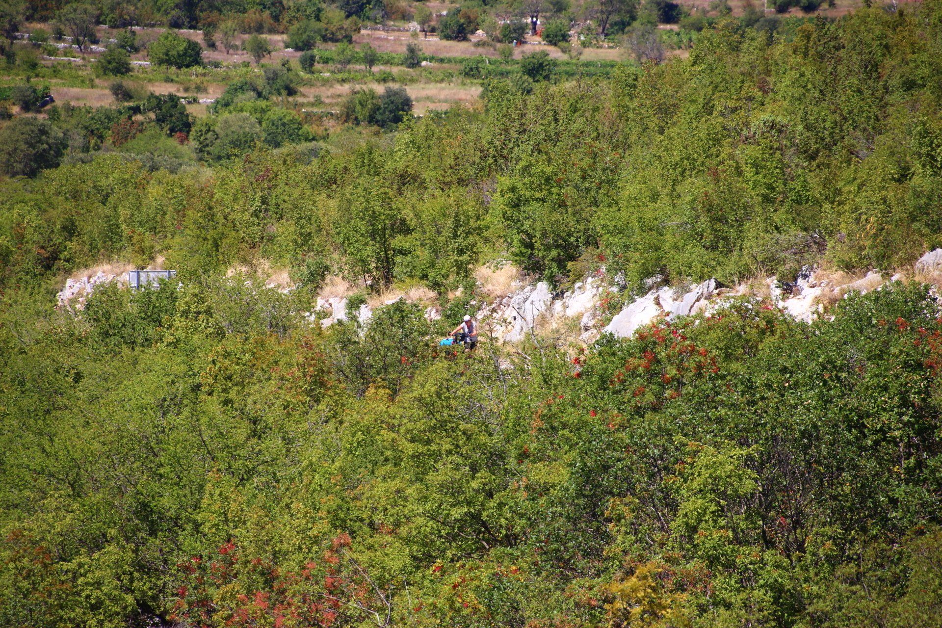Oben angekommen, empfängt mich ein kleiner Rastplatz mit zwei Bänken. Ich stelle mein Rad auf Seite und warte auf Jasmin. Wenig später kommt sie auch oben an. „Yeah, fast geschafft. Nur noch 2Km, dann geht es abwärts Richtung Split“ empfange ich sie. „Echt jetzt? Es geht noch weiter hoch?“