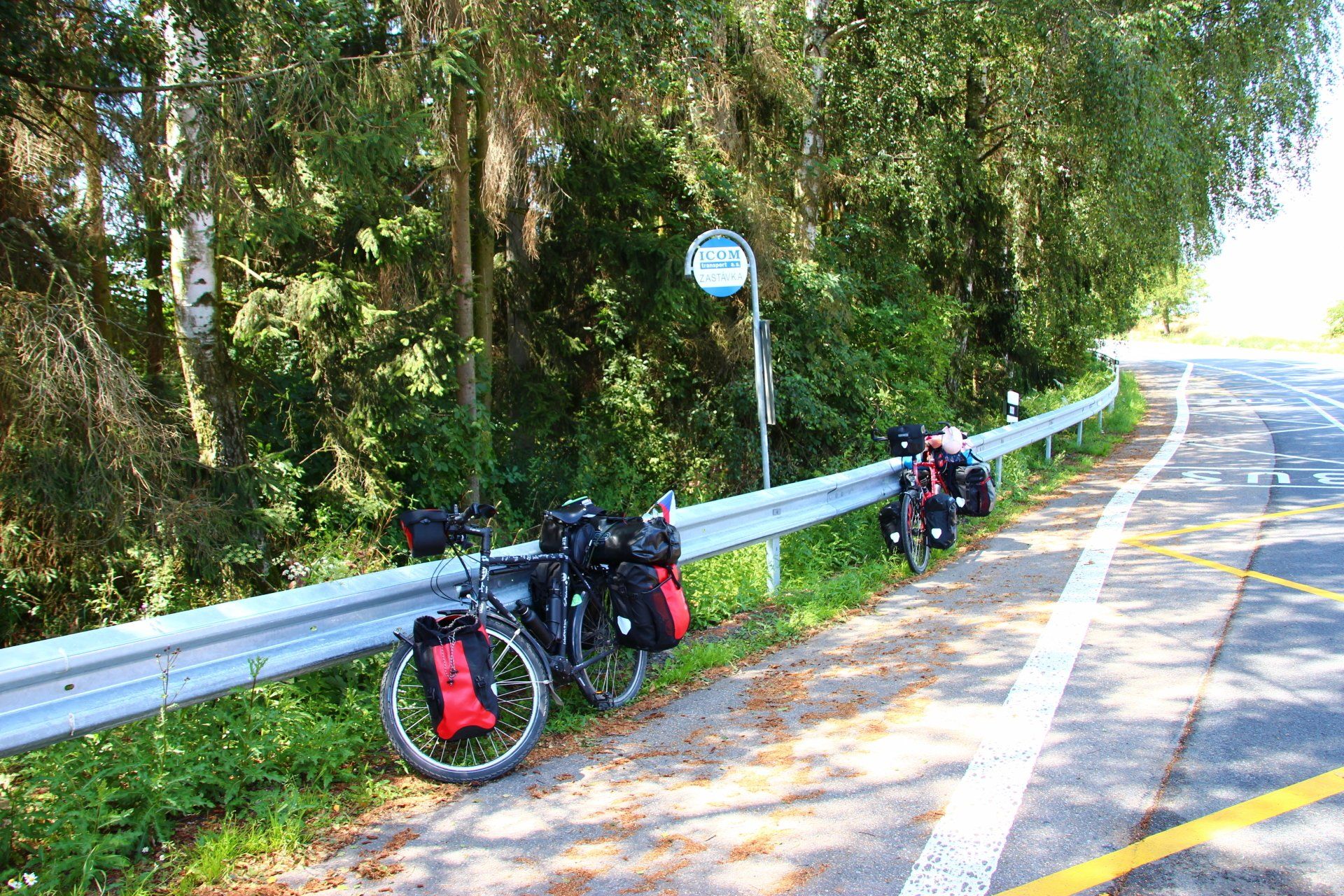 Denn nach dem wir aus Pilgrim raus waren, kamen eine ganze Weile links und rechts neben der Straße nur Felder. Hier hätte wir nichts gefunden. Kurz vor der Ortschaft Třešt, taucht eine Tankstelle auf, die ein paar Sitzgelegenheiten mit Sonnenschirmen an der Seite stehen hat. „Sollen wir da mal eine Pause machen? Dann kann ich dort auch ein wenig am Laptop arbeiten“ ruft Basti mir zu und deutet auf die Tankstelle. „Ja gerne“ antworte ich ihm. An den Sitzbänken angekommen, schlage ich Basti vor, dass wir uns ja ein kleines Eis gönnen könnten. Er findet die Idee super. Also gehe ich rein und suche uns zwei leckere Eis am Stiel aus, während er am Laptop anfängt zu arbeiten. Nach dem Eis nutzen wir noch die vorhandene Toilette, um am Waschbecken unsere Wasservorräte wieder aufzufüllen. Nach ungefähr 2 Stunden fahren wir wieder weiter. Als es auf den Abend zu geht, fangen wir an nach einem Schlafplatz Ausschau zu halten. Wir entdecken einen kleinen Feldweg, der vielversprechend aussieht. Basti geht mal nachschauen. Nach ein paar Minuten kommt er wieder. „Sieht gut aus. Sollte gehen“ sagt er. Wir schwingen uns wieder auf unsere Räder und folgen dem Feldweg ungefähr 300 Meter.