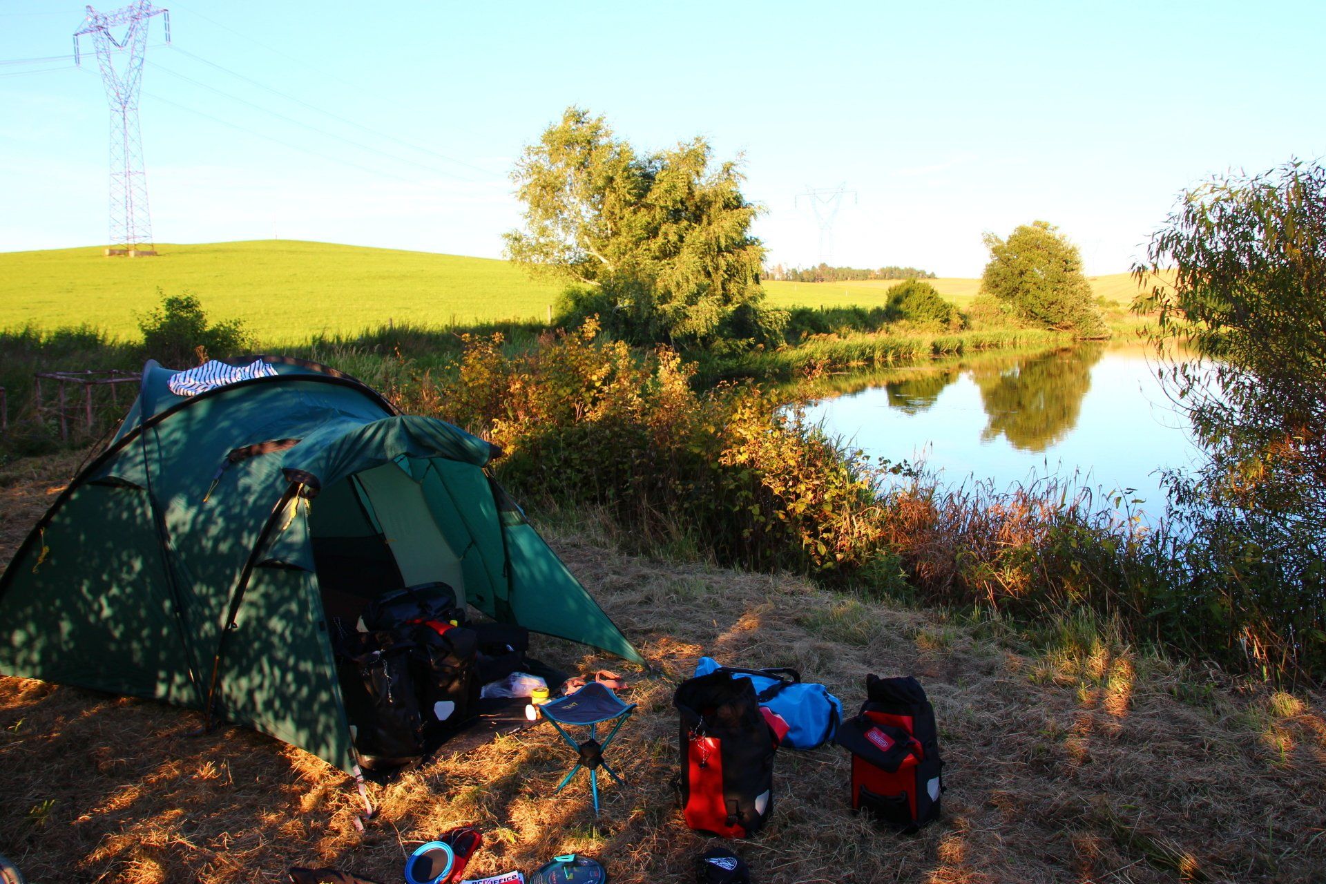 „Hier links“ sagt er und biegt ab. Nach ungefähr 30 Metern endet der kleine Pfad auf einer kleinen Wiese. Rechts ist ein See und links etwas tiefer gelegen ein Weizenfeld. Basti bleibt stehen und dreht sich zu mir um und sagt „Hier ist doch gut oder? Leider kommt man nicht zum Wasser wegen der ganzen Dornenbüsche, aber man kann uns nicht von der Straße aus sehen. Eine Festivaldusche tut es heute auch“. „Ja, find ich gut“ antworte ich ihm und steige vom Fahrrad.Wir bauen unser Zelt auf und kochen noch etwas zum Abendessen. Bevor es zu Bett geht, gibt es noch eine Festivaldusche.