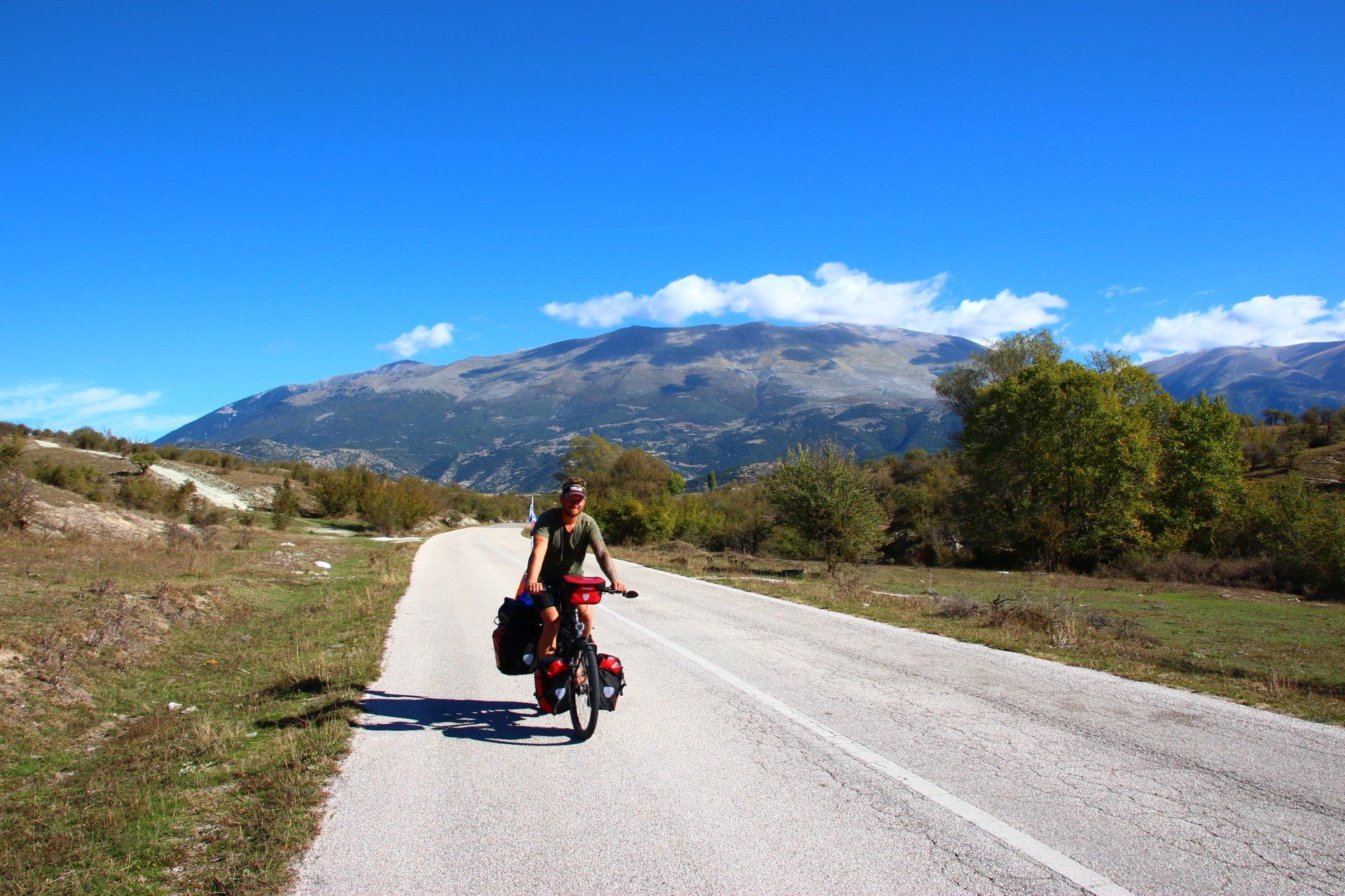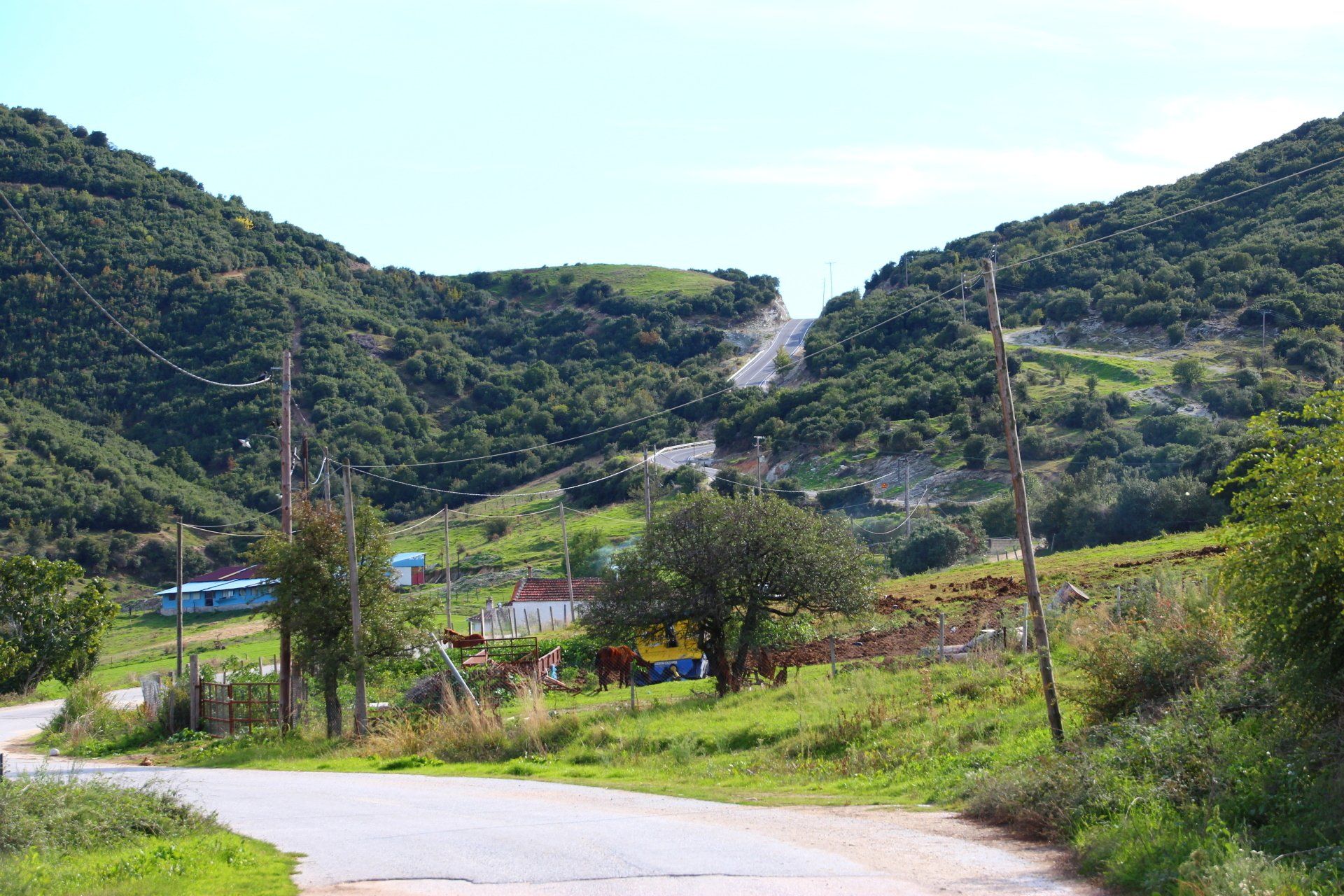 Sanft wurden wir wieder früh am Morgen von den Brüllkühen geweckt. Heute lassen wir das Frühstück vorerst ausfallen. Nach dem aufstehen packen wir alles zusammen und rollen weiter den Olymp hinab, bis wir wieder in der kleinen Ortschaft Καλύβια (Kalyvia) ankommen. Hier machen wir Halt an einem kleinen Dorfplatz, der direkt gegenüber des kleinen Lebensmittelgeschäftes ist. Wir stellen unsere Fahrräder an einer der Bänke ab und gehen in den Laden. Kurze Zeit später kommen wir mit frischem Brot, Marmelade und Schokoladenaufstrich wieder heraus. Während ich unsere Messer auspacke, füllt Basti an einem kleinen Brunnen mit Wasserhahn unsere Wasservorräte wieder auf. Nachdem er damit fertig ist, wird gefrühstückt. Während wir am frühstücken sind, fällt Basti auf, dass sein Hinterrad ziemlich platt ausschaut. „Scheinbar habe ich ein kleines Loch im Reifen. So ein Mist, dass heißt wohl nach dem Frühstück flicken“. Gesagt getan. Nach dem Frühstück macht er sich an die Reparatur. Während er das Hinterrad am ausbauen ist, fangen die Kirchenglocken der Kirche, die sich ebenfalls direkt am Dorfplatz befindet, an zu läuten. Wenige Minuten später kommen mehrere Leute aus der Kirche raus. Mensch, die sind aber alle schick gekleidet, denke ich mir. Wenig später ist Basti auch fertig und sein Rad wieder einsatzklar. „So fertig“ sagt er und klatscht in die Hände. Während er anfängt sein Fahrrad wieder zu beladen, kommt der Priester aus der Kirche. Er bleibt auf unserer Höhe stehen und begrüßt uns mit einem Lächeln und auf deutsch mit den Worten „Guten Tag. Seid ihr aus Deutschland?“. „Ja“ antworten wir ebenfalls mit einem Lächeln. Wir unterhalten uns eine Weile freundlich mit ihm. Dabei erzähl er uns, dass er einige Jahre in Frankfurt gelebt hat und deswegen recht gut deutsch spricht. Außerdem ist er interessiert an unserer Weiterreise und fragt uns allerhand Dinge. Schließlich verabschieden wir uns voneinander und bekommen sogar noch zum Abschied seinen Segen für eine gute und gesunde Weiterreise. „Ja Mensch. Da kann ja jetzt eigentlich nichts mehr schief gehen“ sagt Basti zu mir, während er sich auf sein Fahrrad schwingt. Weiter geht es. Unser nächstes Ziel sind die berühmten Klöster in Meteora. Da wir nicht die Hauptverkehrsstraße nehmen wollen, fahren wir einmal auf kleinen Nebenstraßen durch das griechische Hinterland. Dabei kommen wir hin und wieder durch kleine Dörfer oder an allein stehenden Bauernhäuser vorbei. Die meiste Zeit sind wir jedoch komplett alleine unterwegs.