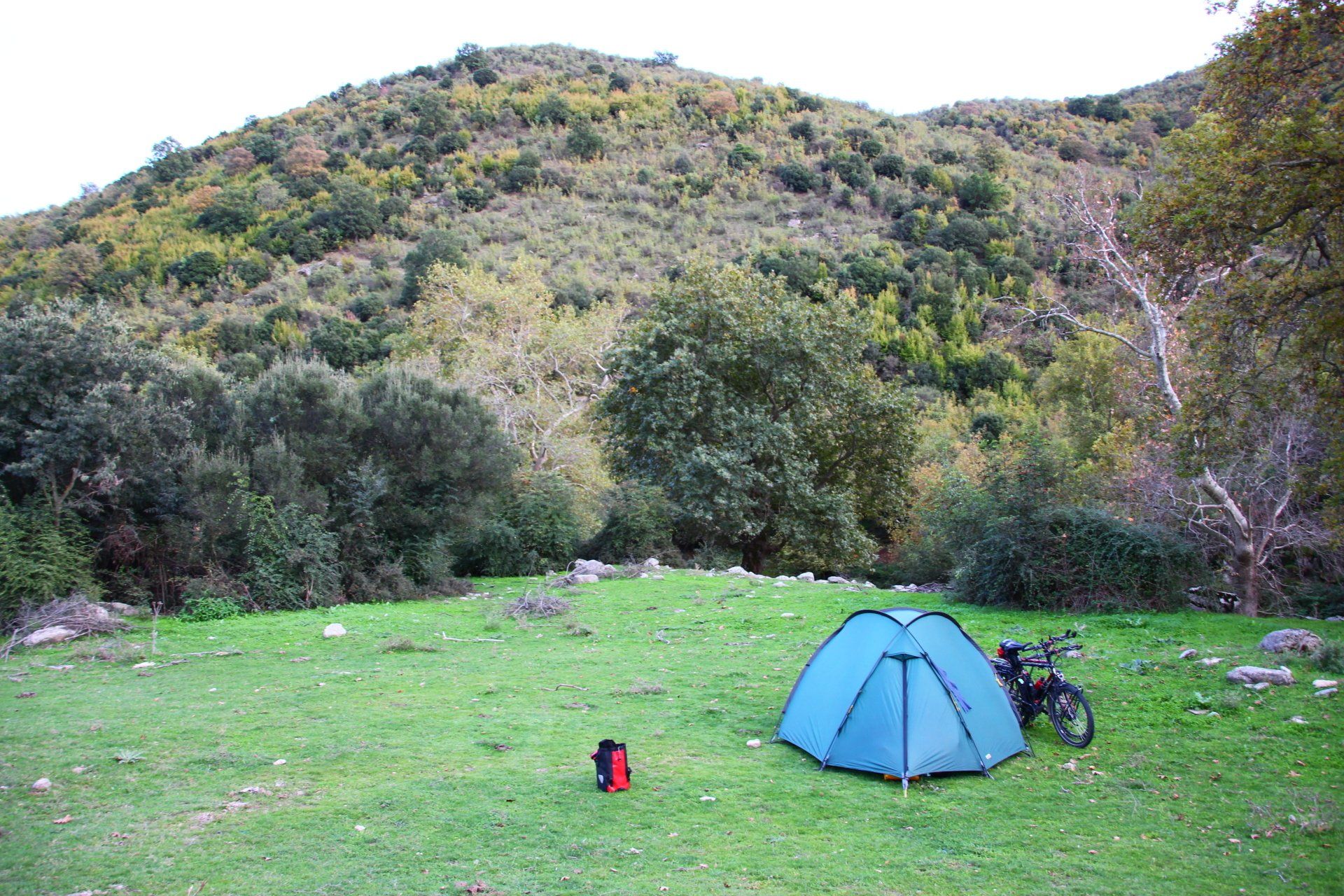 Vor uns liegt eine grüne hügelige Landschaft. Auf einer fast nagelneuen und kurvenreichen Straße sausen wir durch das grüne Tal. Da es langsam auf den Abend zu geht, entscheiden wir uns dafür, ab sofort Ausschau nach einem Schlafplatz zu halten. Die nagelneue Straße endet abrupt nur wenige Kilometer an einer T-Kreuzung. Nach links führt eine alte Nebenstraße, die wiederum zur Hauptverkehrsstraße führt. Sie verbindet Larisa und Trikala und führt schließlich nach Meteora. Nach rechts führt uns unser Weg auf einer Schotterpiste einmal quer durch das griechische Hinterland. Also auf ins Abenteuer. Aber heute wollen uns die Hunde wohl scheinbar einfach nicht in Ruhe lassen. Nachdem wir schon eine ganze Weile der Schotterpiste gefolgt sind, werden wir von der nächsten Hundemeute angefallen. Nur diesmal sind sie zu mindestens 16 und auch deutlich größer (mehrere Doggen und andere Hirtenhunde). Außerdem sehen sie ganz schön fies aus. Sie sabbern stark beim bellen und einige haben gruselige blutunterlaufene Augen. Auch dieses mal kommen sie wieder bis auf wenige Zentimeter an uns heran. Oh man ey! Lasst uns doch einfach in Ruhe. Nach einer ganzen Weile lassen sie dann zum Glück von uns ab. Neben der Schotterpiste entdecken wir dann eine super Wiese, die geradezu zum Campieren einlädt. „Hier wäre super. Die Hunde sind zwar nicht wirklich weit entfernt, aber es wird bald dunkel und hier in der hügeligen Landschaft wird es auch nicht wirklich leicht etwas zu finden“. Wir schieben unsere Räder von der Schotterpiste runter und zu der Grünfläche. Wir entscheiden uns dafür, erst einmal etwas zu essen zu kochen und die Lage noch etwas im Auge zu behalten. Zwar sind wir von der Schotterpiste direkt einsehbar, aber Autos haben wir schon länger keine mehr gesehen. Auf der Wiese liegen vereinzelt mal hier mal dort Kuhfladen umher. Vielleicht bekommen wir in der Nacht sogar Besuch von Kühen. Als dann doch ein kleiner Milchlaster an uns vorbei fährt, folgen ihm bellend die Hunde von vorhin. Als sie uns bemerken, lassen sie von dem Lkw ab und bleiben auf der Schotterpiste stehen und bellen nun uns wieder an. Nach einer Weile hören sie aber auf zu bellen und laufen wieder zurück. „Na hoffentlich lassen sie uns jetzt in Ruhe“ sage ich zu Basti. Nach dem essen bauen wir unser Zelt auf und legen uns schlafen. Auf eine Gute und hoffentlich ruhige Nacht.